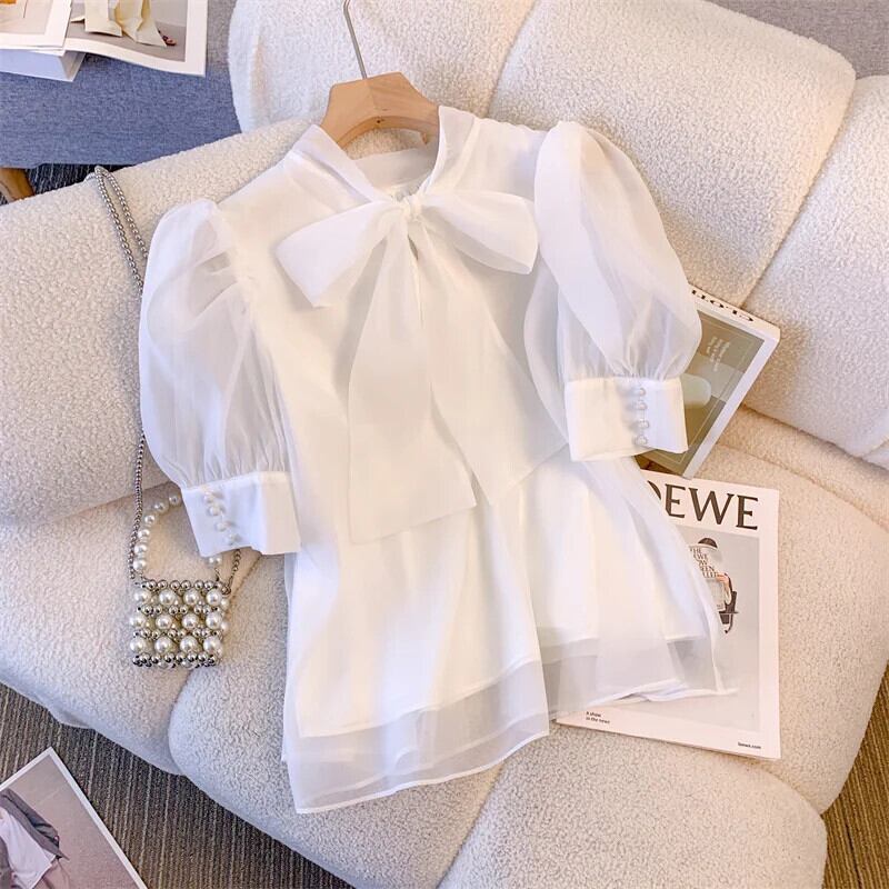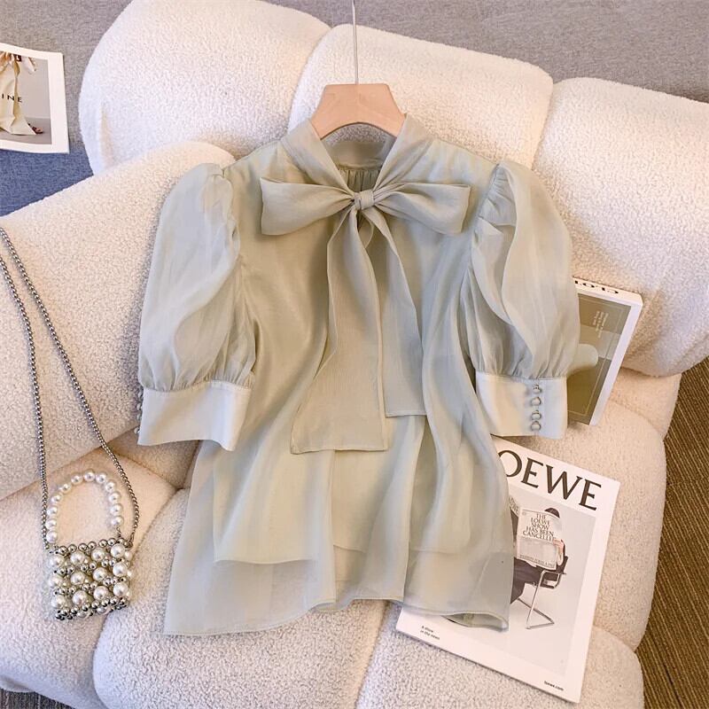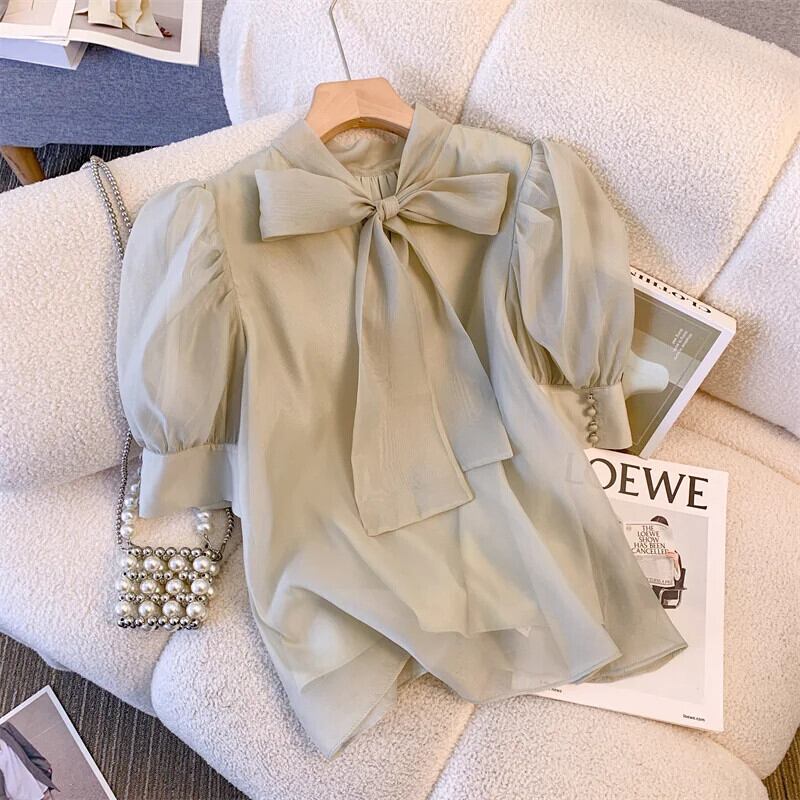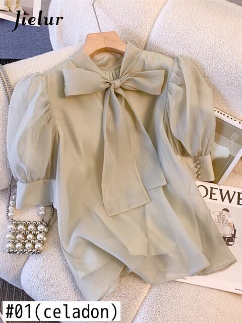 送料無料 Jielur 夏スリムソリッドカラーの女性ブラウス Bownot ブラウス白グレーグリーンシンプルな長袖トップ ロング ホワイト リボン サマー 夏物 AE12188787878239296085