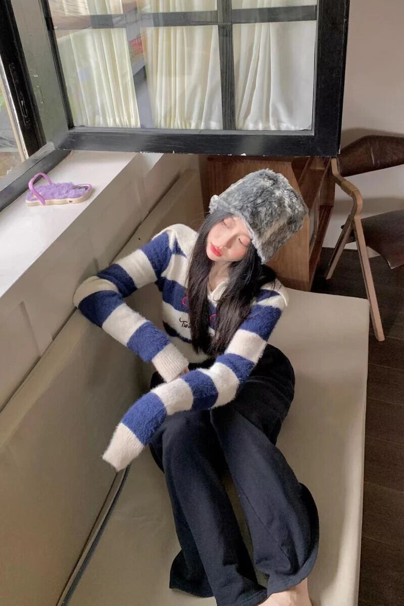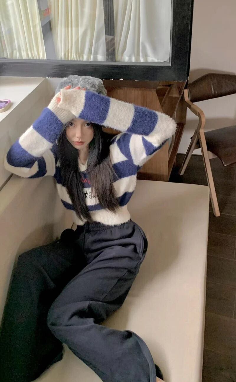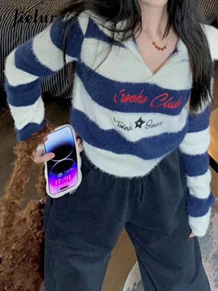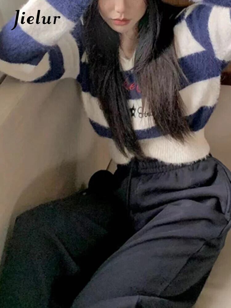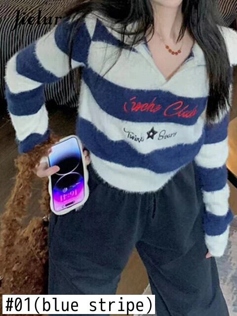 送料無料 Jielur 秋のストライプスリムプルオーバー女性甘いセクシーなコントラストカラーの女性プルオーバーブルーストリートシックなプルオーバー 大人ガーリー スウィート キュート カジュアル オータム 秋物 AE1218878785809784080