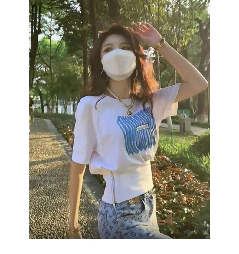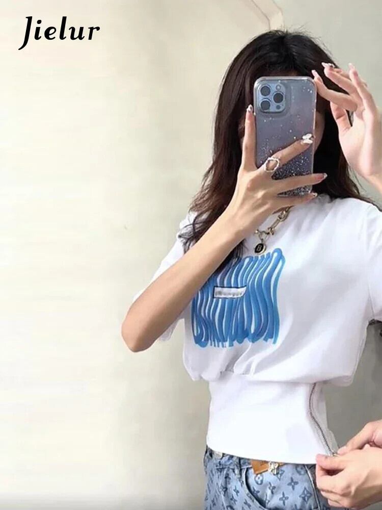 送料無料 Jielur 夏ルーズスリム女性の Tシャツベーシックシンプルな Tシャツ女性白黒青ジッパーフライトップ ホワイト ブルー ブラック サマー 夏物 AE12188787866694962879