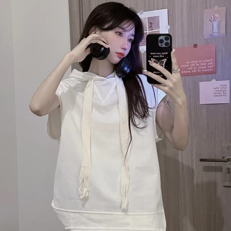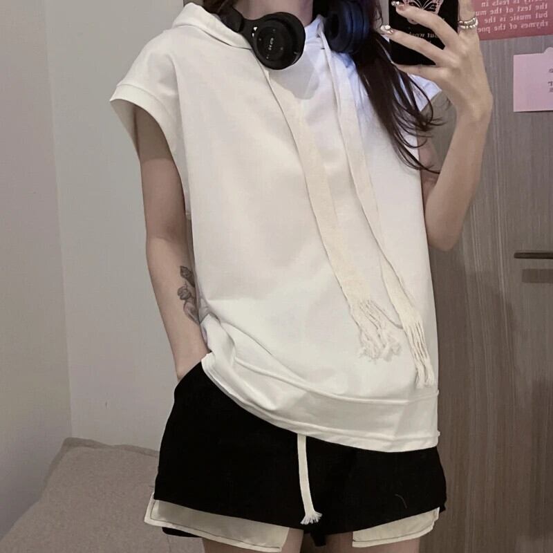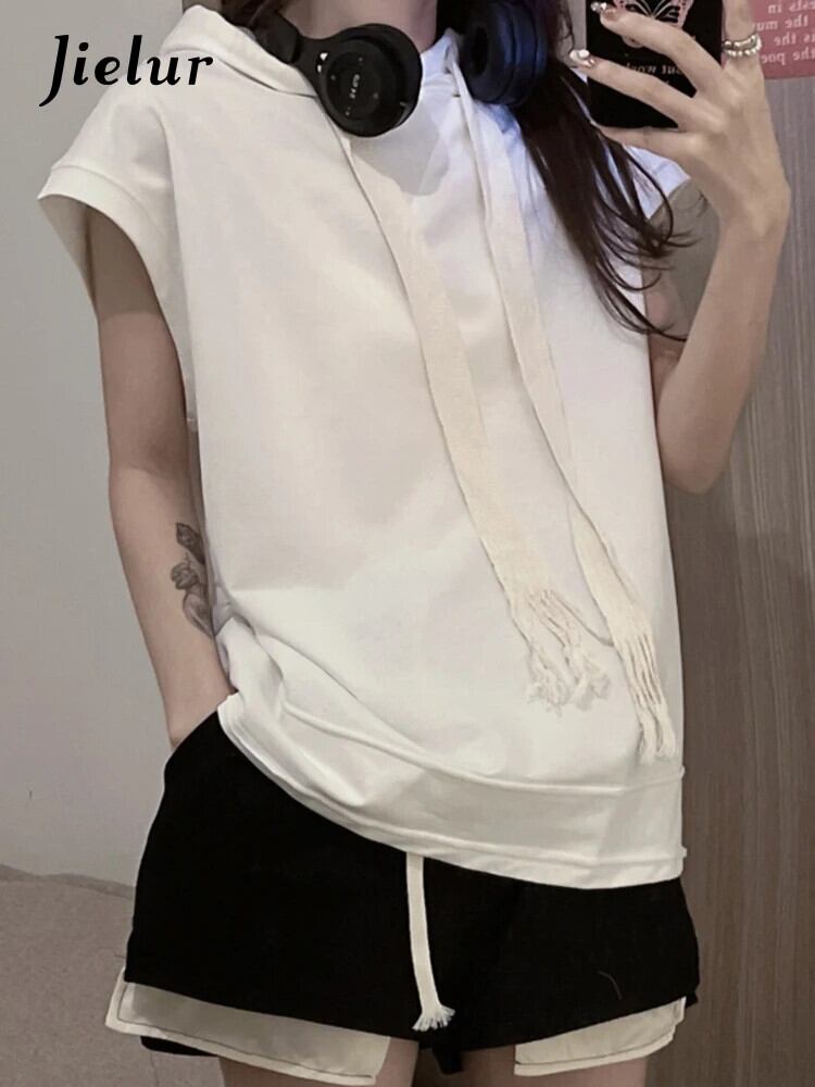 送料無料 Jielur 夏ノースリーブ白パーカー女性ルーズプルオーバートップスヴィンテージ黒パーカーストリート ホワイト ブラック サマー 夏物 ビンテージ AE12188787831688148619