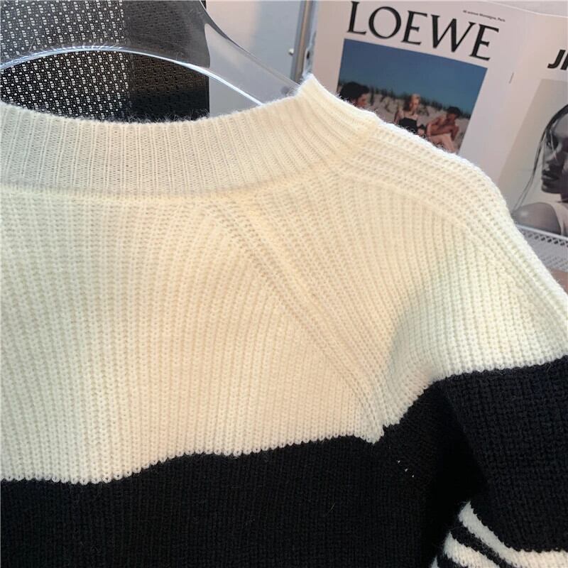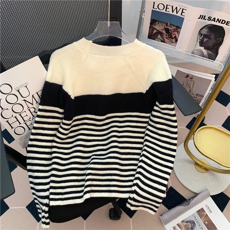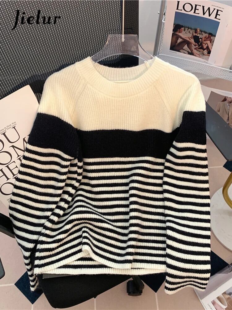 送料無料 Jielur O ネックの女性のセータールーズプルオーバーカシミヤヴィンテージ長袖ストライプニットセーター女性ルーズ底トップシック ロング Oネック ビンテージ AE12188787874167360146