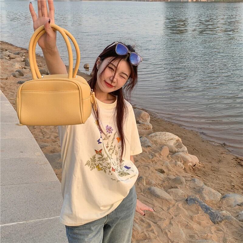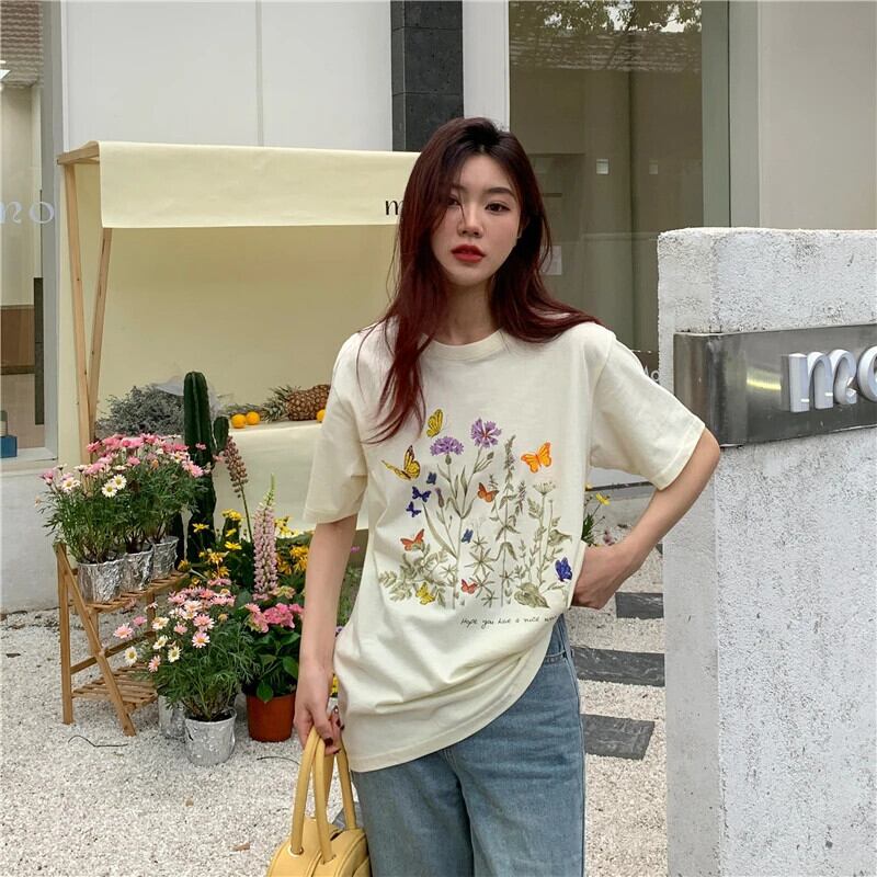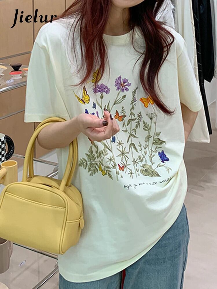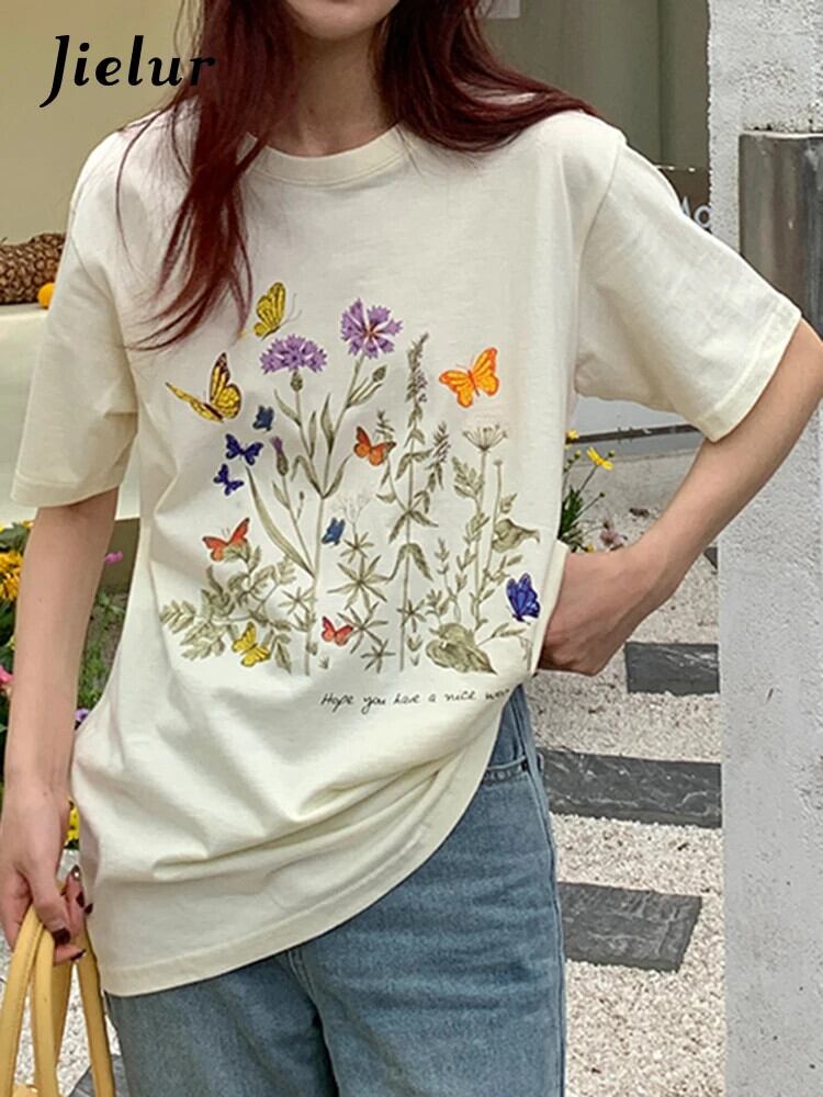 送料無料 Jielur ルース原宿レディース Tシャツ綿ルーズアプリコット Tシャツ人格フラワープリント半袖 Tシャツ ショート コットン ハーフスリーブ かわいい フラワーデザイン AE12188787877338772643