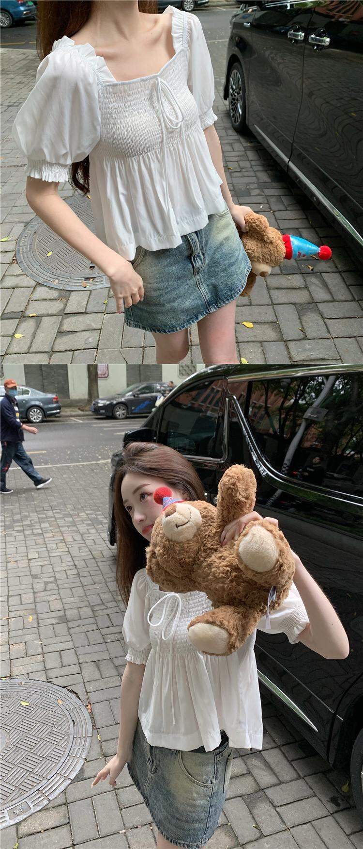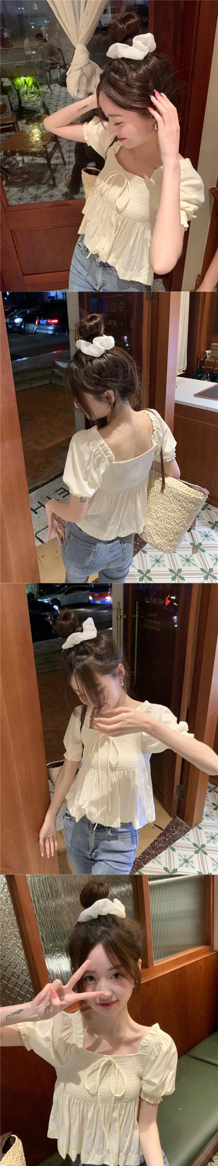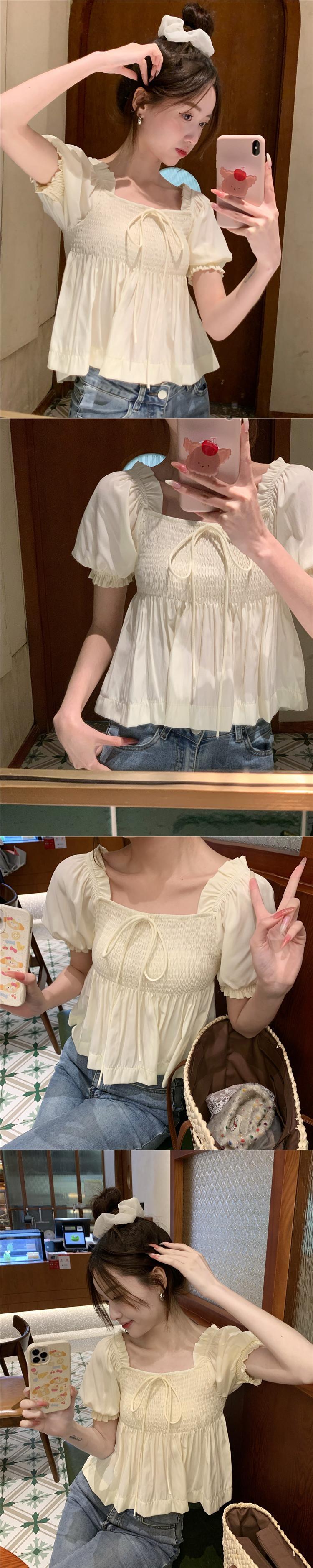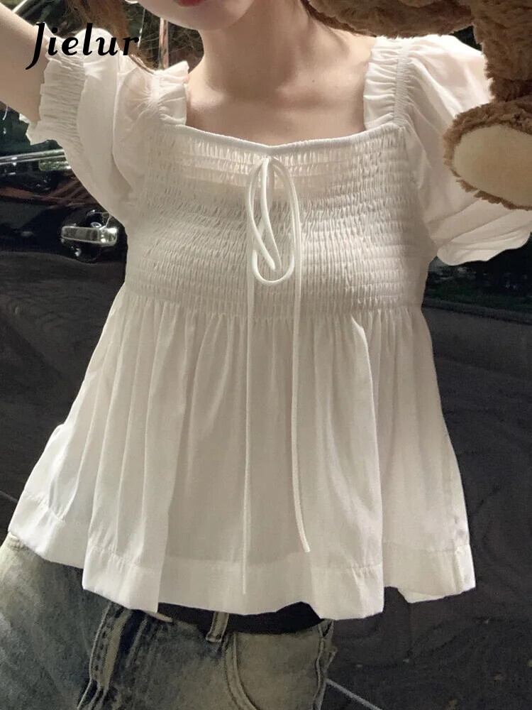送料無料 Jielur 夏フレンチスリム女性ブラウスルーズレースアップ甘いブラウス女性白アプリコットシックなパフスリーブトップ ホワイト 大人ガーリー スウィート キュート カジュアル サマー 夏物 AE12188787831720398997