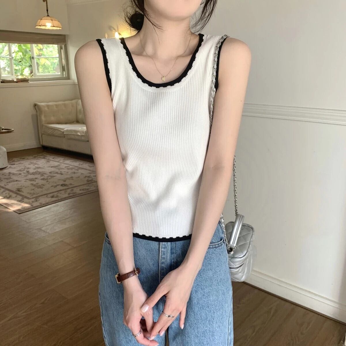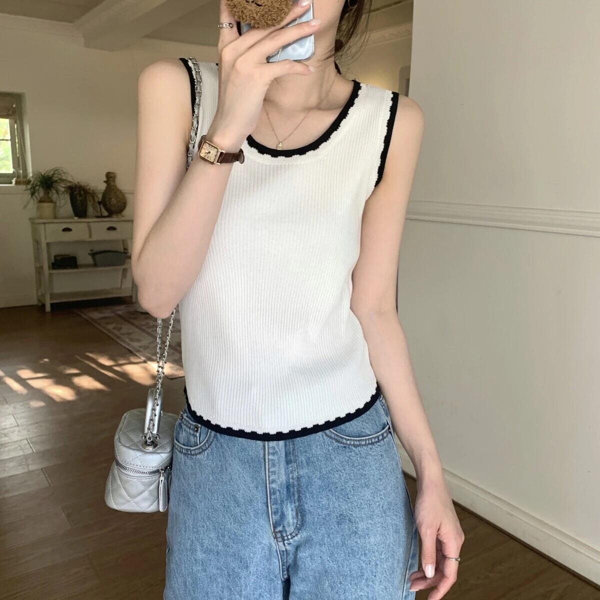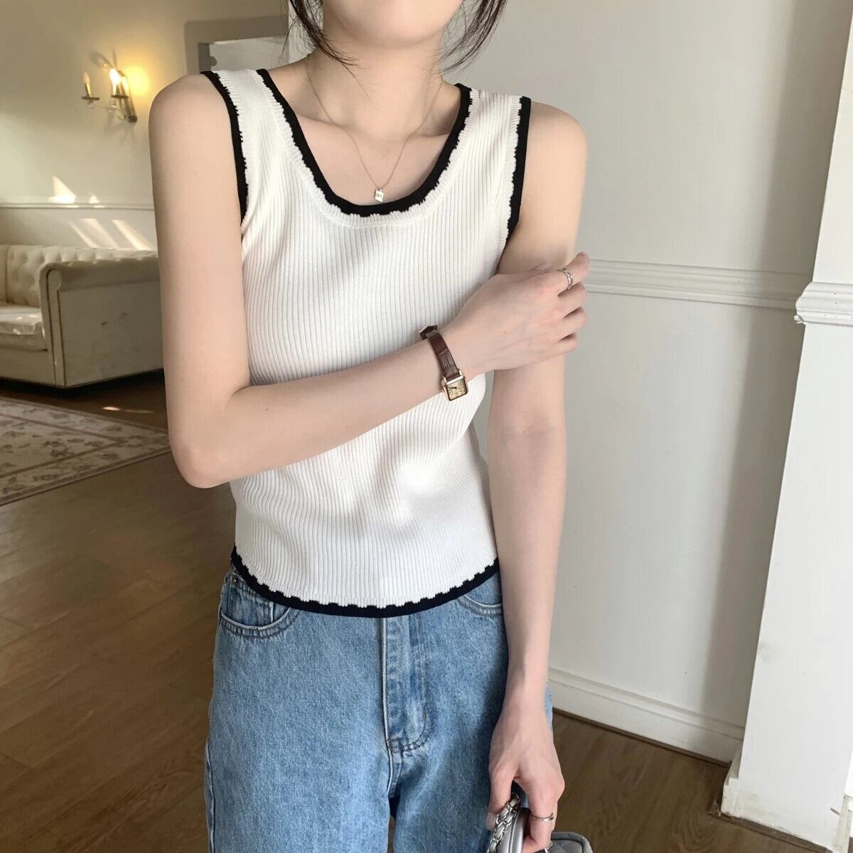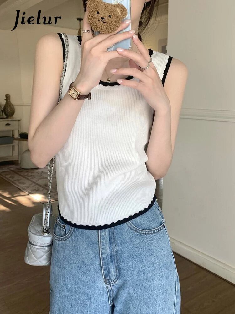 送料無料 Jielur 夏スリムコントラストカラーの女性のタンク甘いニットタンク女性黒、白のノースリーブトップ ホワイト ブラック 大人ガーリー スウィート キュート カジュアル サマー 夏物 AE12188787832475336914
