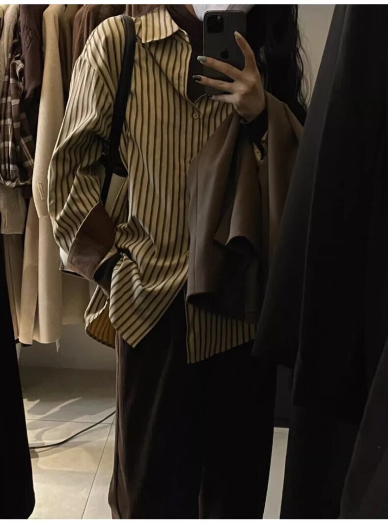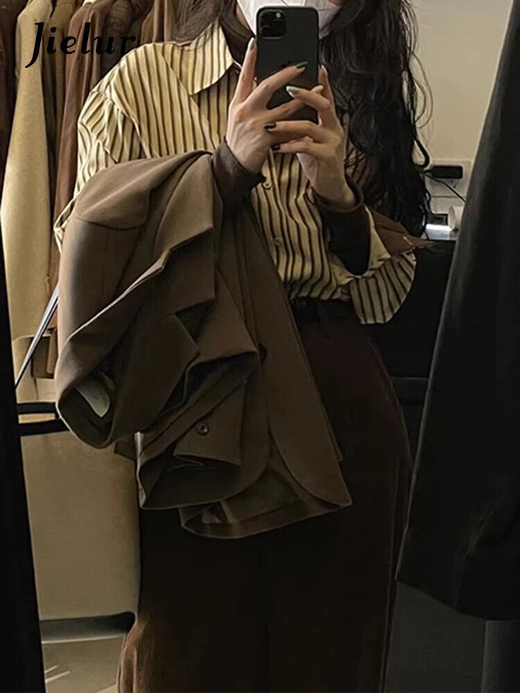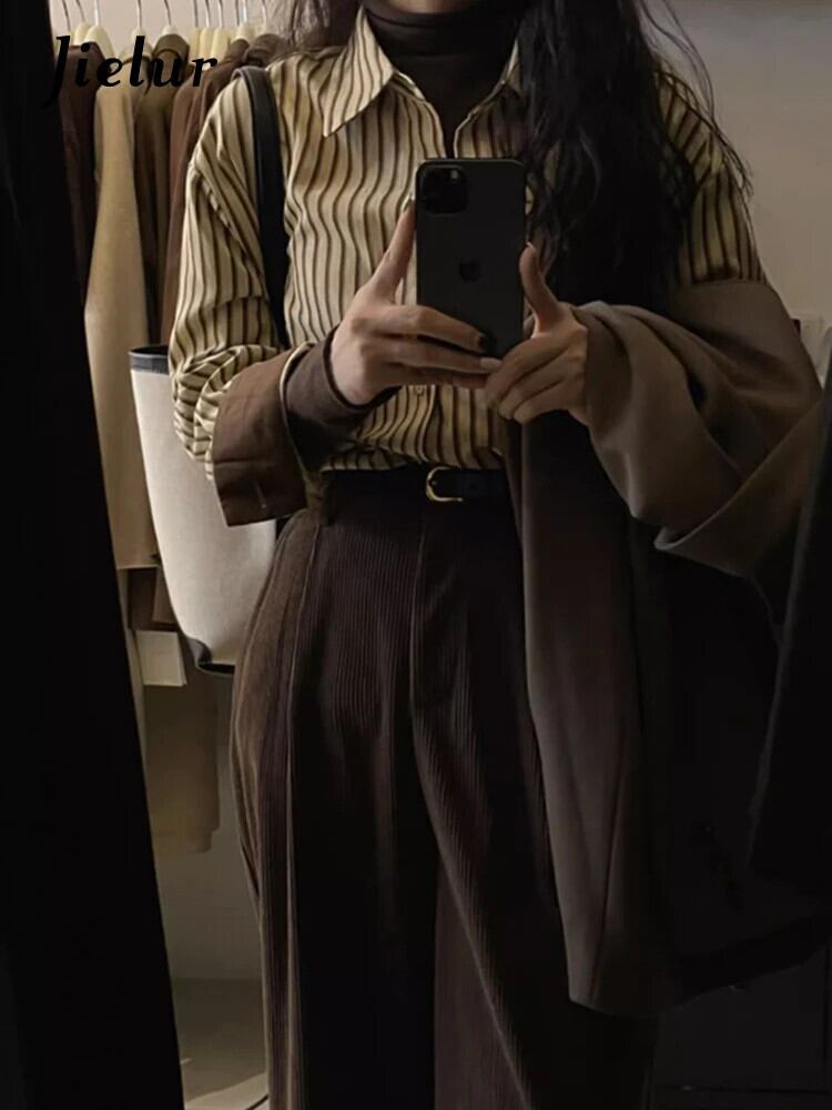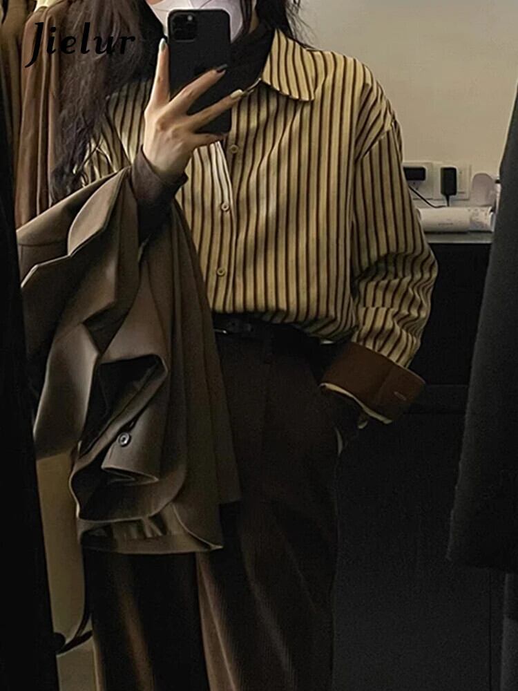 送料無料 Jielur レトロストライプ長袖女性シャツ春ルーズ Chicly 女性シャツシンプルなベーシックスリムトップ ロング スプリング 春物 AE12188787852825095830