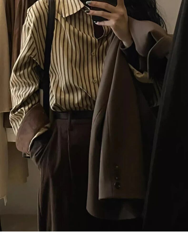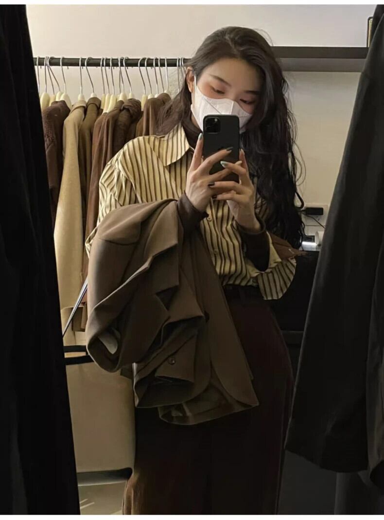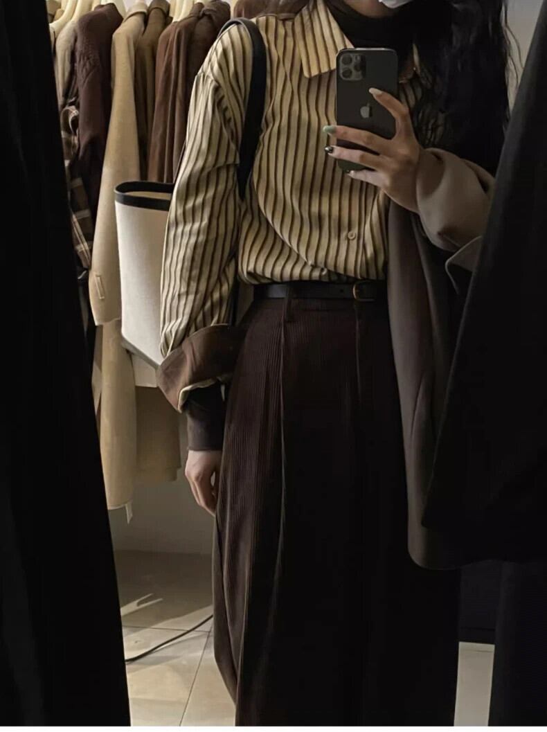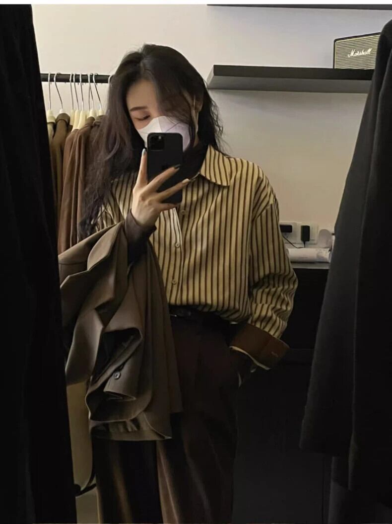 送料無料 Jielur レトロストライプ長袖女性シャツ春ルーズ Chicly 女性シャツシンプルなベーシックスリムトップ ロング スプリング 春物 AE12188787852825095830