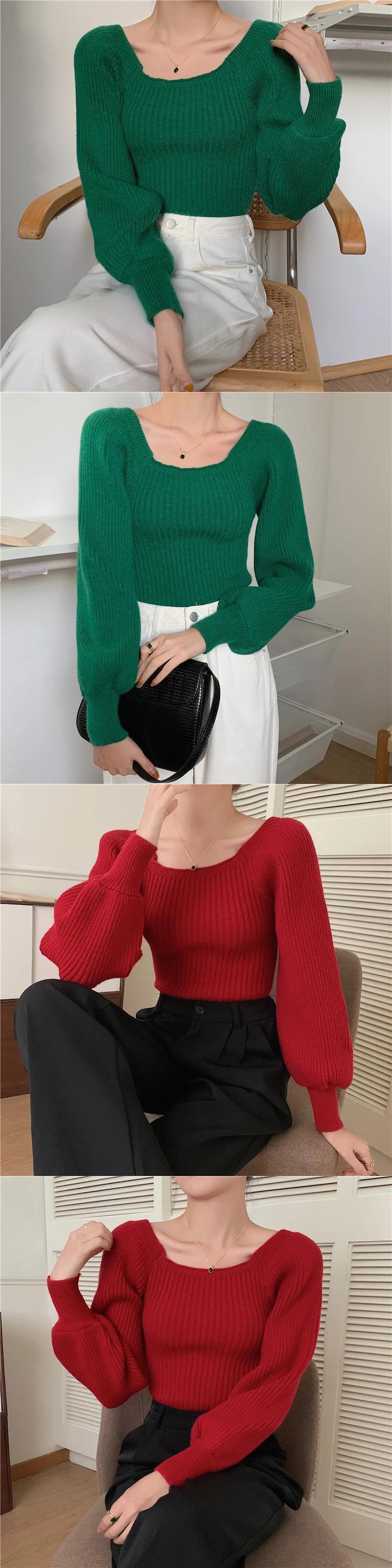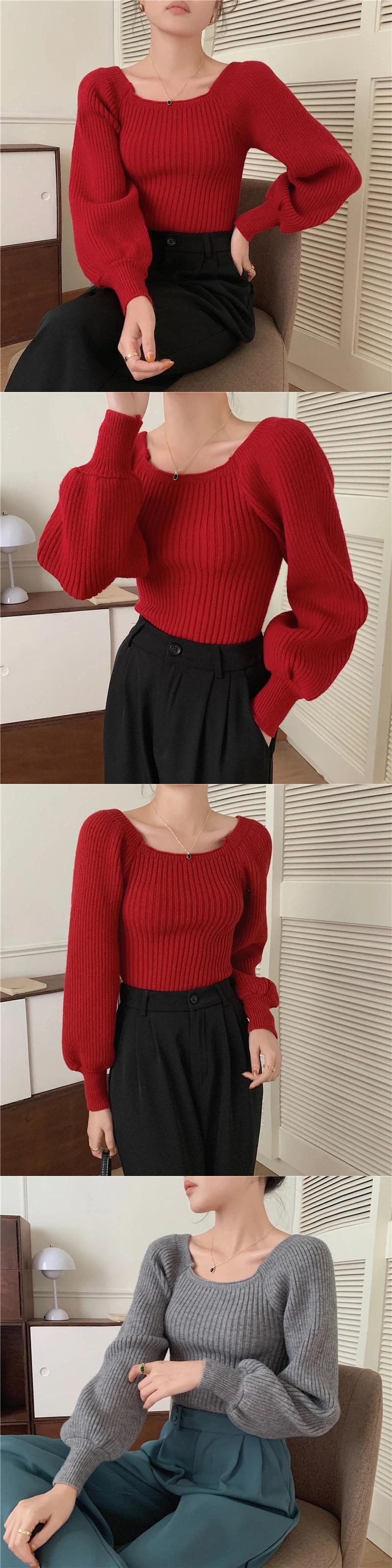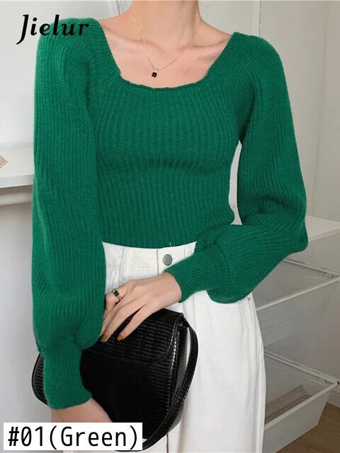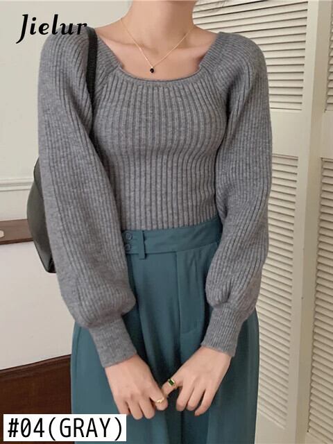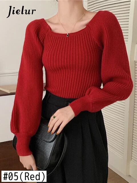 送料無料 Jielur ソリッドカラーニット女性のセーターヴィンテージプルオーバーランタンスリーブスクエアネックベーシックトップセーター秋 オータム 秋物 スクウェア ビンテージ AE12188787864341515937