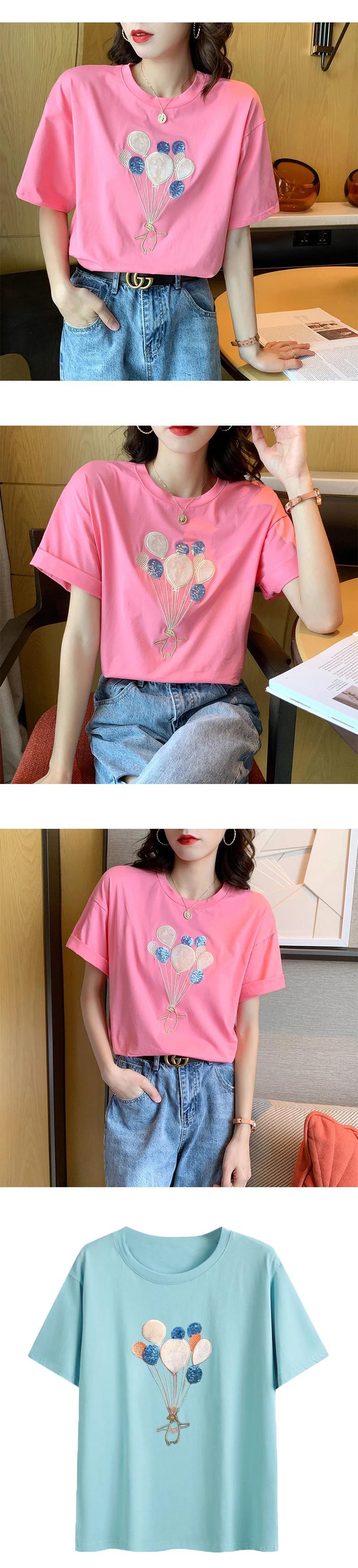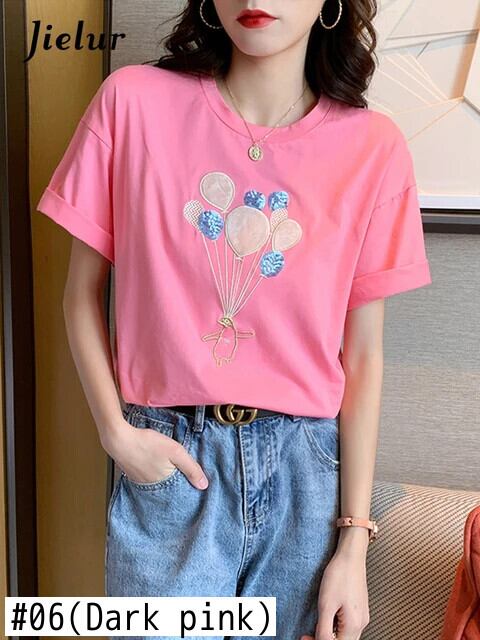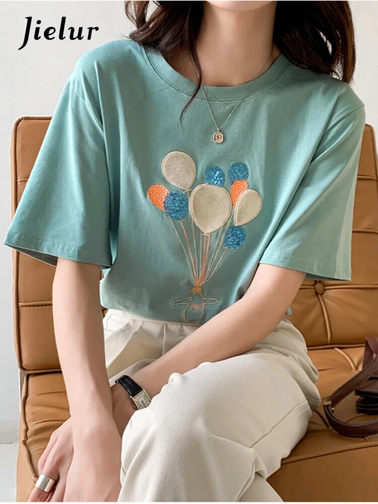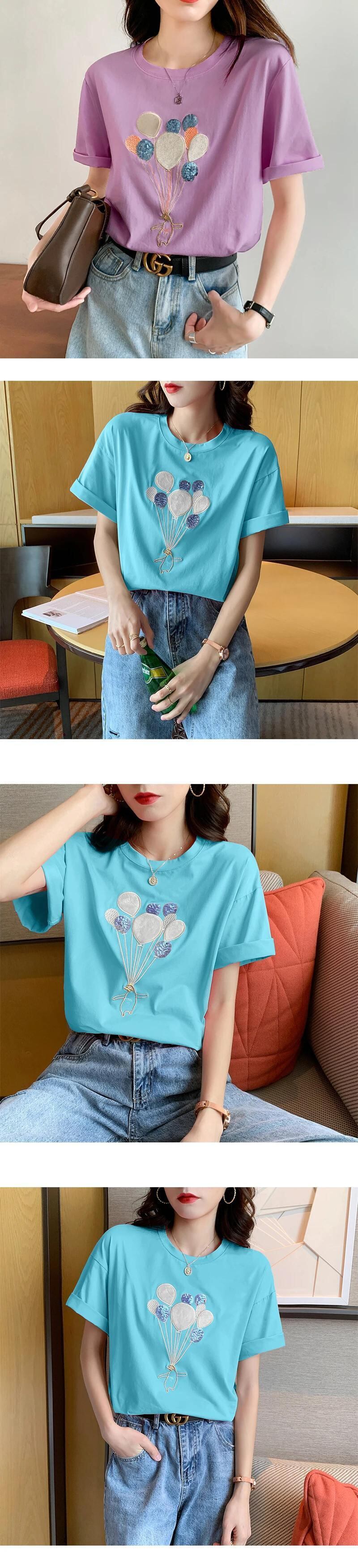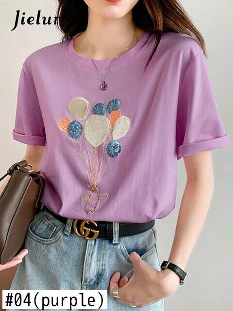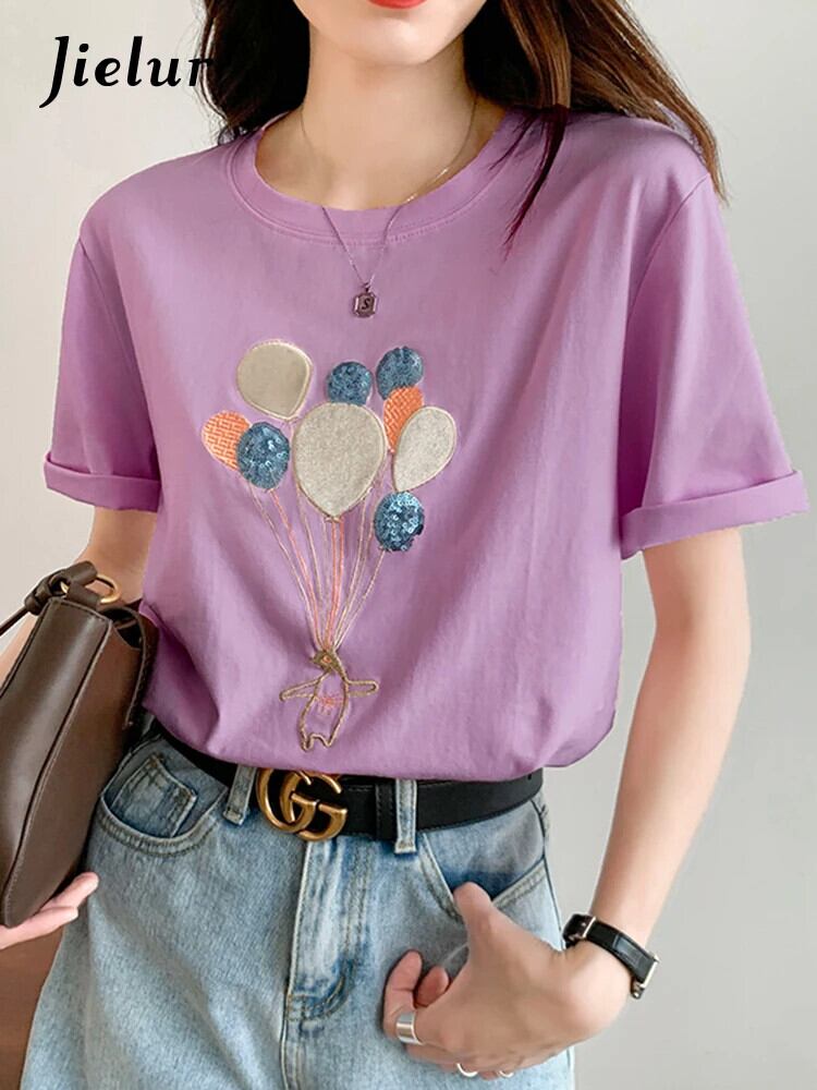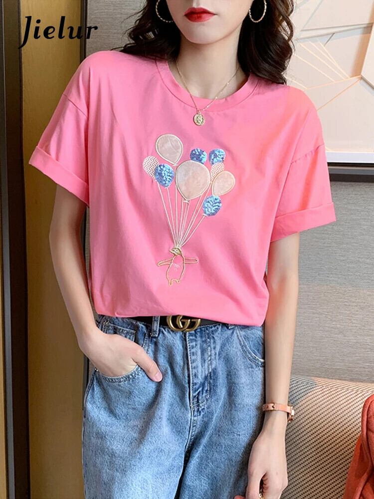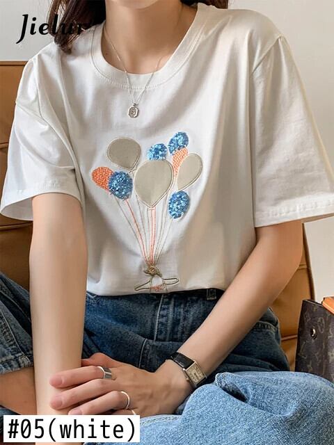 送料無料 Jielur 刺繍スパンコール Tシャツ女性の夏の半袖 Tシャツコットントップス S-XL ショート ハーフスリーブ サマー 夏物 AE12188787845312465072