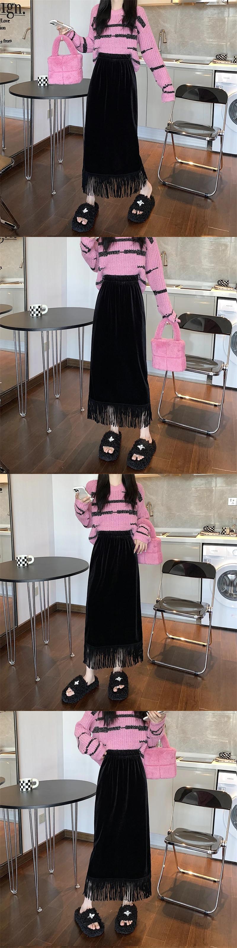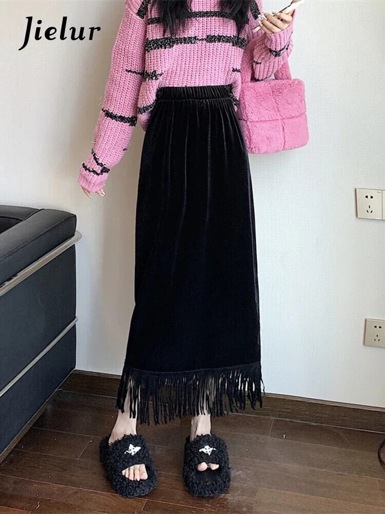 送料無料 Jielur 黒ベルベットスカート女性秋冬ミッドレングス電話ウエストスリム A ラインロングスカート女性 ブラック オータム 秋物 ウィンター 冬物 Aライン AE1218878786598141750