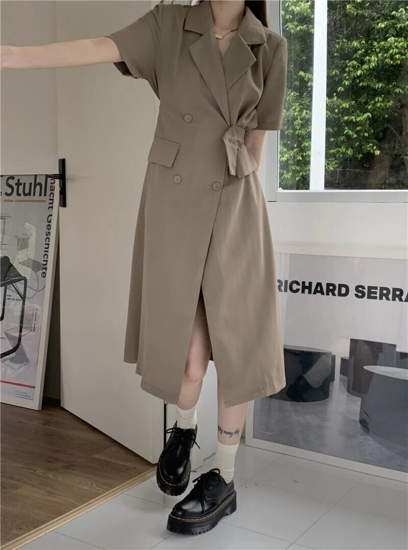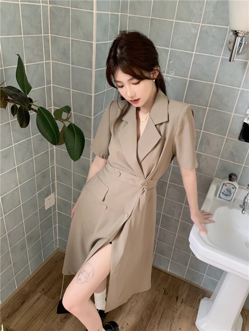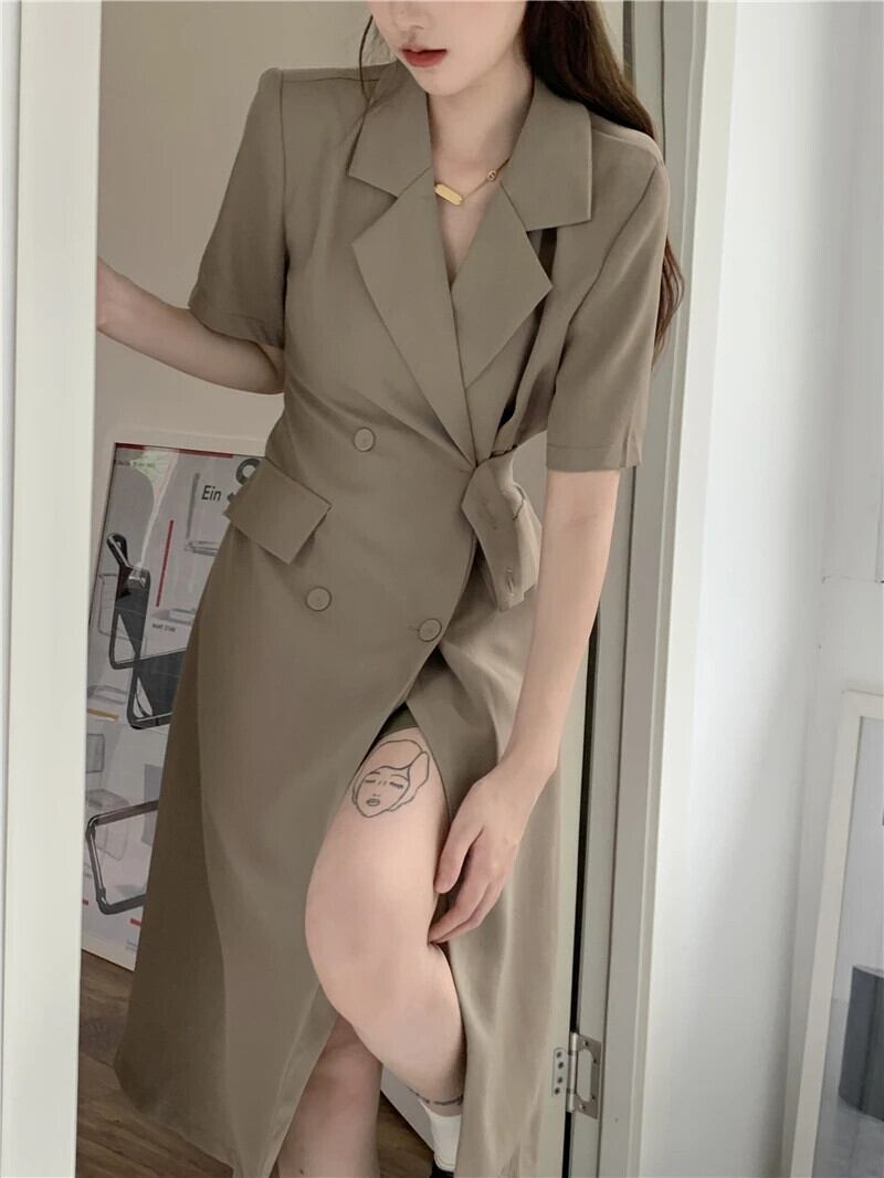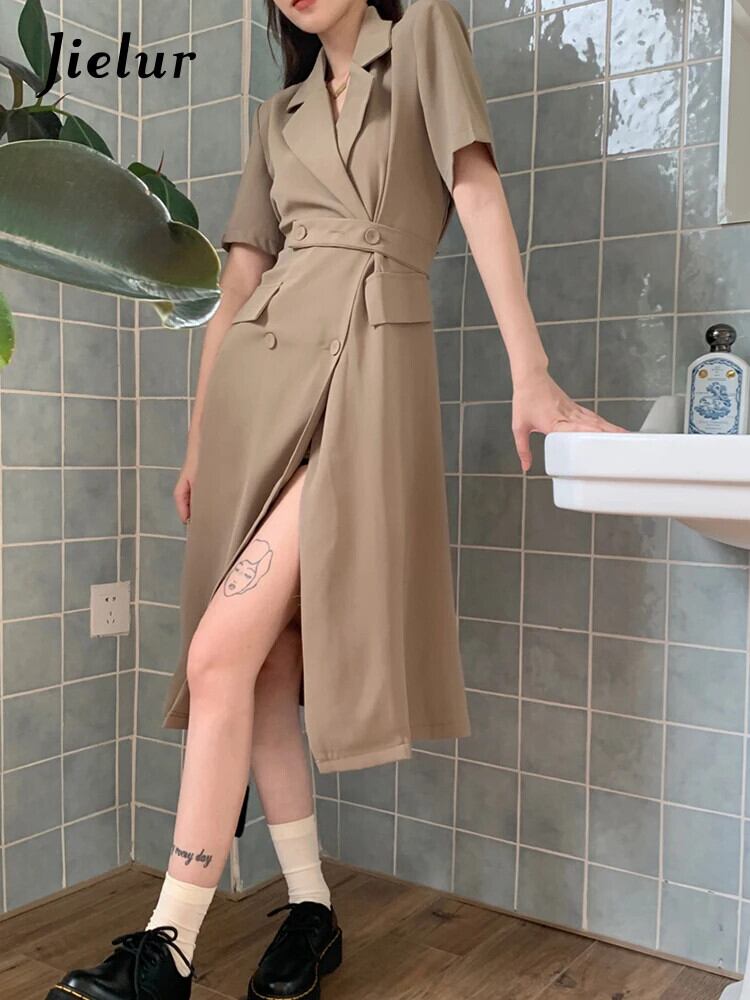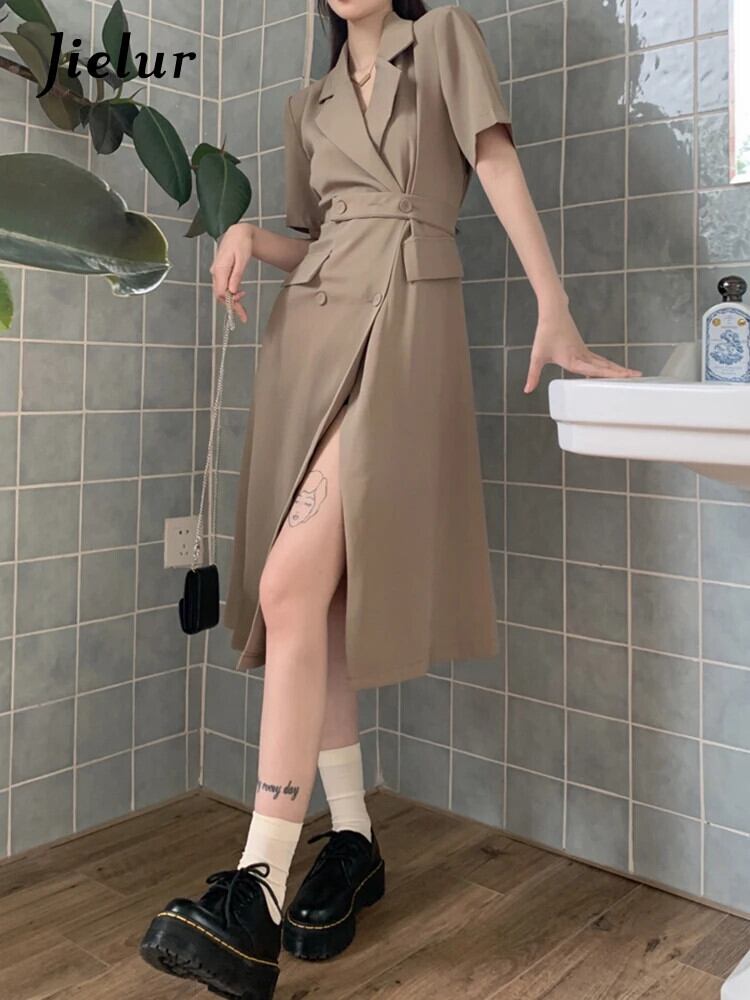 送料無料 Jielur 夏半袖スーツドレス女性スリムレディエンドカーキドレスノッチボタン OL Vestido S-XL ショート ハーフスリーブ サマー 夏物 AE12188787815795992422