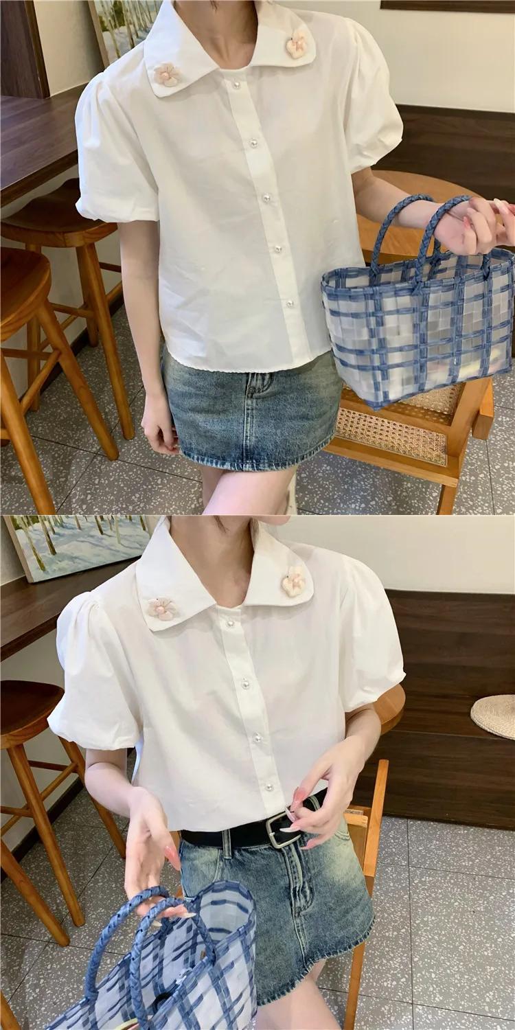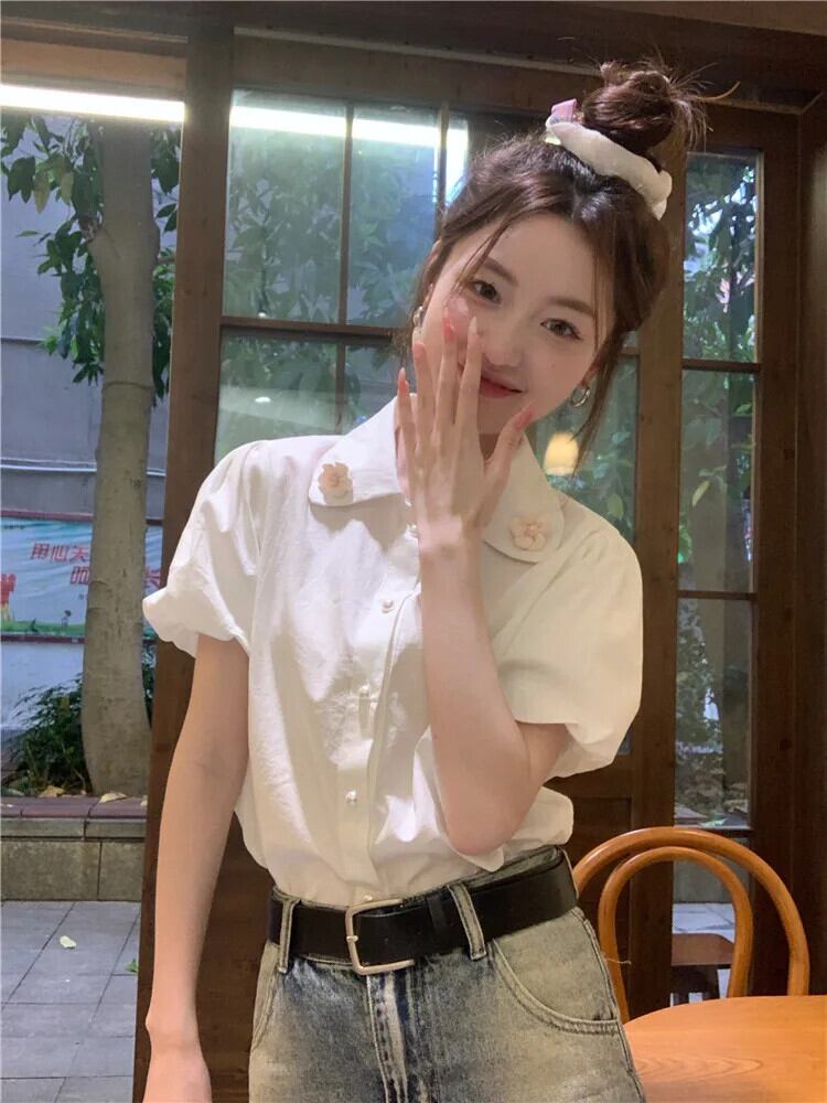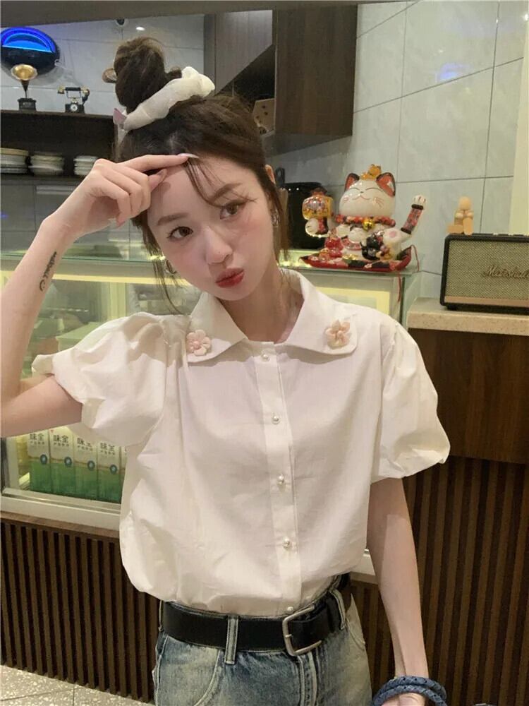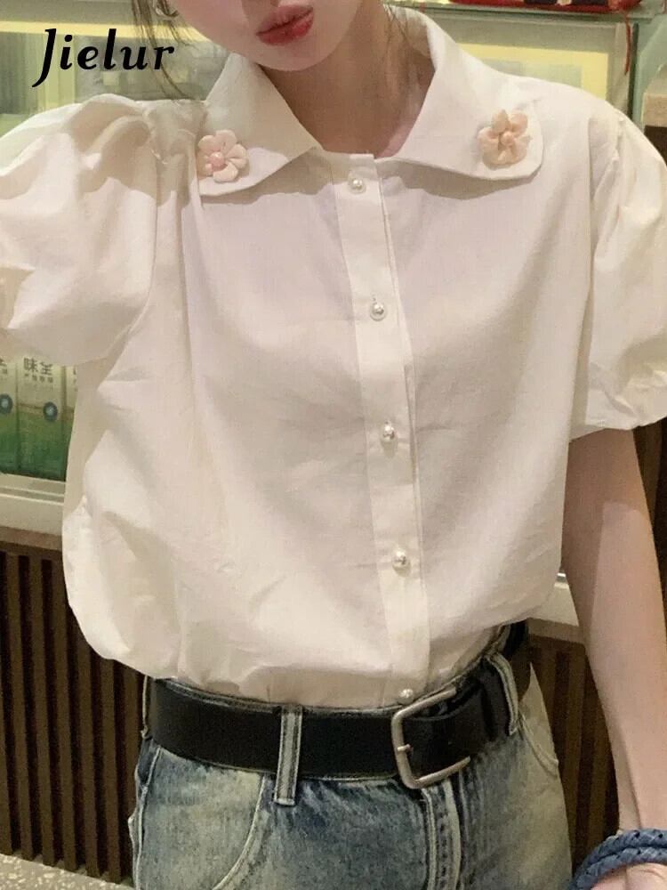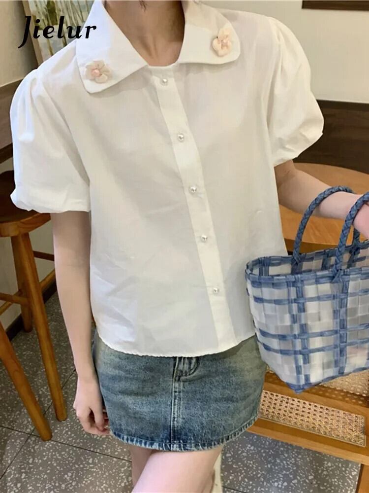 送料無料 Jielur 夏甘いソリッドカラーの女性のシャツ甘いルーズシャツ女性白シックなパフスリーブトップ ホワイト 大人ガーリー スウィート キュート カジュアル サマー 夏物 AE12188787856848246362