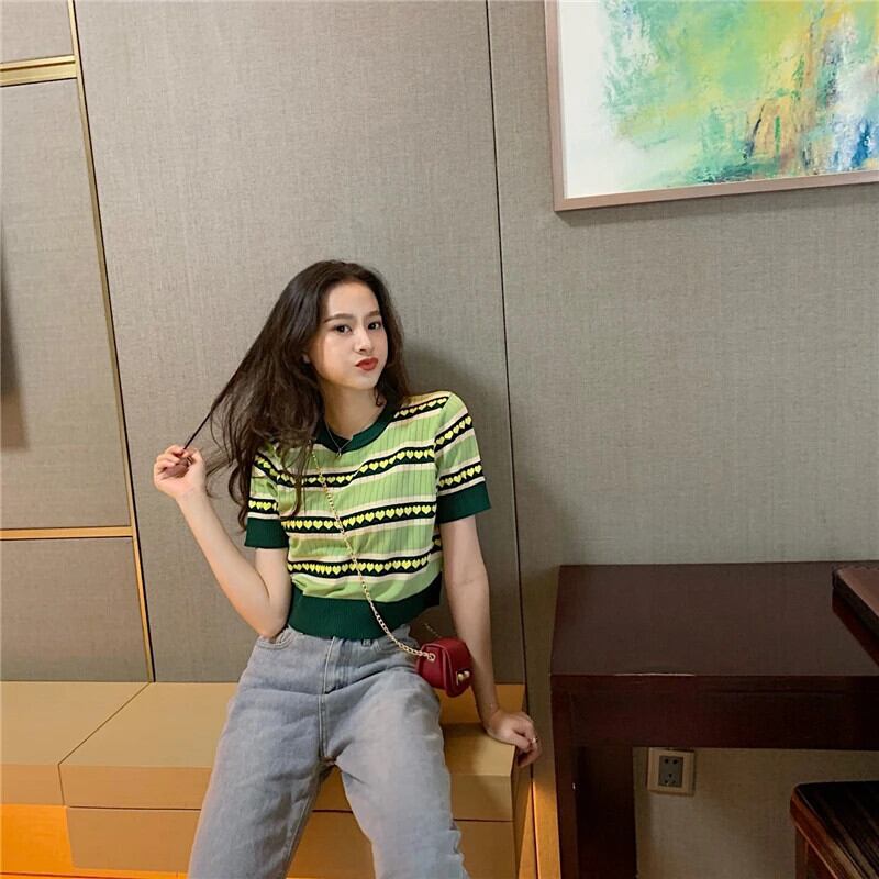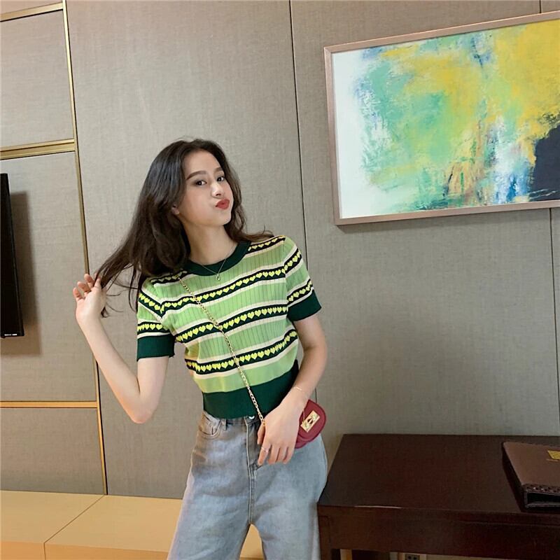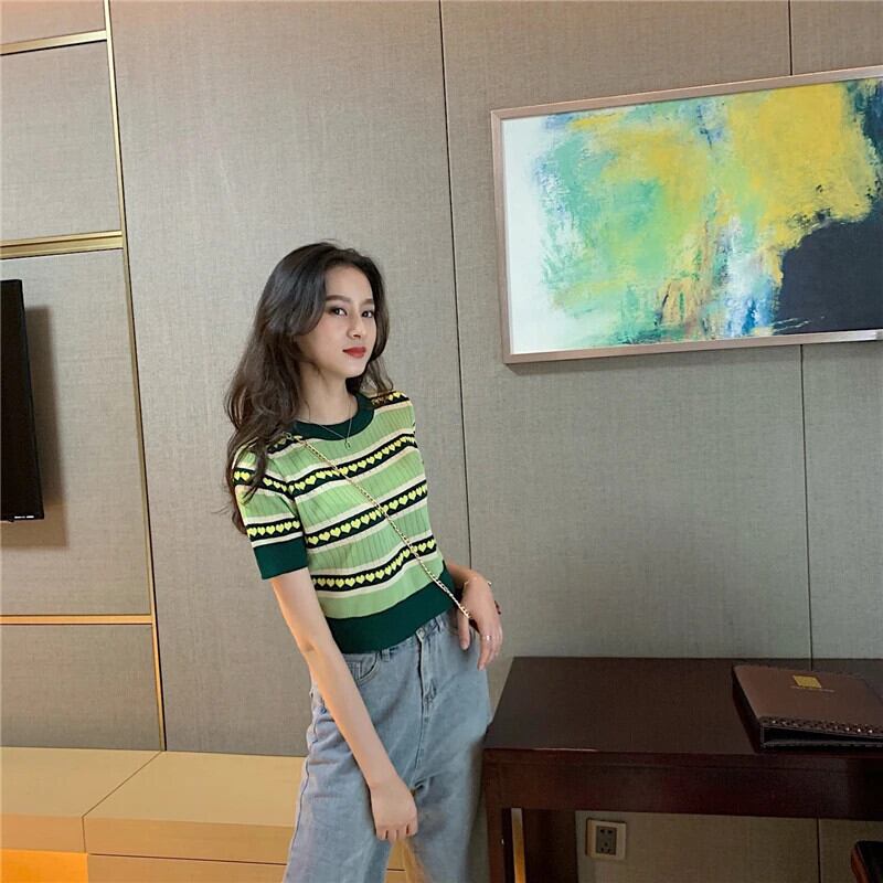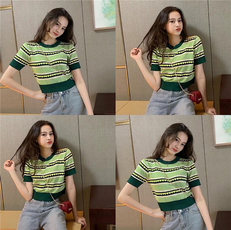 送料無料 Jielur セーター女性サマーセーター O ネックプリントシックなルーズベーシックショートジャンパースリムグリーンプルプルオーバー 夏物 Oネック AE12188787860337395401