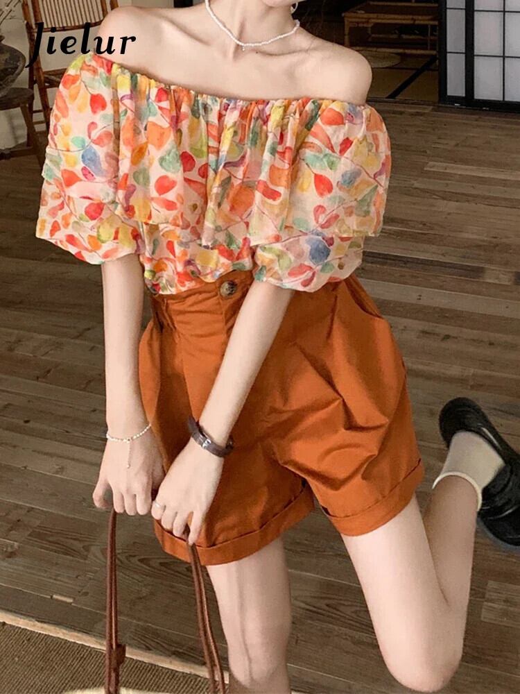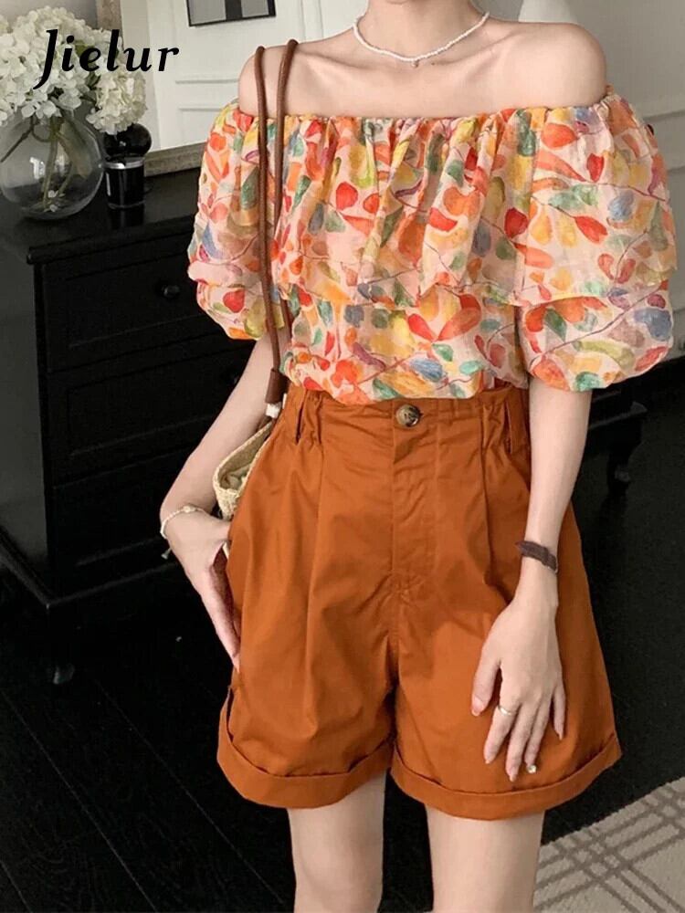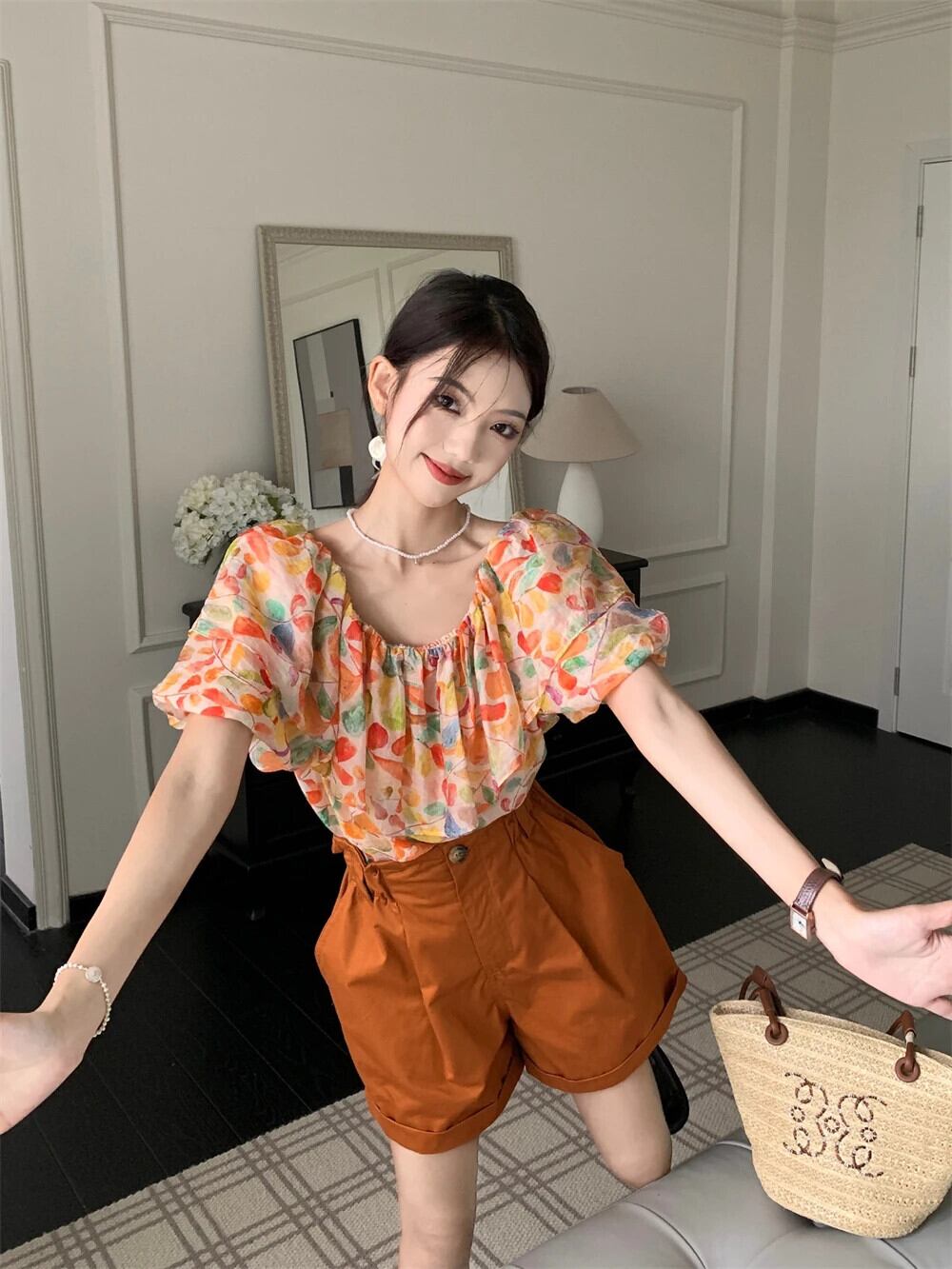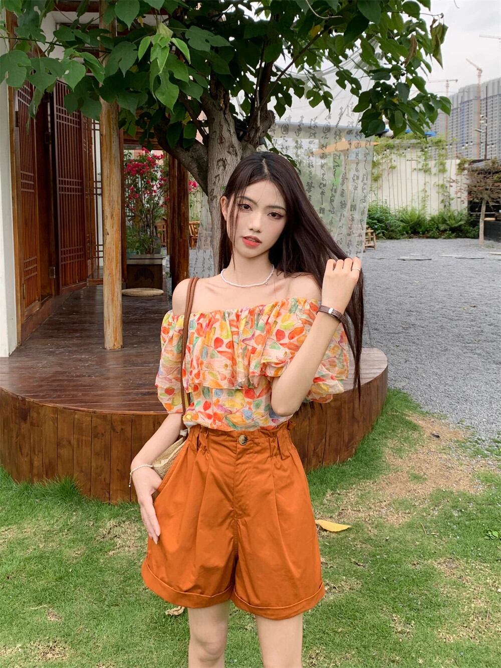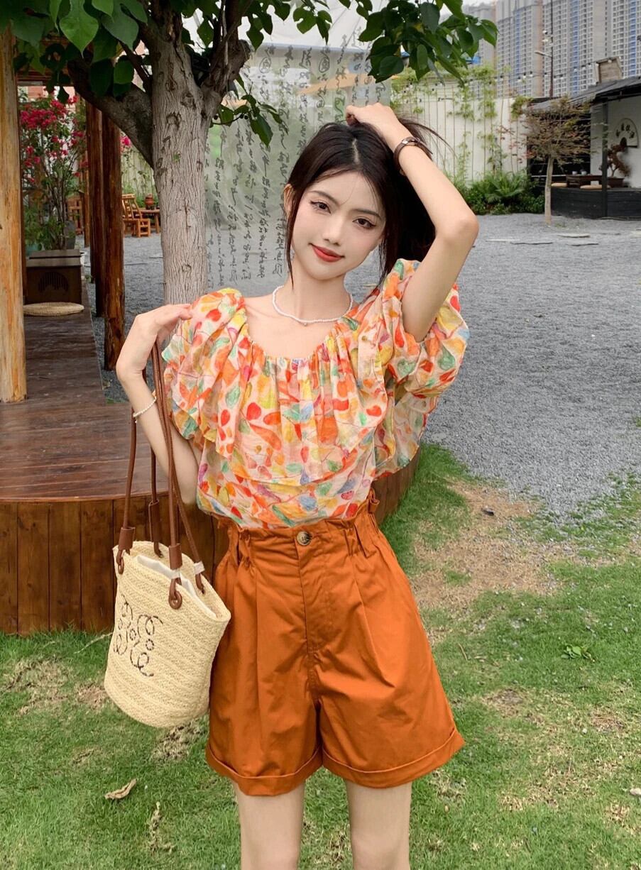 送料無料 Jielur ツーピース夏甘い女性ブラウス花柄ブラウス女性ウエストスリムオレンジショーツ 大人ガーリー スウィート キュート カジュアル サマー 夏物 ブルマー AE12188787844218057