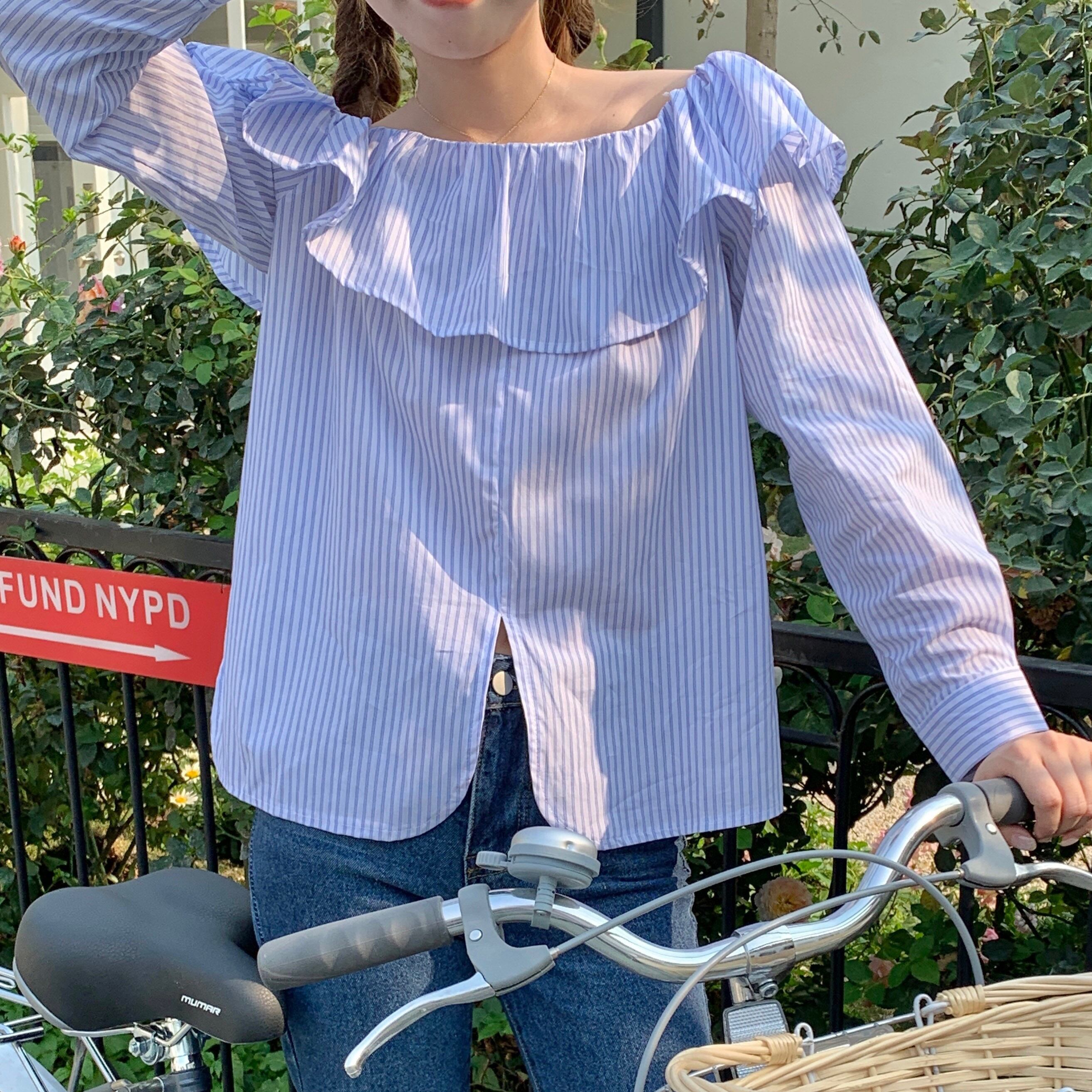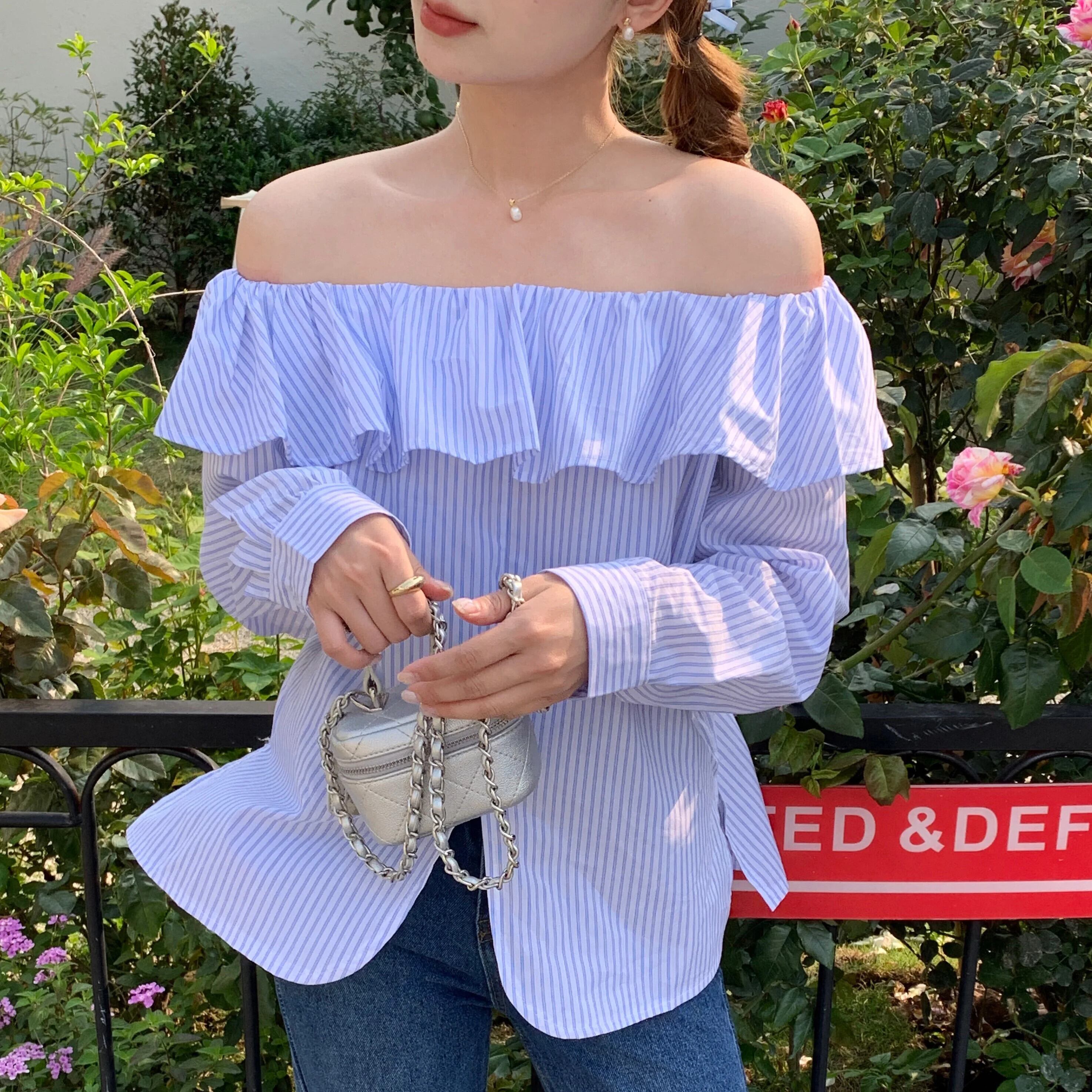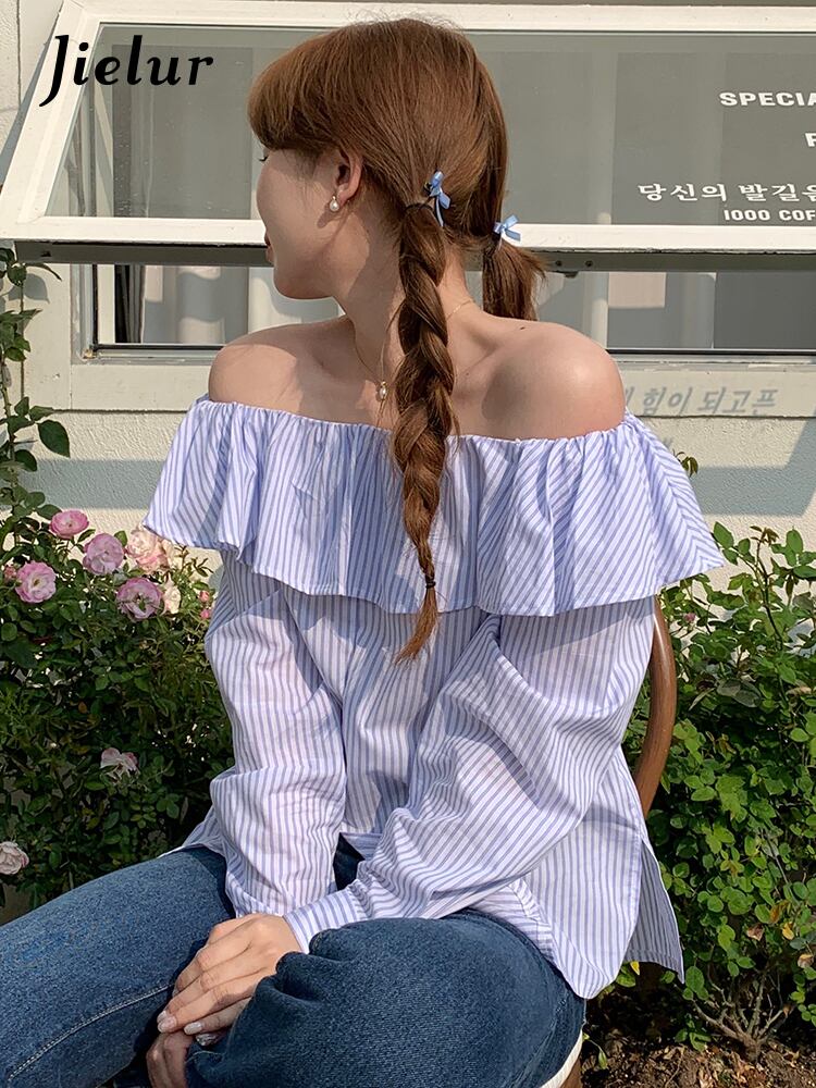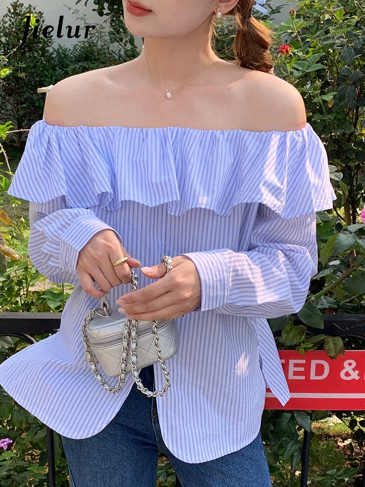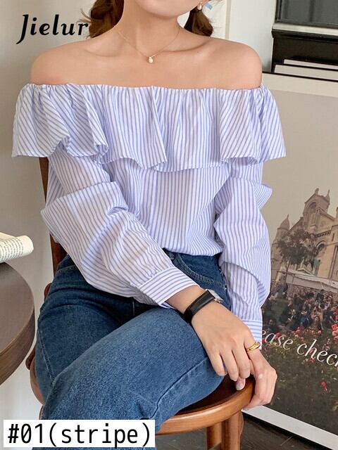 送料無料 Jielur 夏スリム女性ブラウスベーシックスラッシュネックブラウスフリルスプリット若いブラウス サマー 夏物 AE12188787863449456853