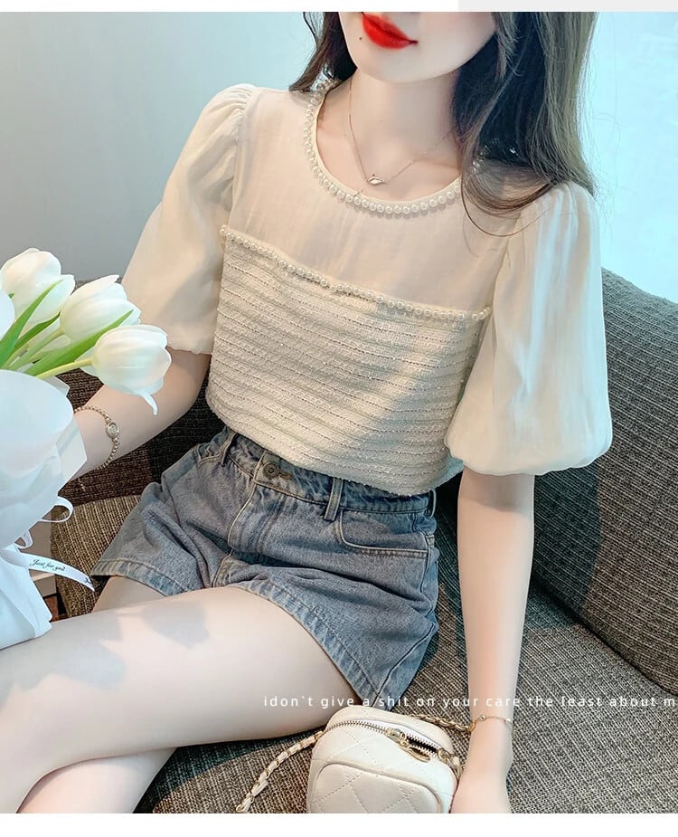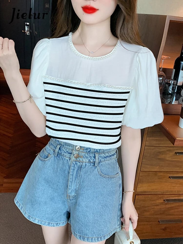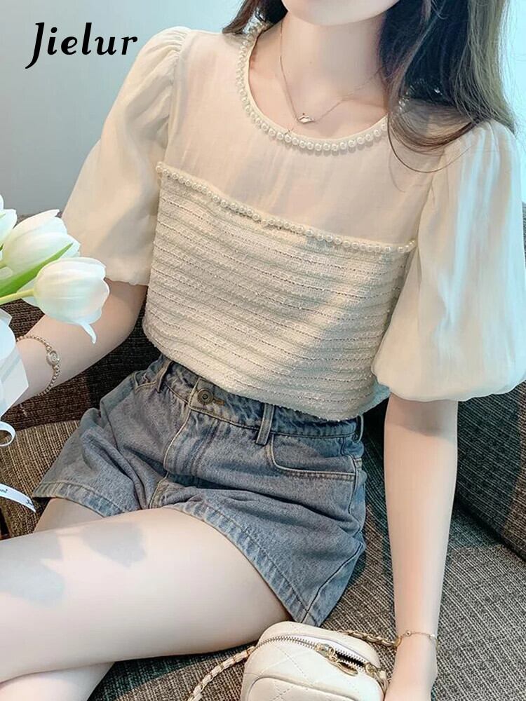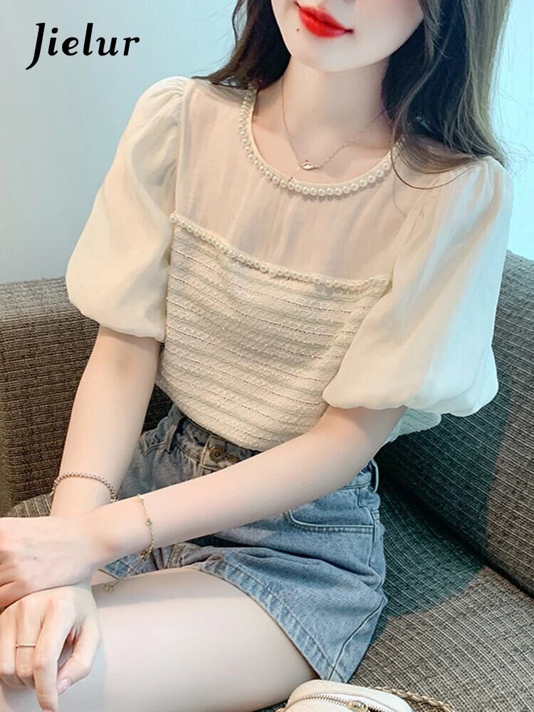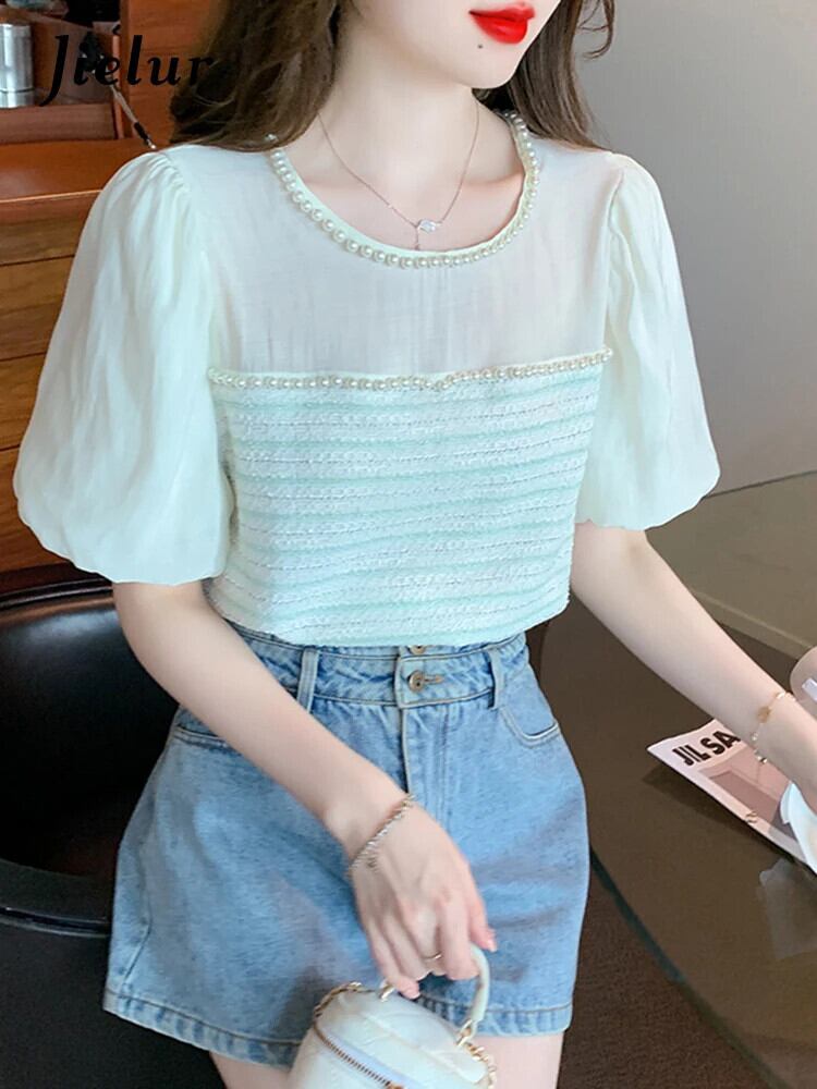 送料無料 Jielur 夏フェイクツーピーススリム女性ブラウスコントラストカラー甘いブラウスルーズシフォントップ 大人ガーリー スウィート キュート カジュアル サマー 夏物 AE12188787812490072064
