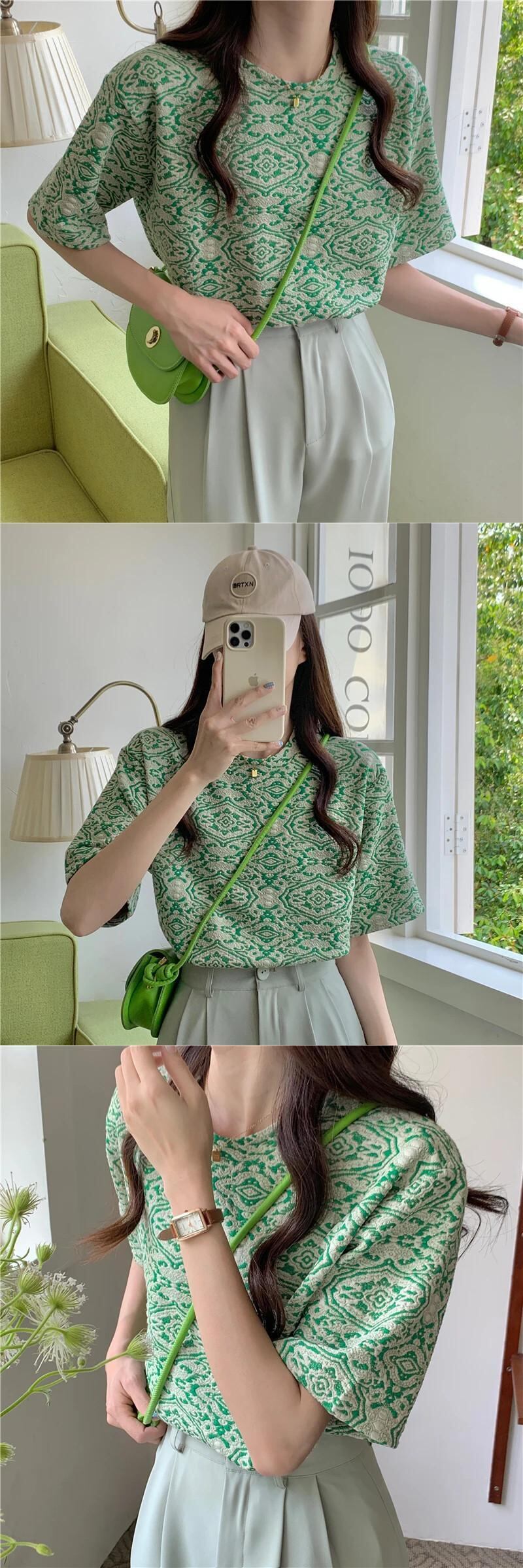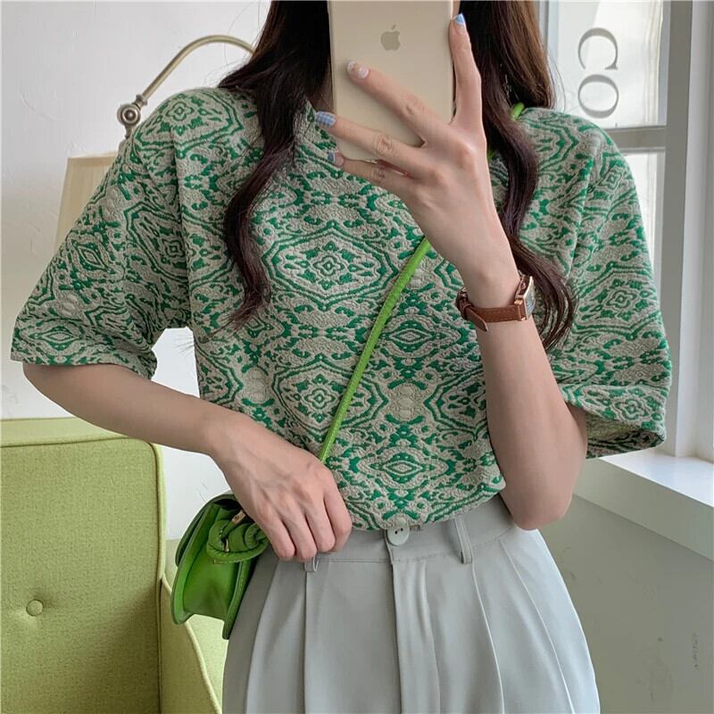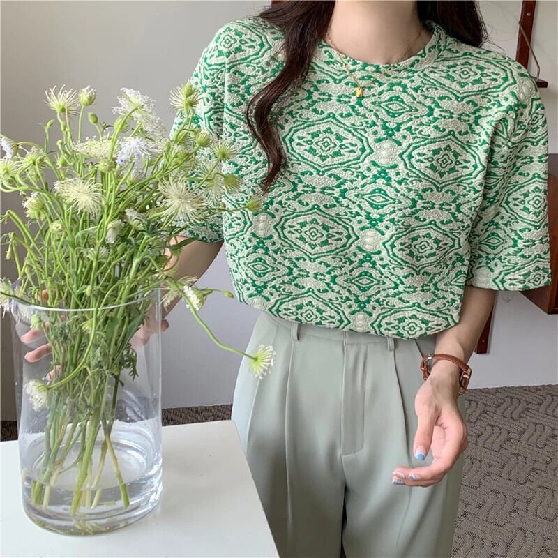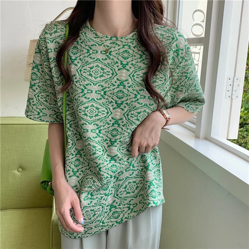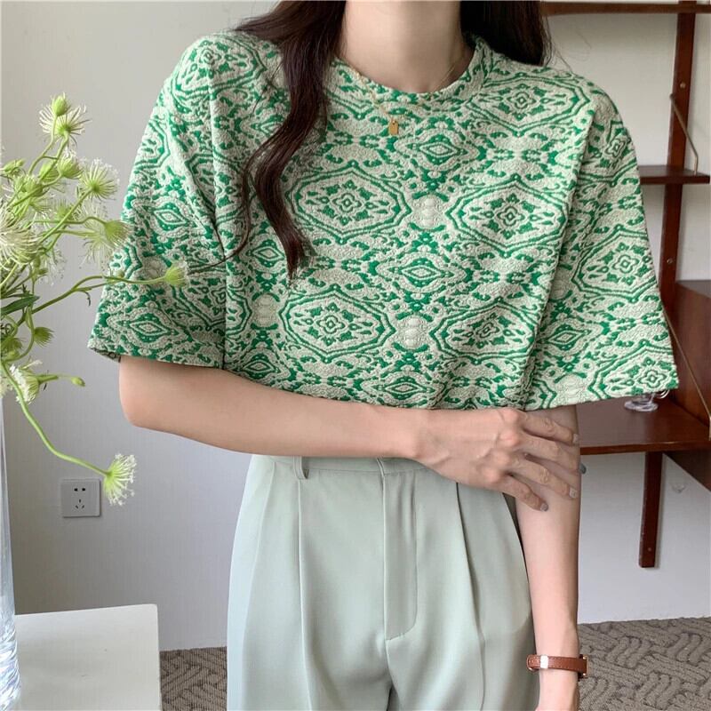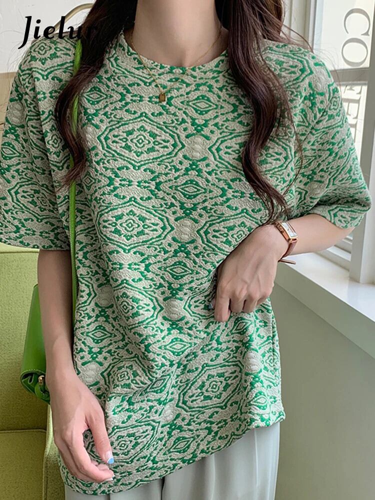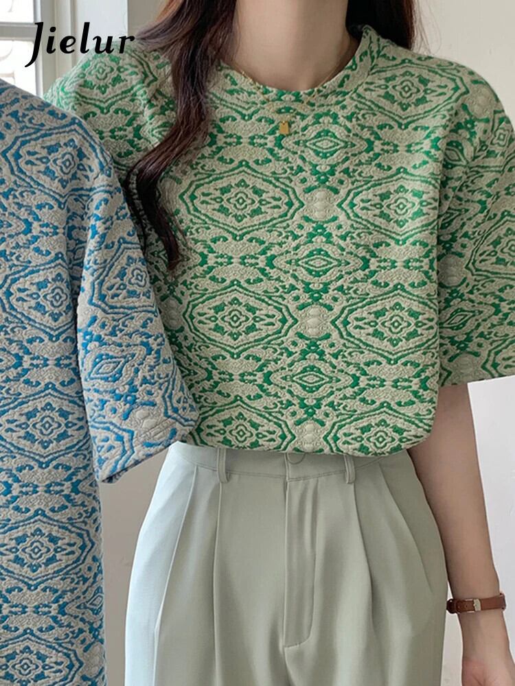 送料無料 Jielur クリエイティブエンボスフラワールーズ Tシャツ O ネック半袖グリーンブルー Tシャツ女性トップ女性 M-XL ショート ハーフスリーブ Oネック フラワーデザイン AE12188787881030410757