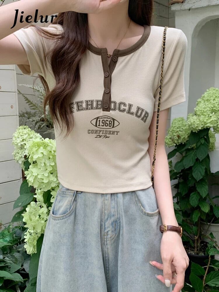 送料無料 Jielur 夏のコントラストカラーの女性の Tシャツレトロ Tシャツ女性アプリコットグリーンシックな O ネックトップ サマー 夏物 Oネック AE12188787896890631265