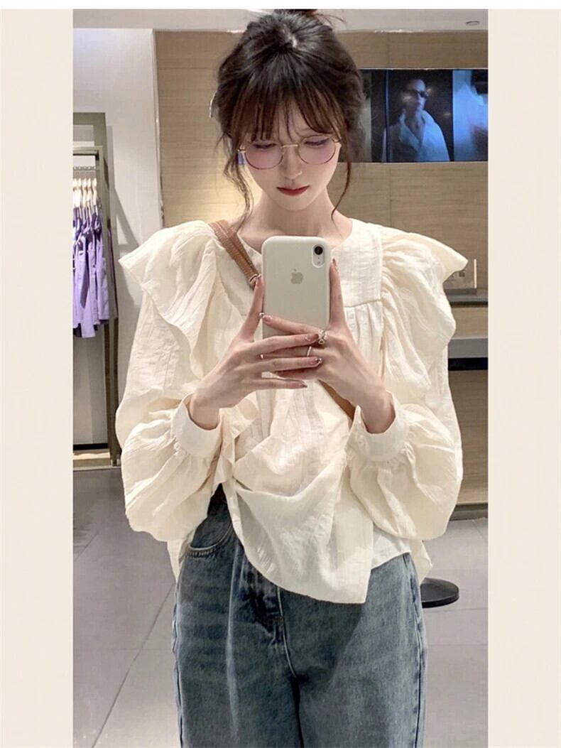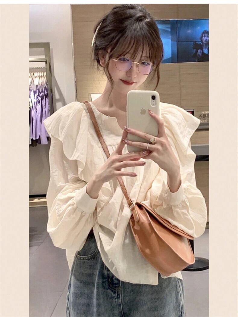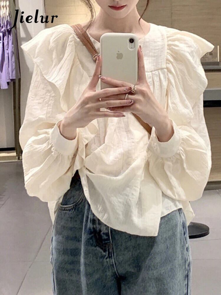 送料無料 Jielur V ネックフリル長袖ブラウス女性フレンチブラウス夏ライトアプリコットレディシャツ ロング サマー 夏物 Vネック AE12188787847641696995