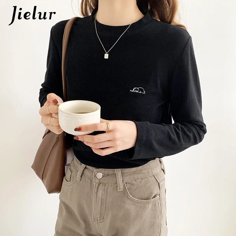 送料無料 Jielur カーキ刺繍漫画 Tシャツ女性グリーンかわいいガールズ Tシャツ白シンプルな長袖トップス S-XL ロング ホワイト レッド 大人ガーリー スウィート キュート カジュアル AE12188787820905492073