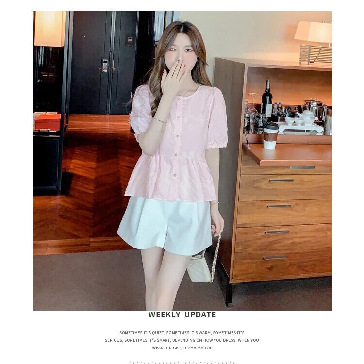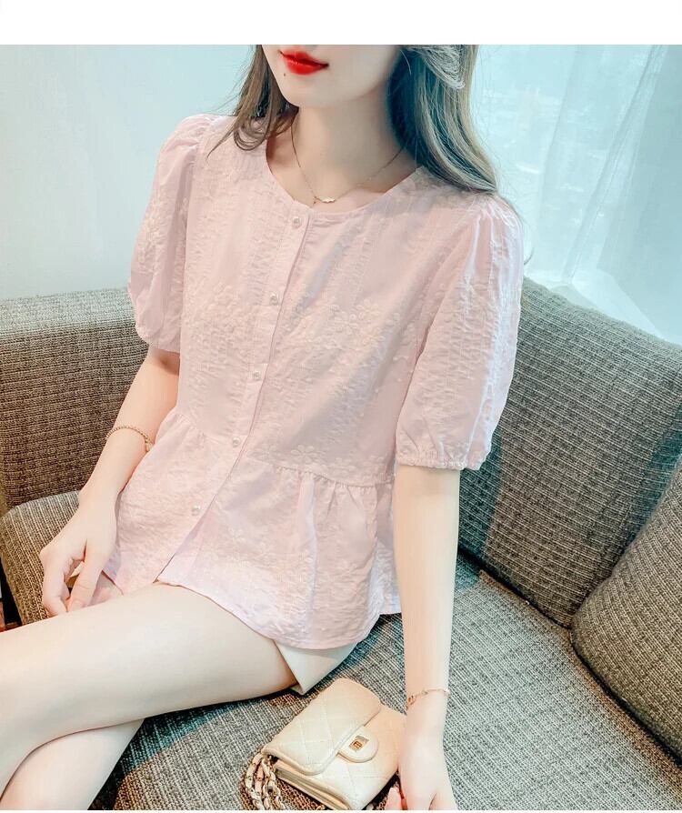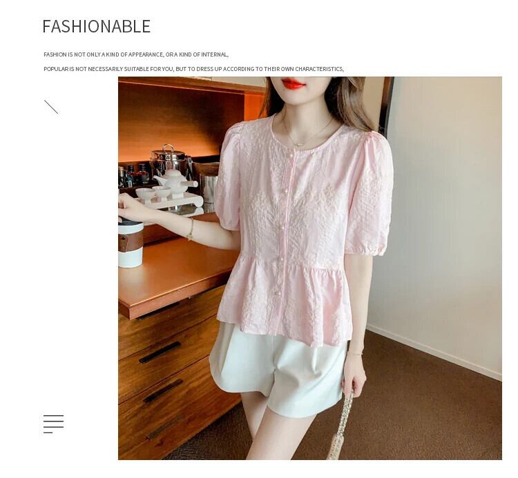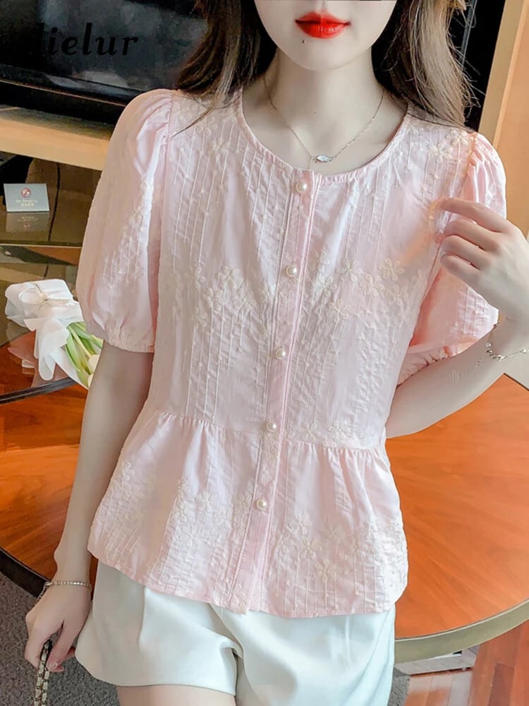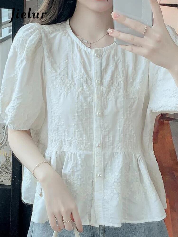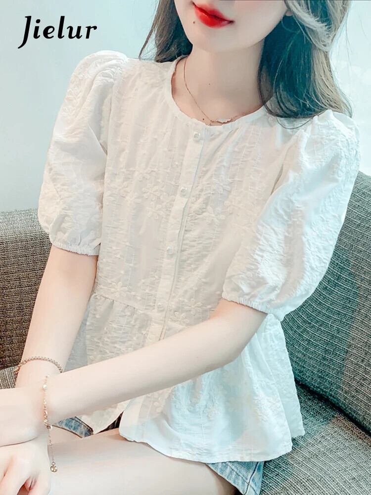 送料無料 Jielur 夏ヴィンテージフレンチ刺繍女性シャツ無地甘いシャツ女性ピンク、白パフスリーブルーズトップ ホワイト 大人ガーリー スウィート キュート カジュアル サマー 夏物 ソリッドカラー ビンテージ AE12188787848682241261