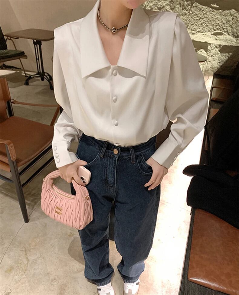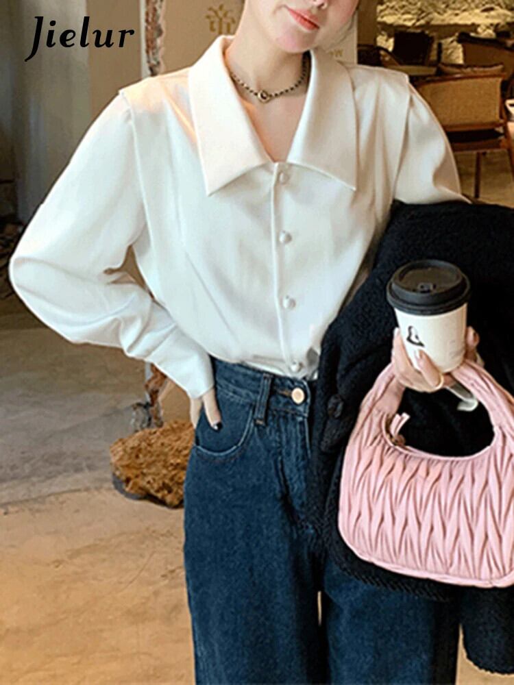 送料無料 Jielur ルース若々しい女性シャツフレンチ優雅なブラウス女性プレッピースタイル白長袖シャツトップス ロング ホワイト AE12188787817827556806