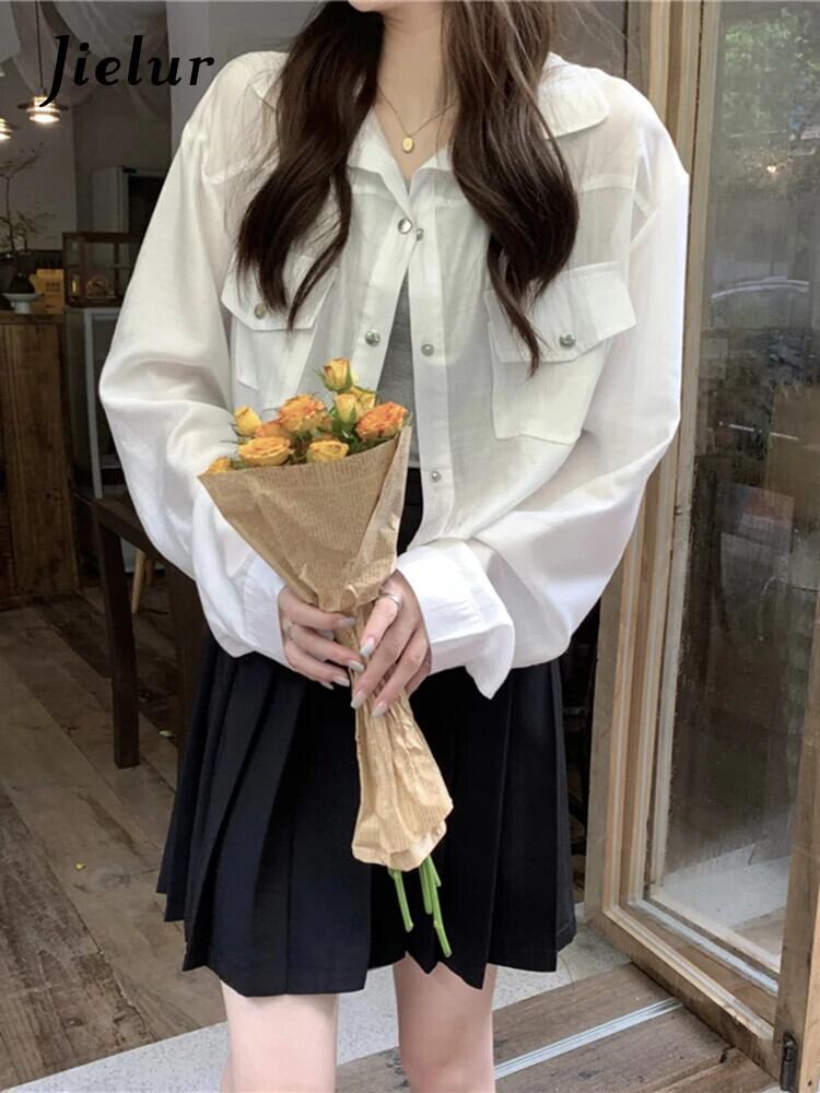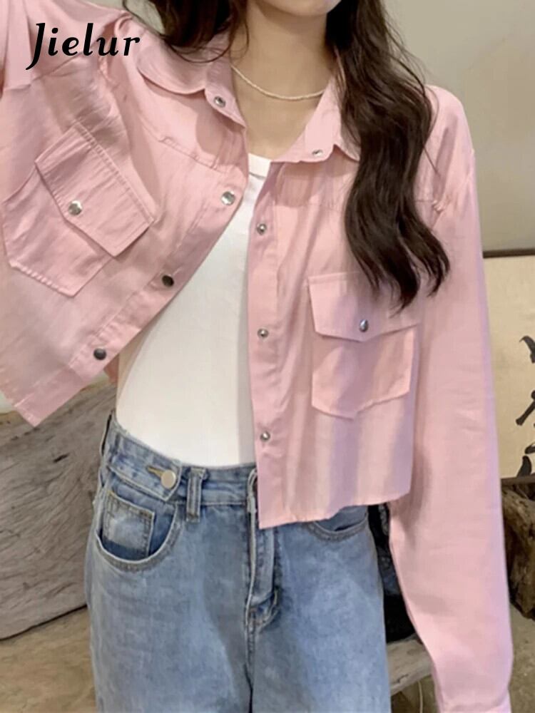 送料無料 Jielur 夏無地スリム女性シャツスイートシックなシャツ女性ピンク、白のシンプルなベーシックトップ ホワイト 大人ガーリー スウィート キュート カジュアル サマー 夏物 ソリッドカラー AE12188787887284861528