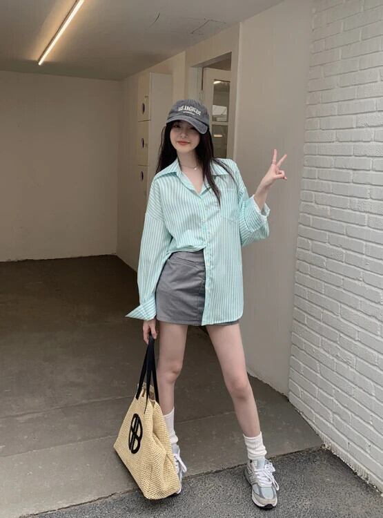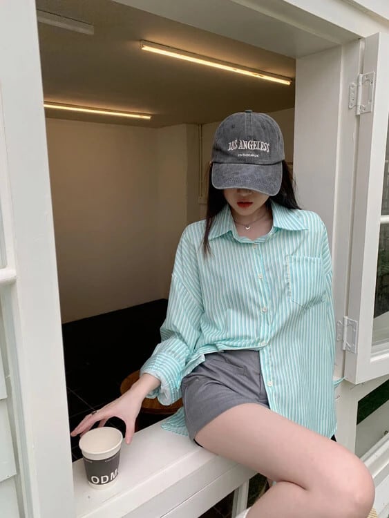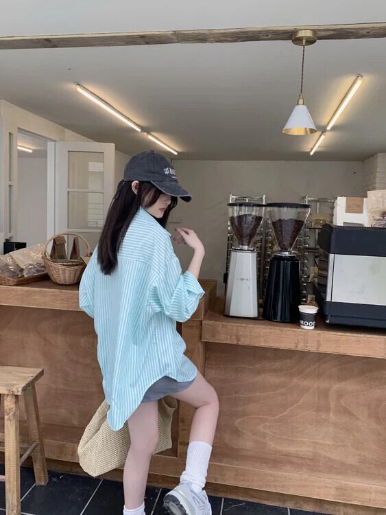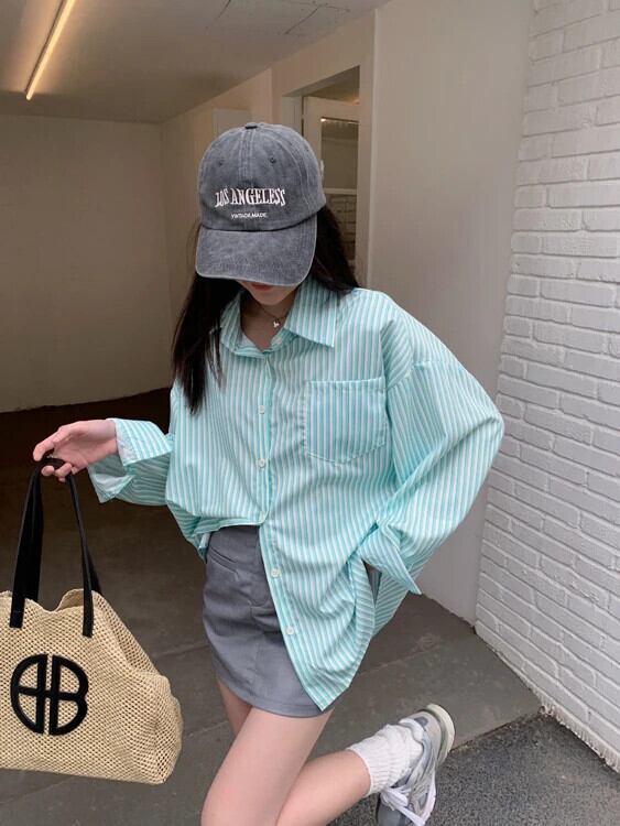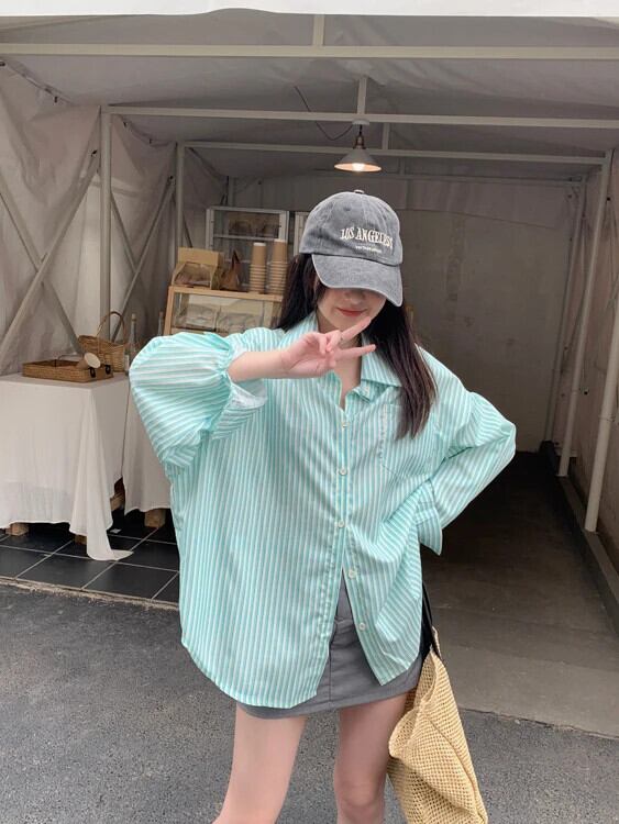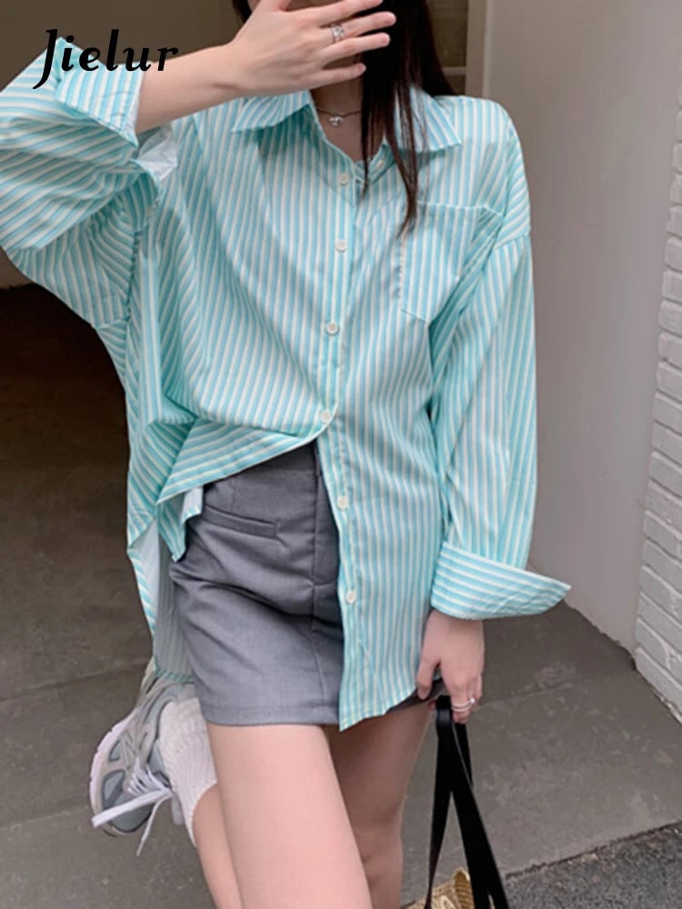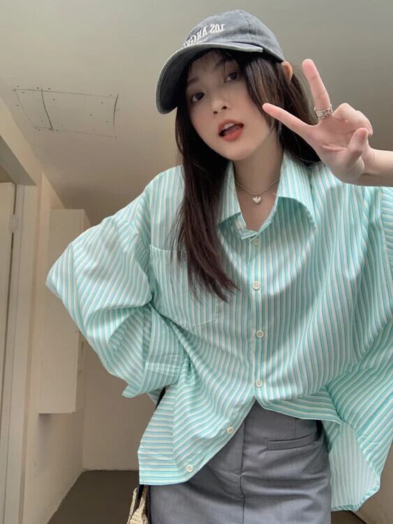 送料無料 Jielur ルーズ女性シックなシャツグリーン縦縞ルーズシンプルなシャツストリートベーシックスリムトップ女性 ストライプ AE12188787893334235547