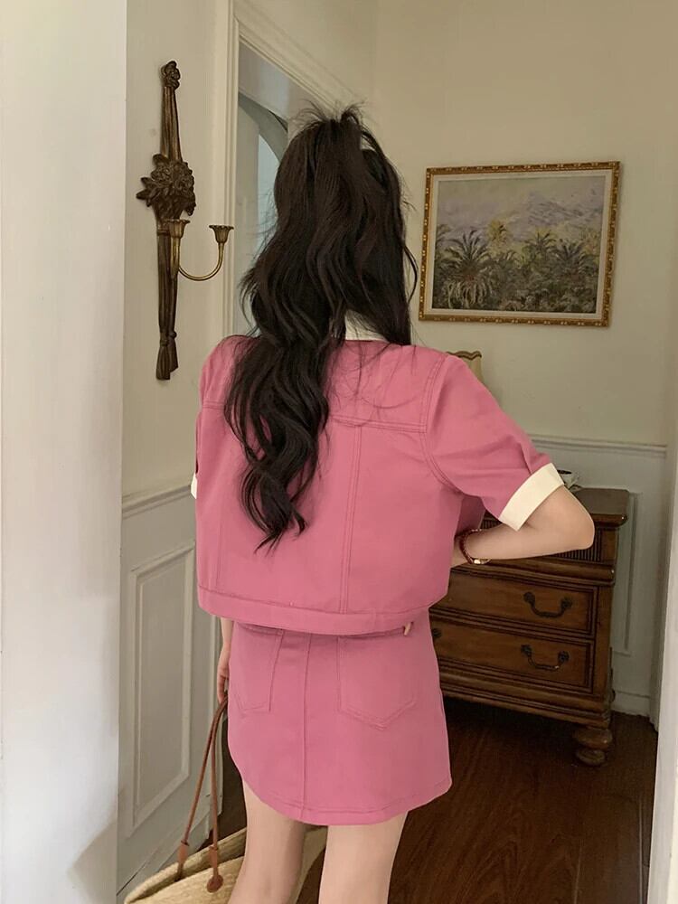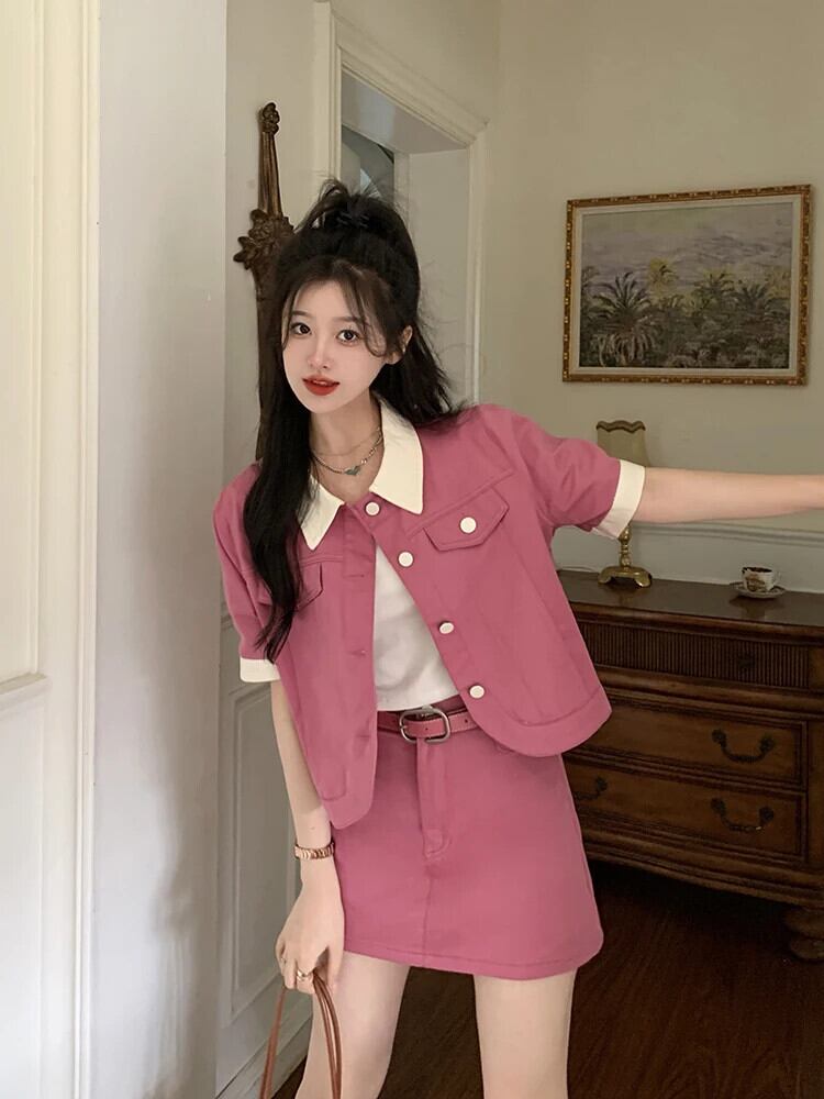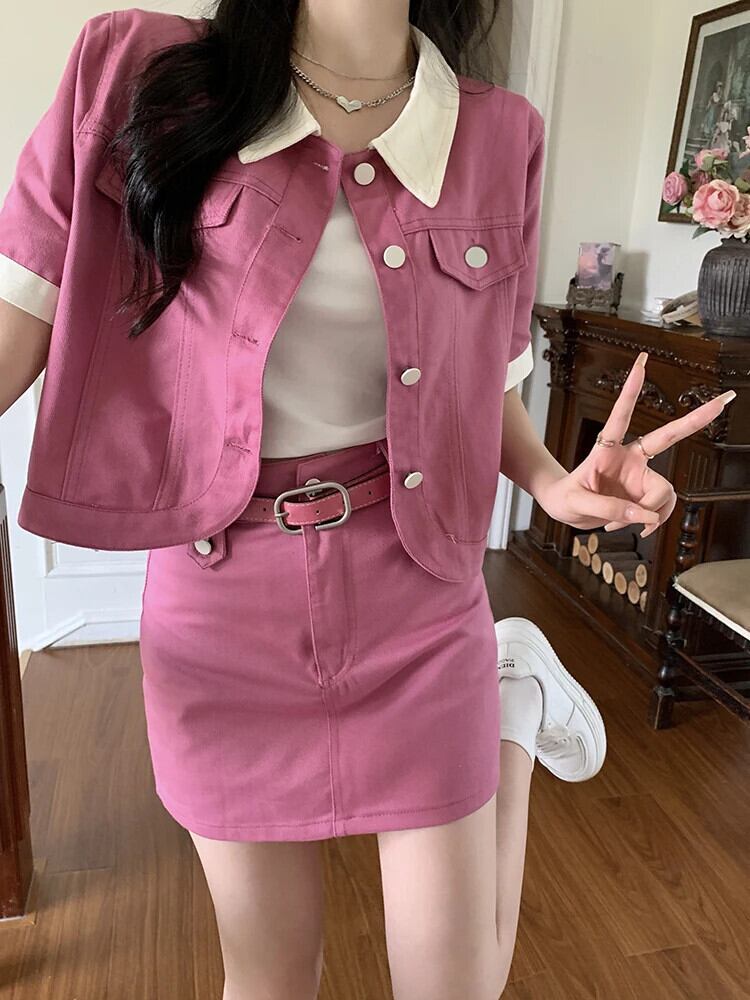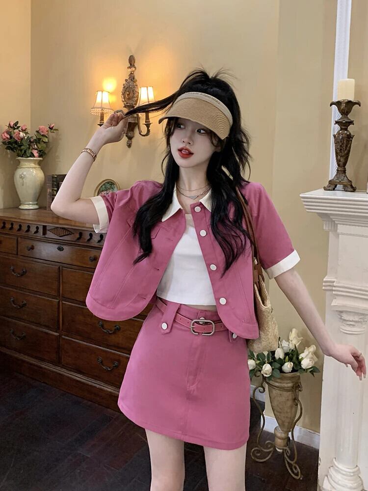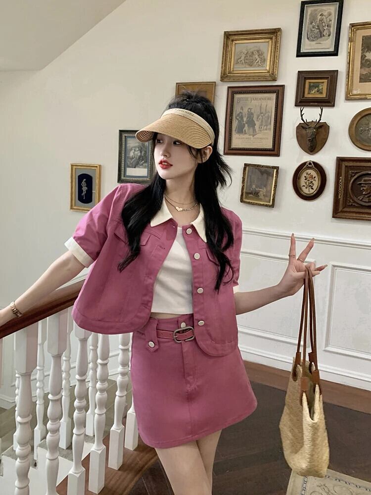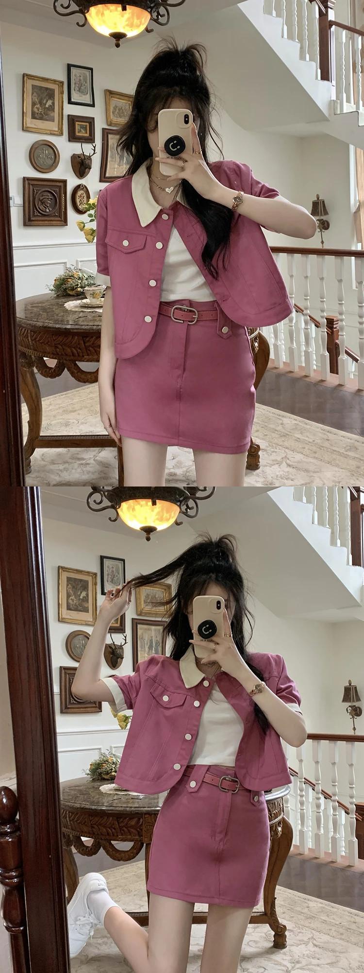 送料無料 Jielur ツーピース夏のコントラストカラーデニム女性のスカートスリムベルトスカート女性ルーズベーシックトップ サマー 夏物 ハーネス AE12188787843570696606