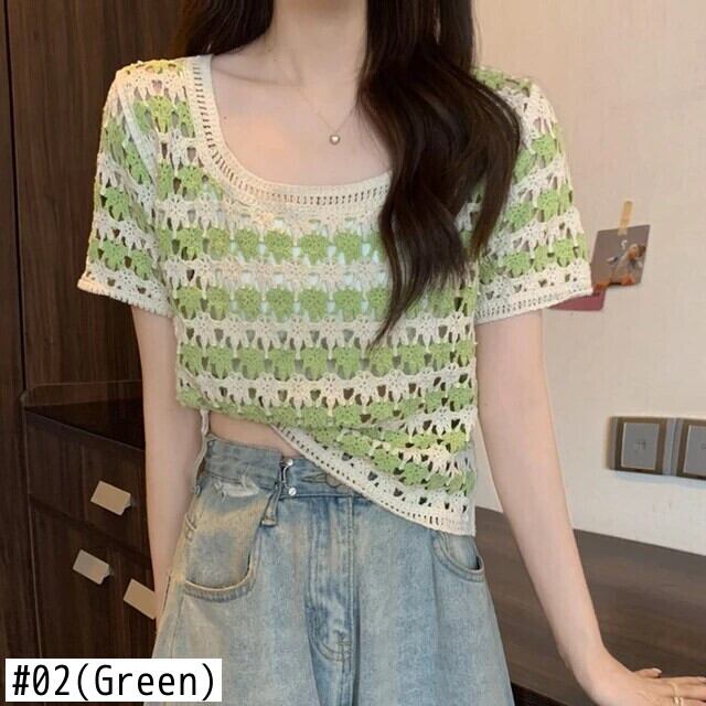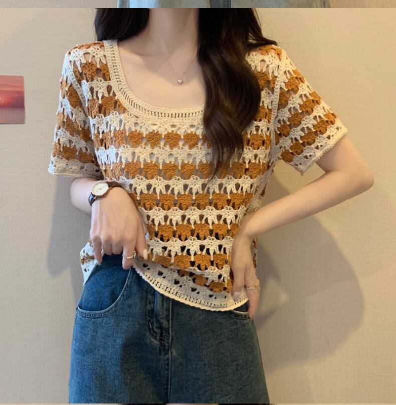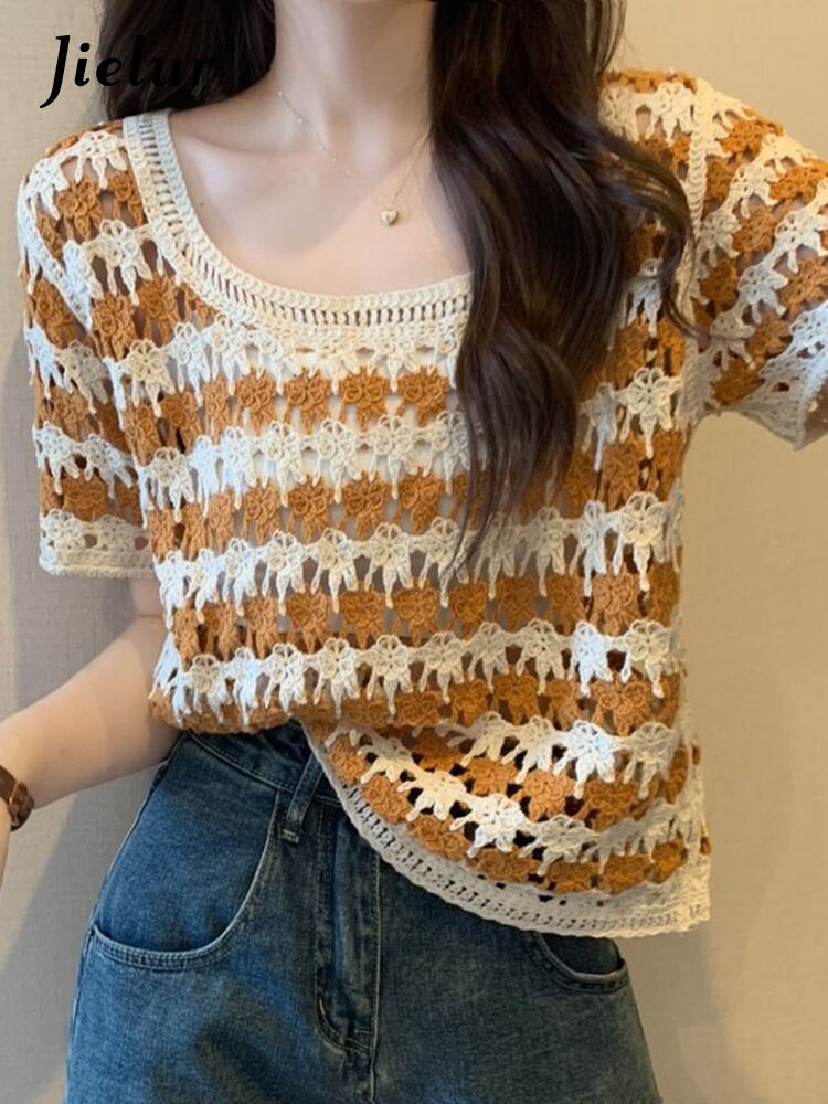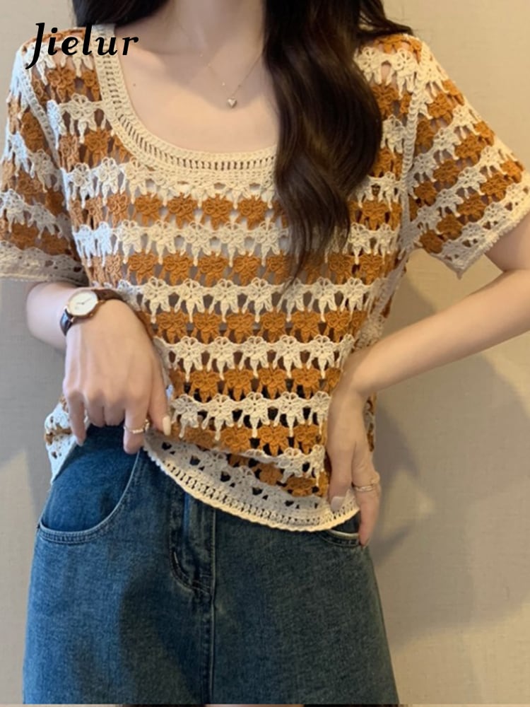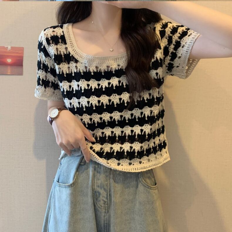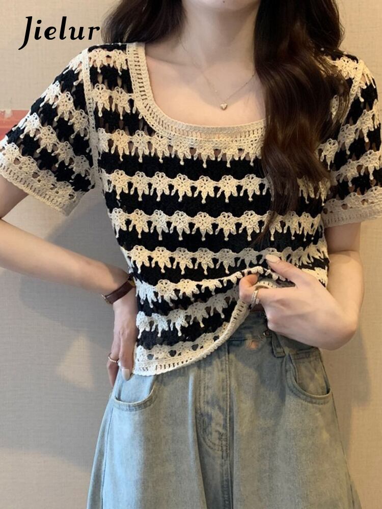 送料無料 Jielur 夏ストライプ中空アウト女性の Tシャツスリムストリートルーズ Tシャツ女性黒オレンジグリーンニットトップ ブラック サマー 夏物 AE12188787833894889941