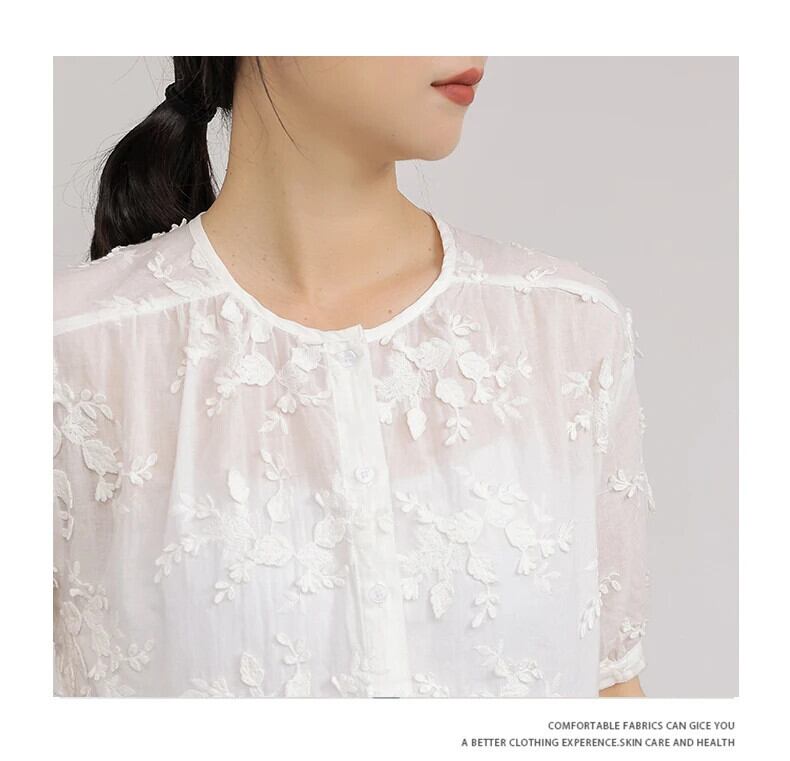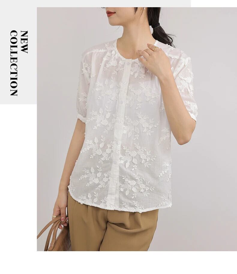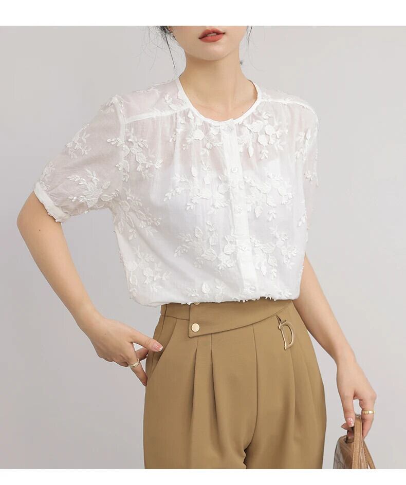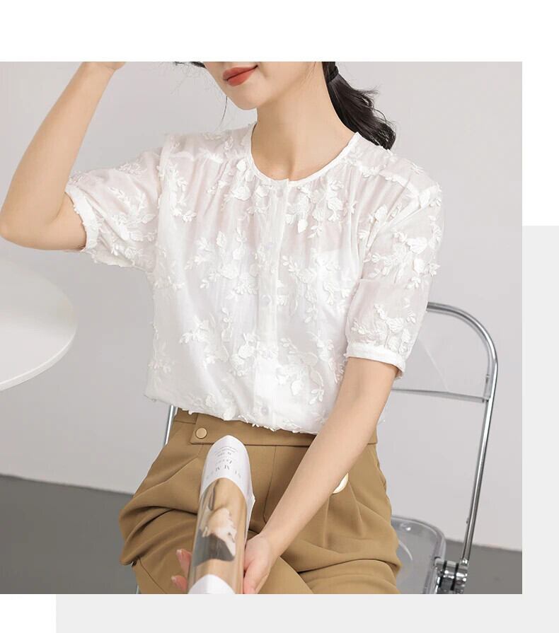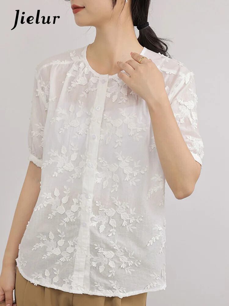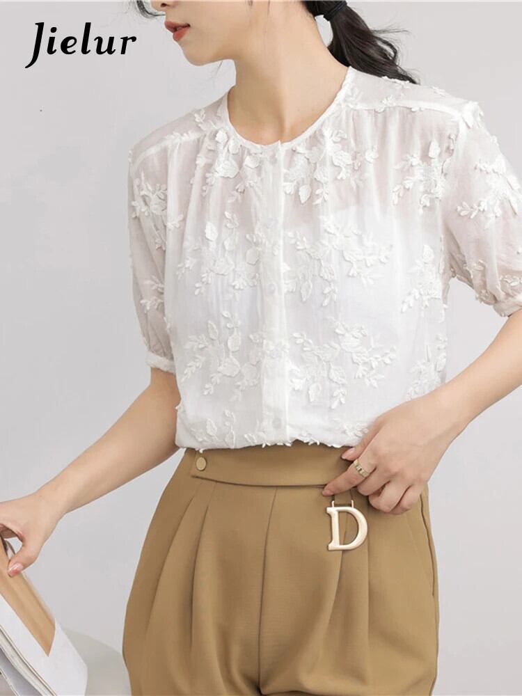 送料無料 Jielur 夏無地スリム女性ブラウス甘いブラウス女性白ルーズ O ネックトップ ホワイト 大人ガーリー スウィート キュート カジュアル サマー 夏物 Oネック ソリッドカラー AE12188787899836670664