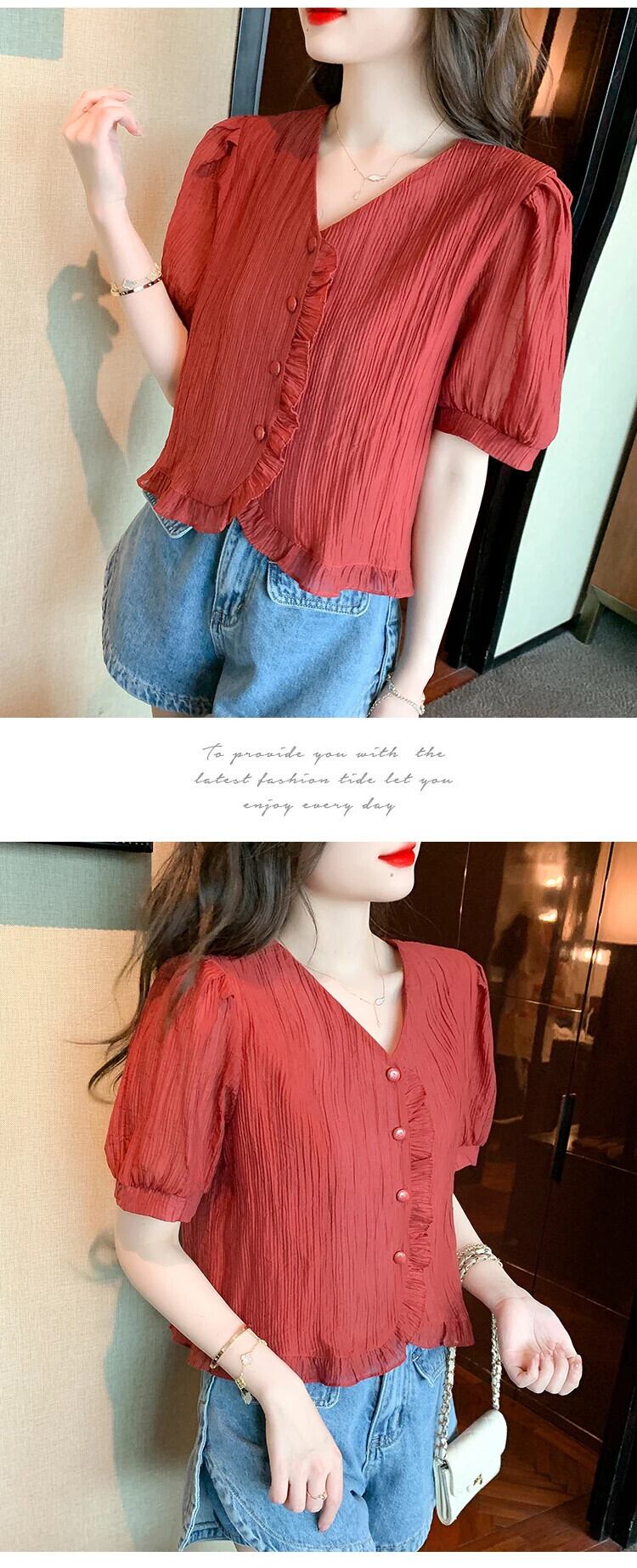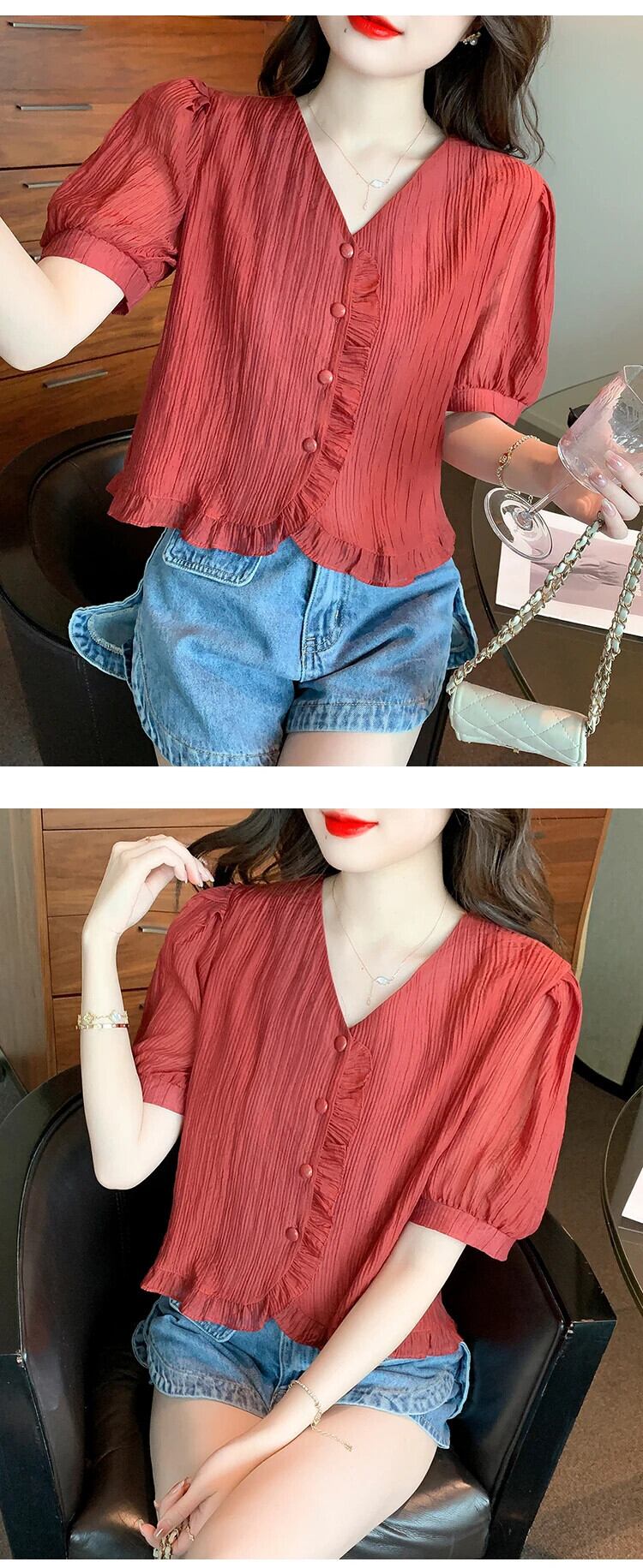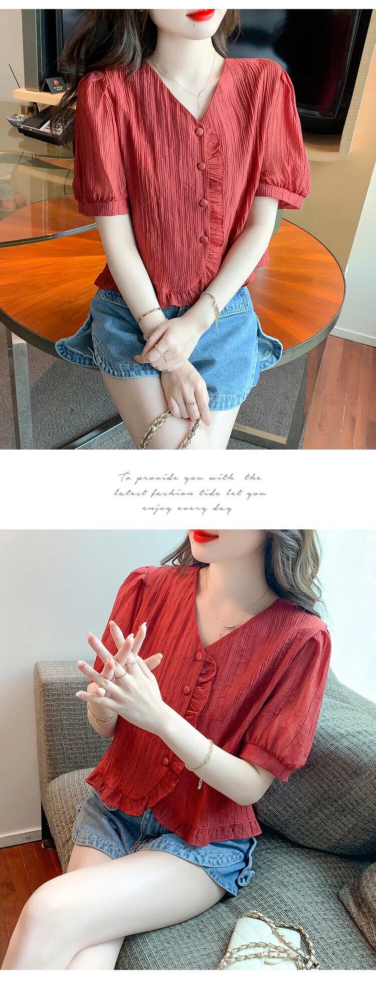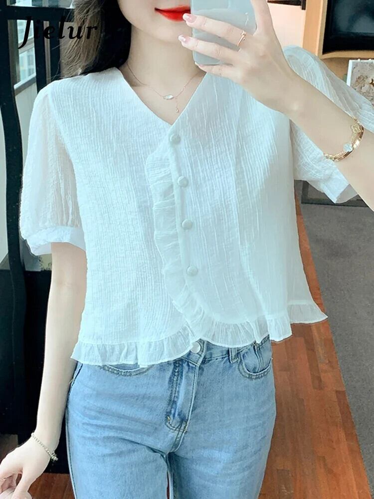 送料無料 Jielur 夏フランス女性シャツ甘い無地シャツ女性白緑赤パフスリーブトップ ホワイト レッド 大人ガーリー スウィート キュート カジュアル サマー 夏物 ソリッドカラー グリーン AE12188787857212476539