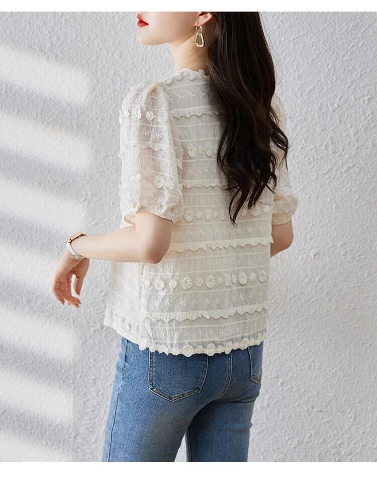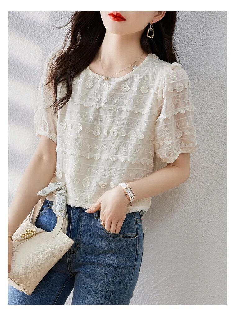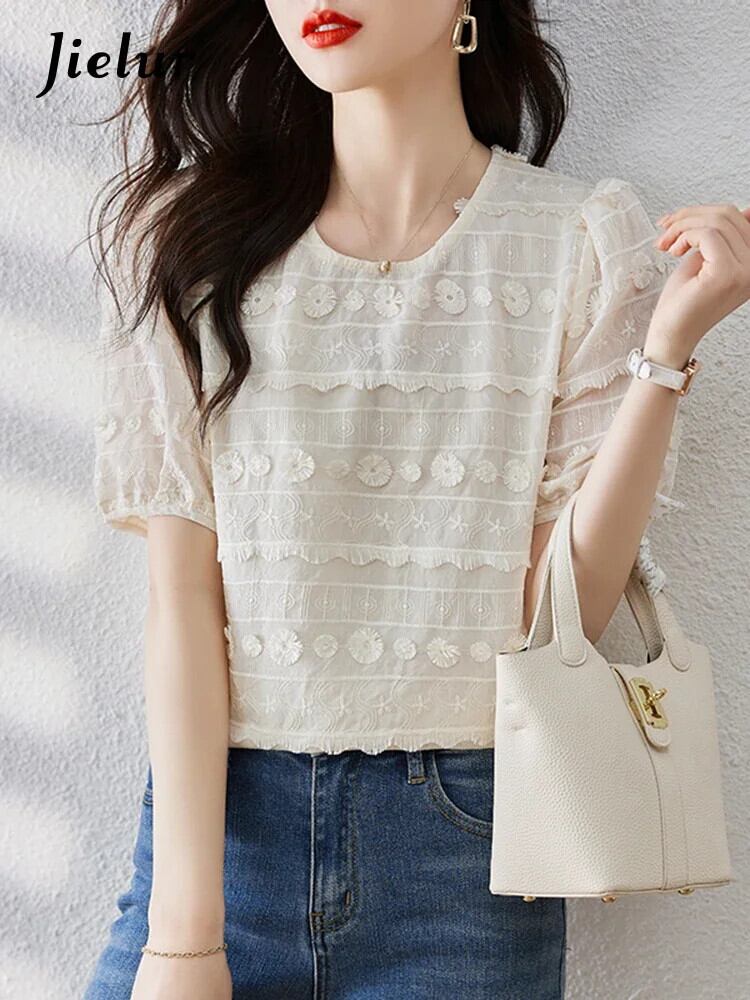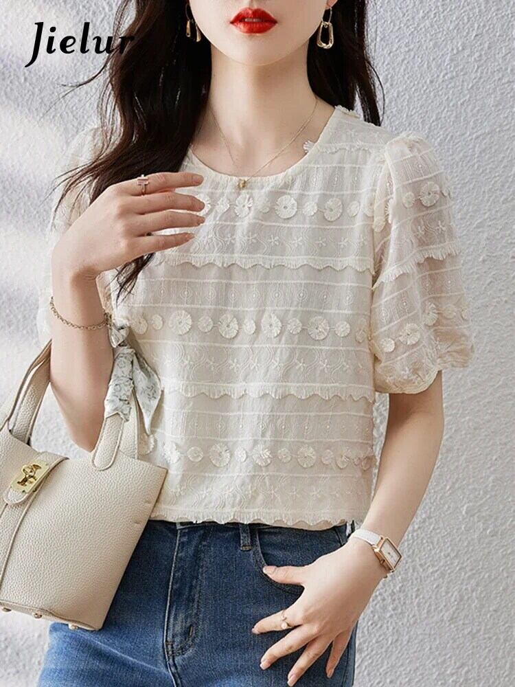 送料無料 Jielur 夏ソリッドカラーの女性ブラウス甘いブラウス女性アプリコット O ネックスリムトップ 大人ガーリー スウィート キュート カジュアル サマー 夏物 Oネック AE12188787846297381578