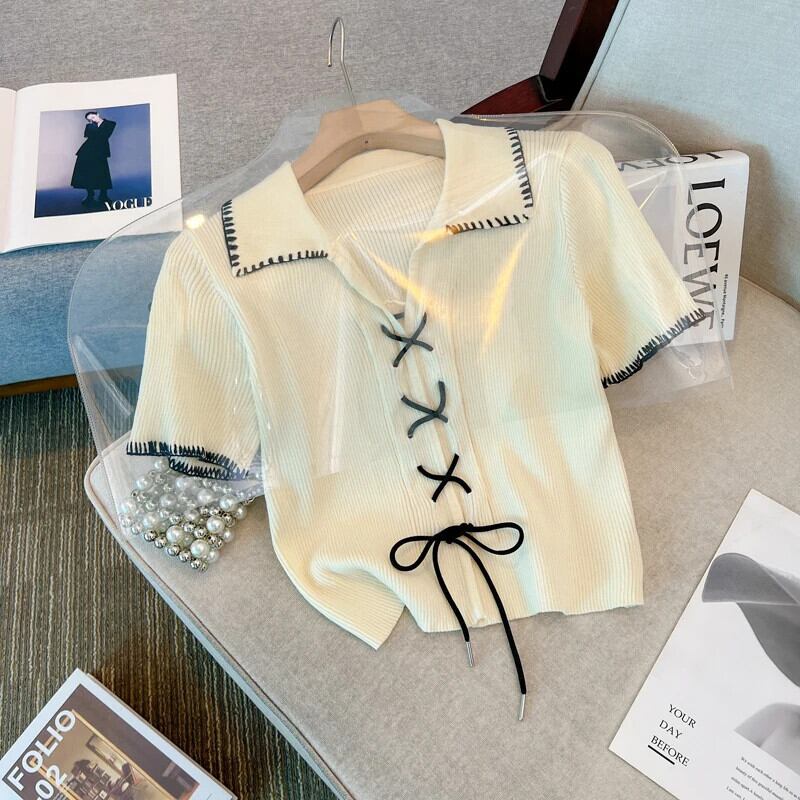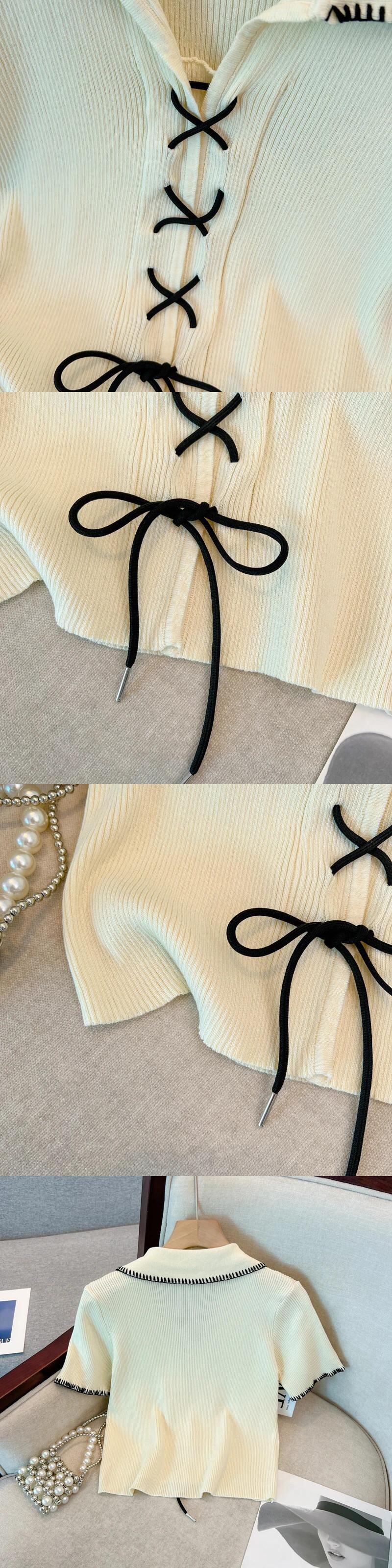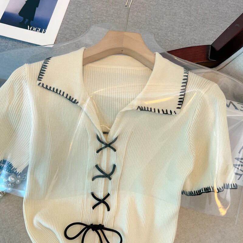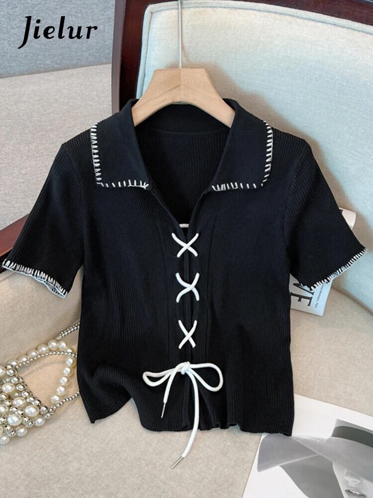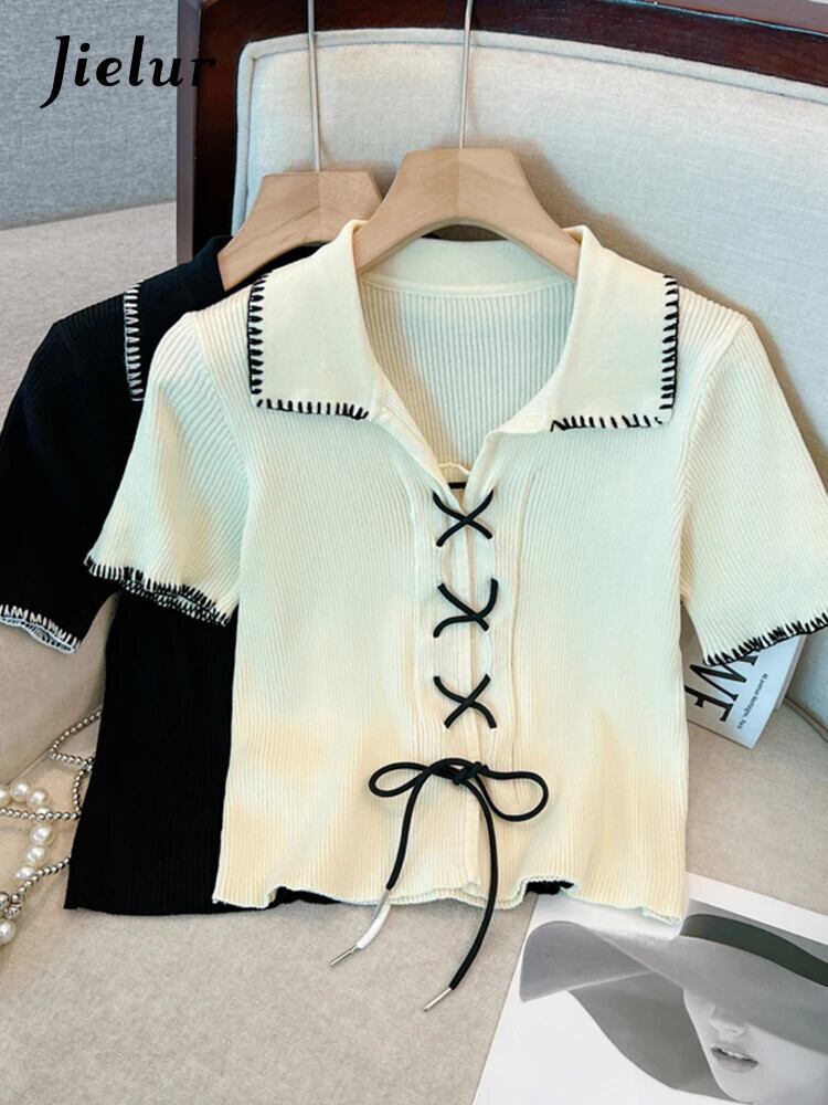送料無料 Jielur 夏コントラストカラースリム女性シャツ甘いシャツ女性アプリコットブラックレースアップポロネックトップ 大人ガーリー スウィート キュート カジュアル サマー 夏物 AE12188787826295228642
