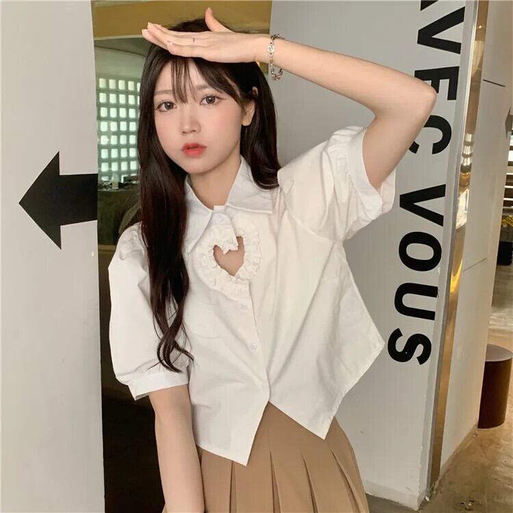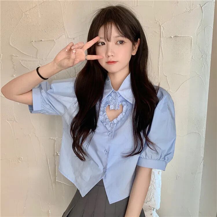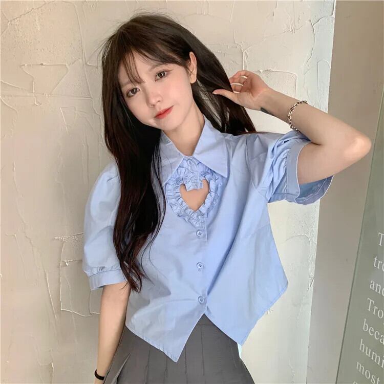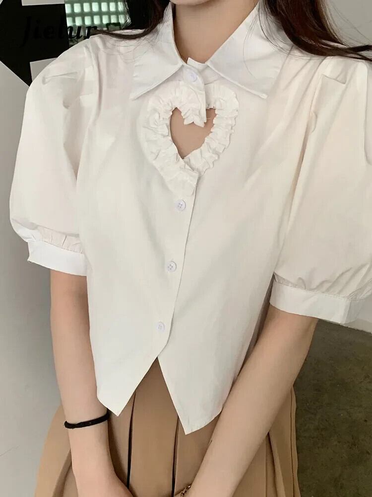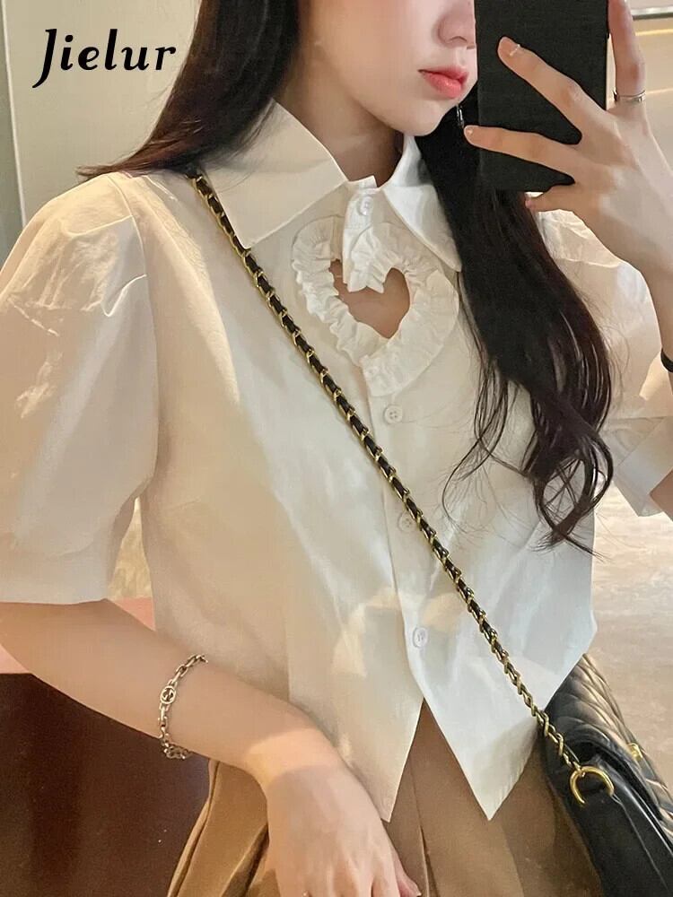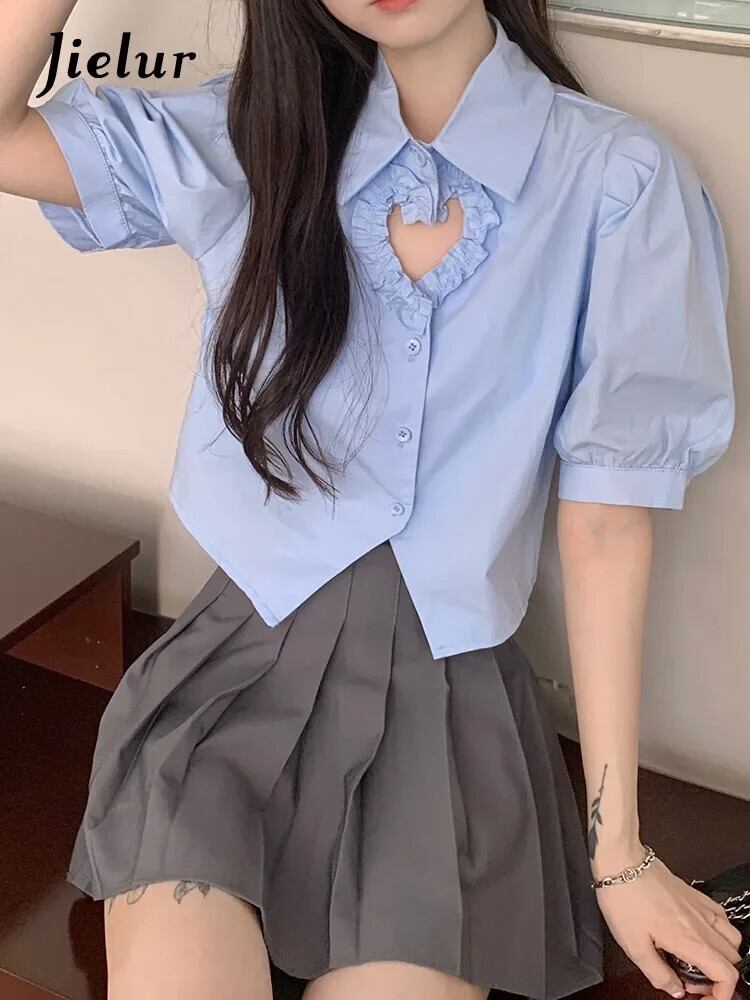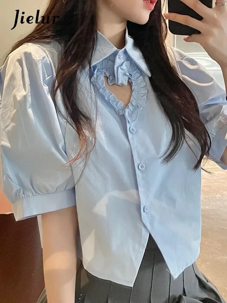 送料無料 Jielur 夏無地スリム女性シャツ甘いルーズ中空アウトシャツ女性白青シックなパフスリーブトップ ホワイト ブルー 大人ガーリー スウィート キュート カジュアル サマー 夏物 ソリッドカラー AE12188787871278337857