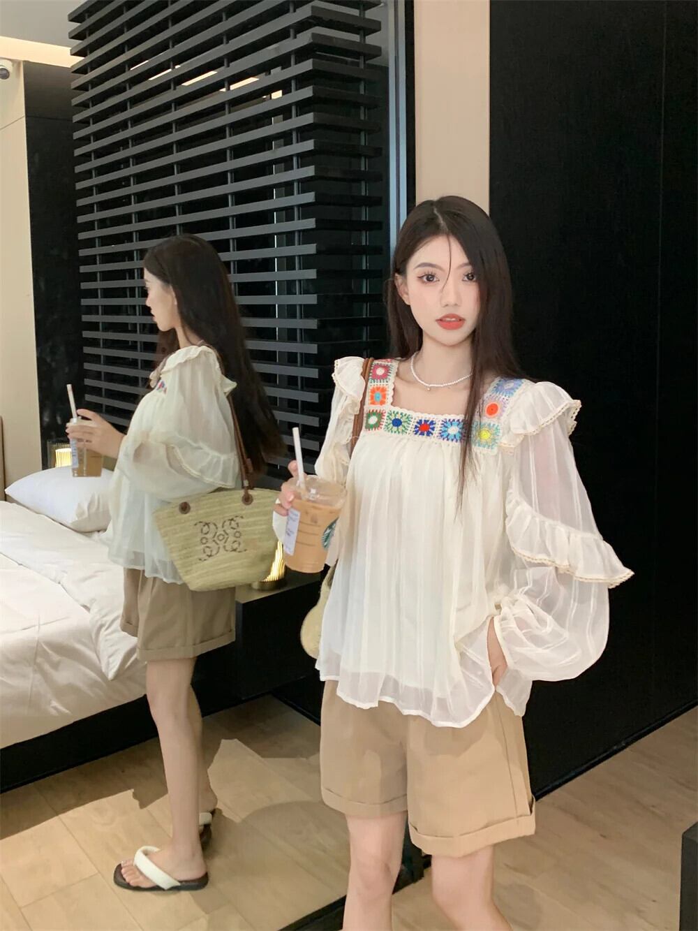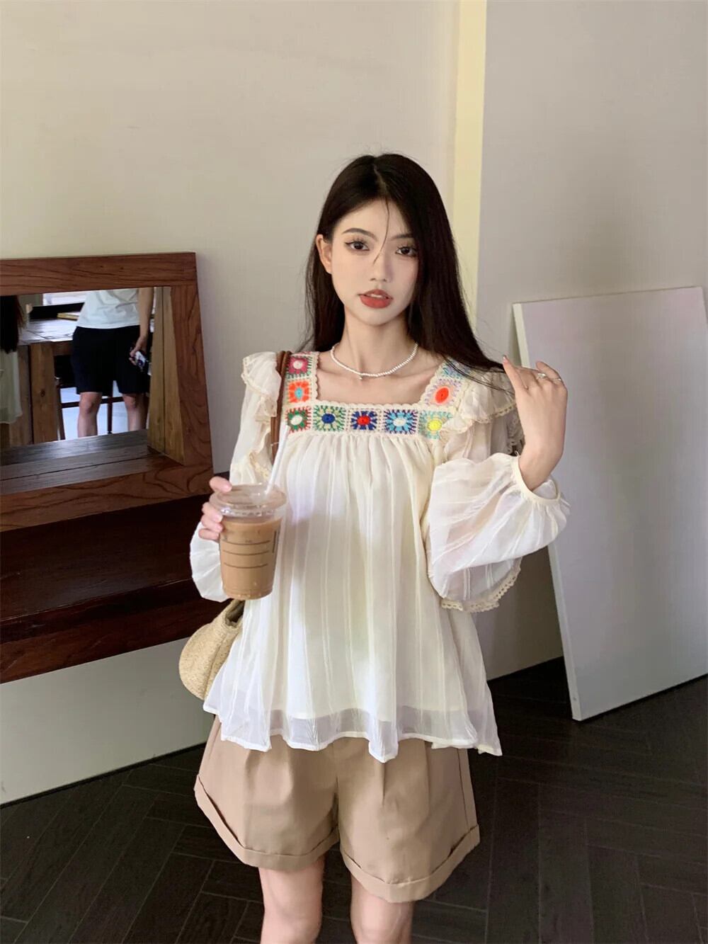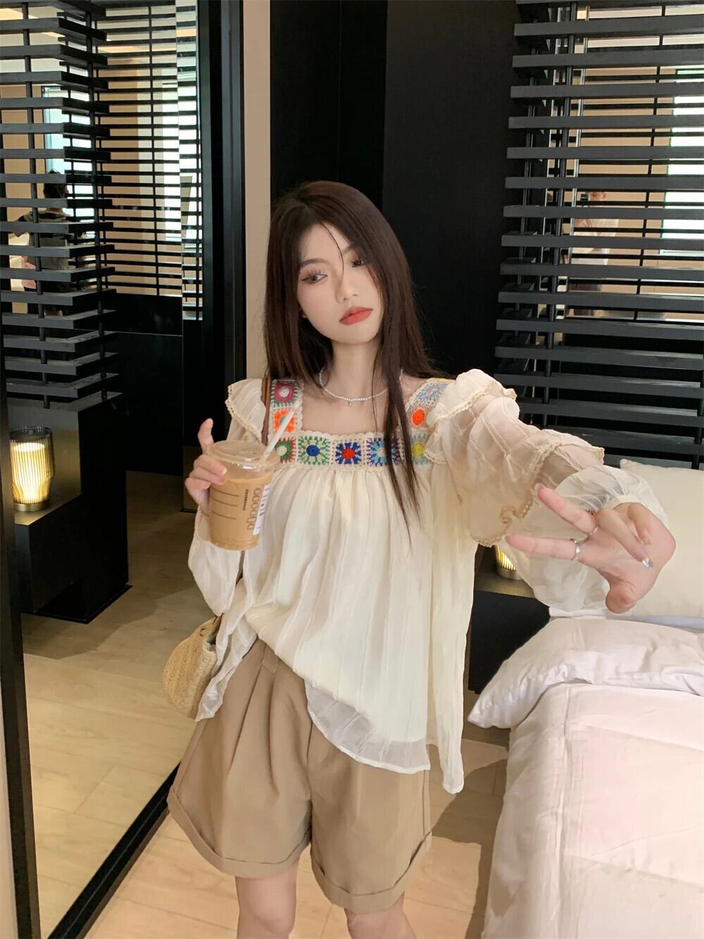 送料無料 Jielur ツーピース夏スリム女性ブラウスウエストスリム無地ショーツアプリコットスクエアネック長袖トップ ロング サマー 夏物 ブルマー ソリッドカラー スクウェア AE1218878785402351482