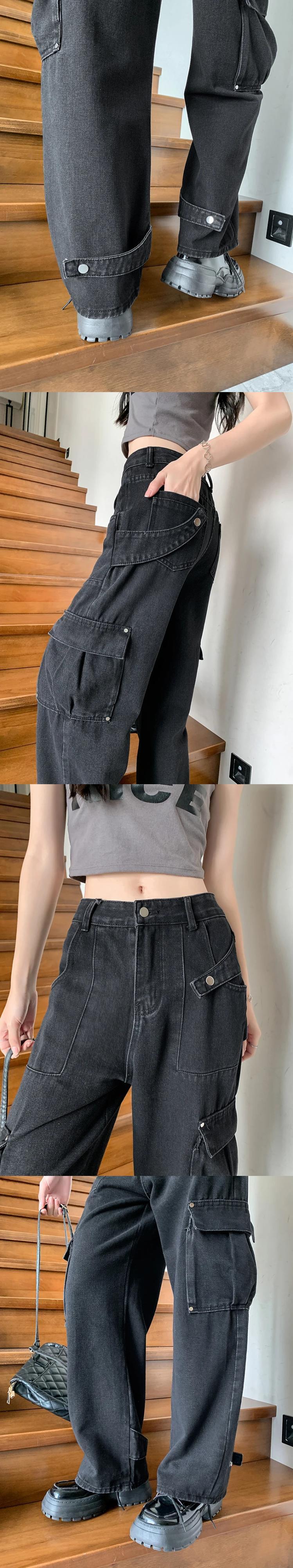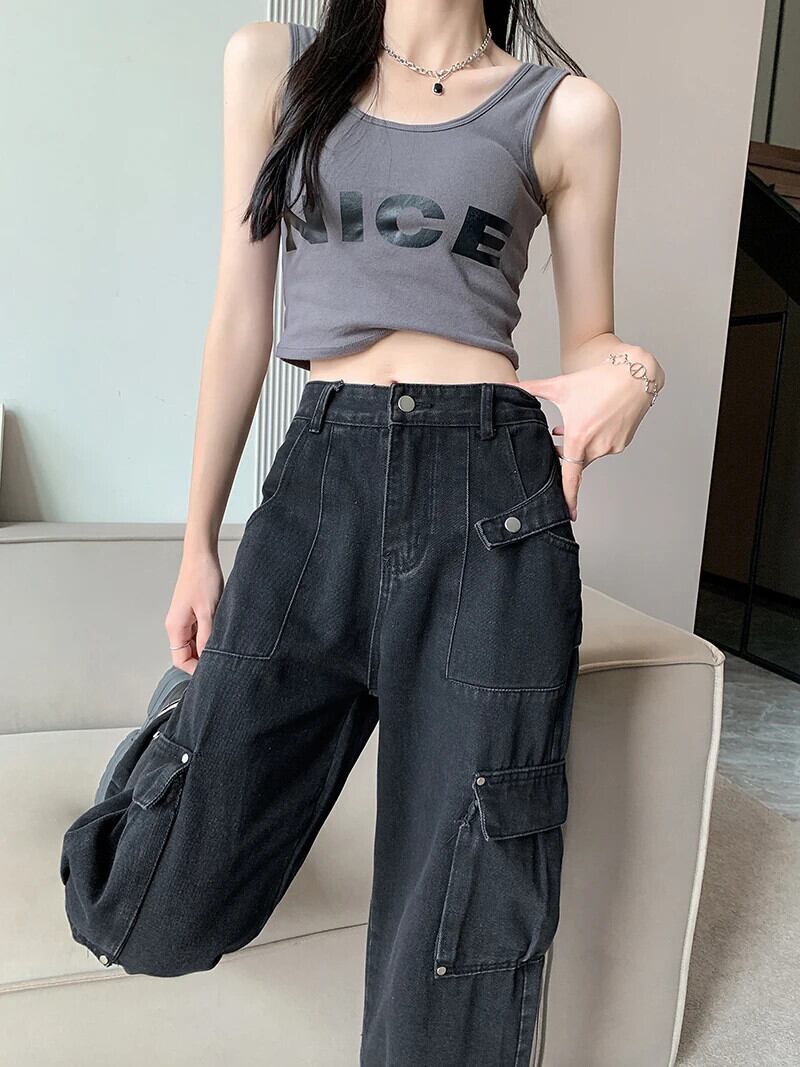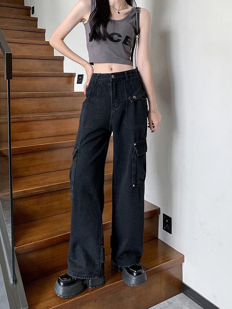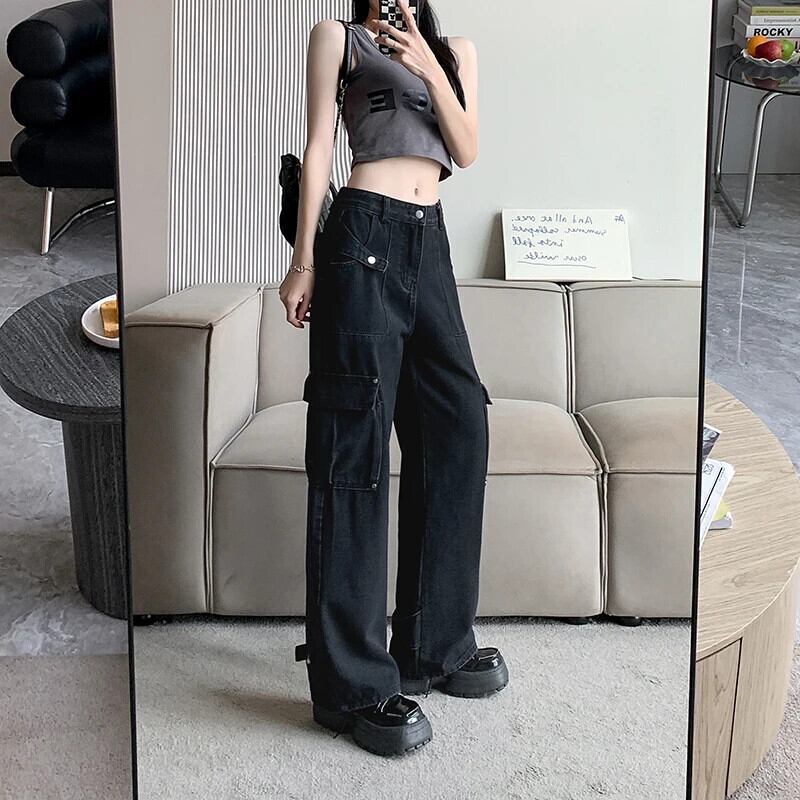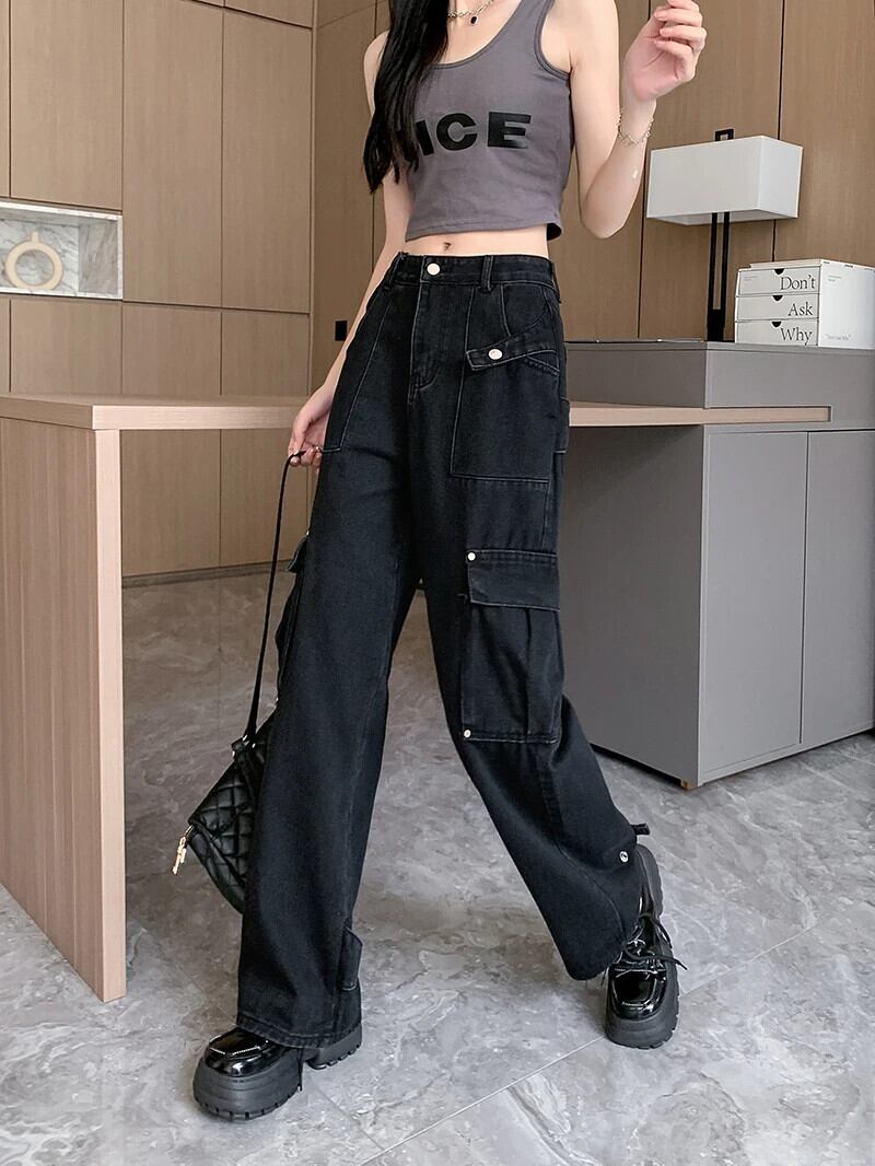 送料無料 Jielur ワイドレッグカーゴジーンズ女性レトロ黒ポケットジーンズストレートデニムカーゴパンツストリートルーズウエストジーンズ ブラック ワイドパンツ AE12188787839061643721