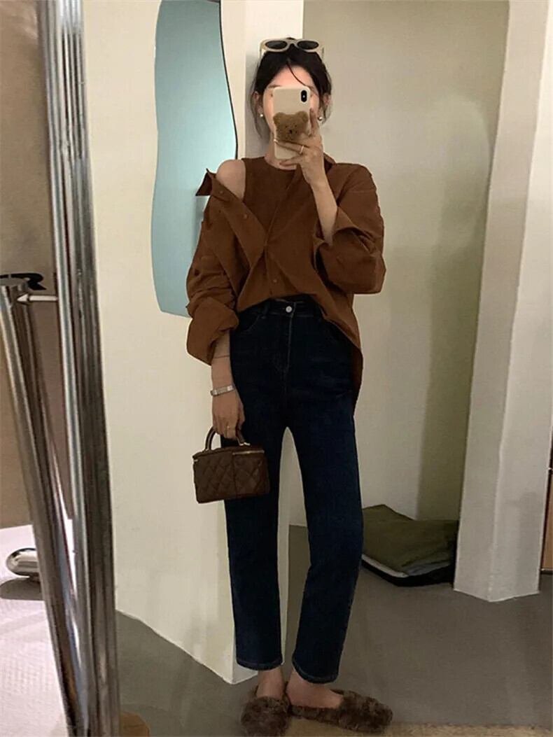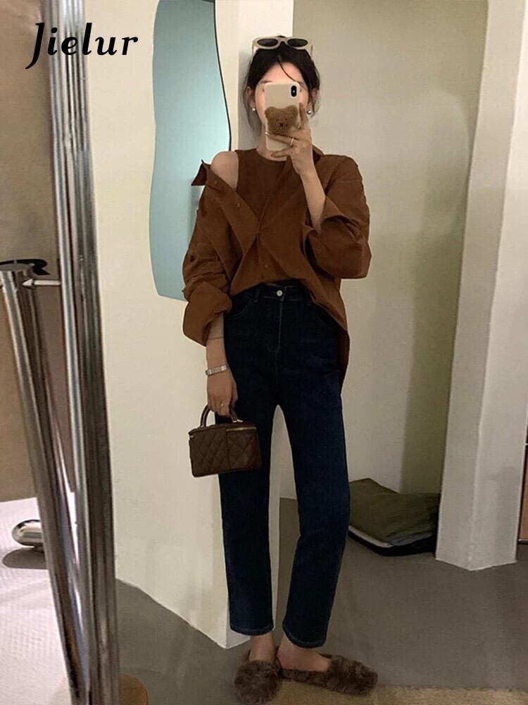 送料無料 Jielur 偽 2 秋無地女性シャツスリムシャツ女性シンプルなベーシックシックな長袖トップ ロング オータム 秋物 ソリッドカラー AE12188787832789066093