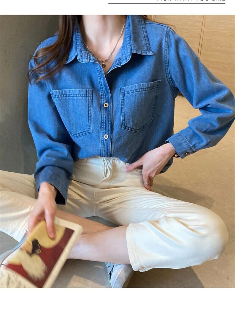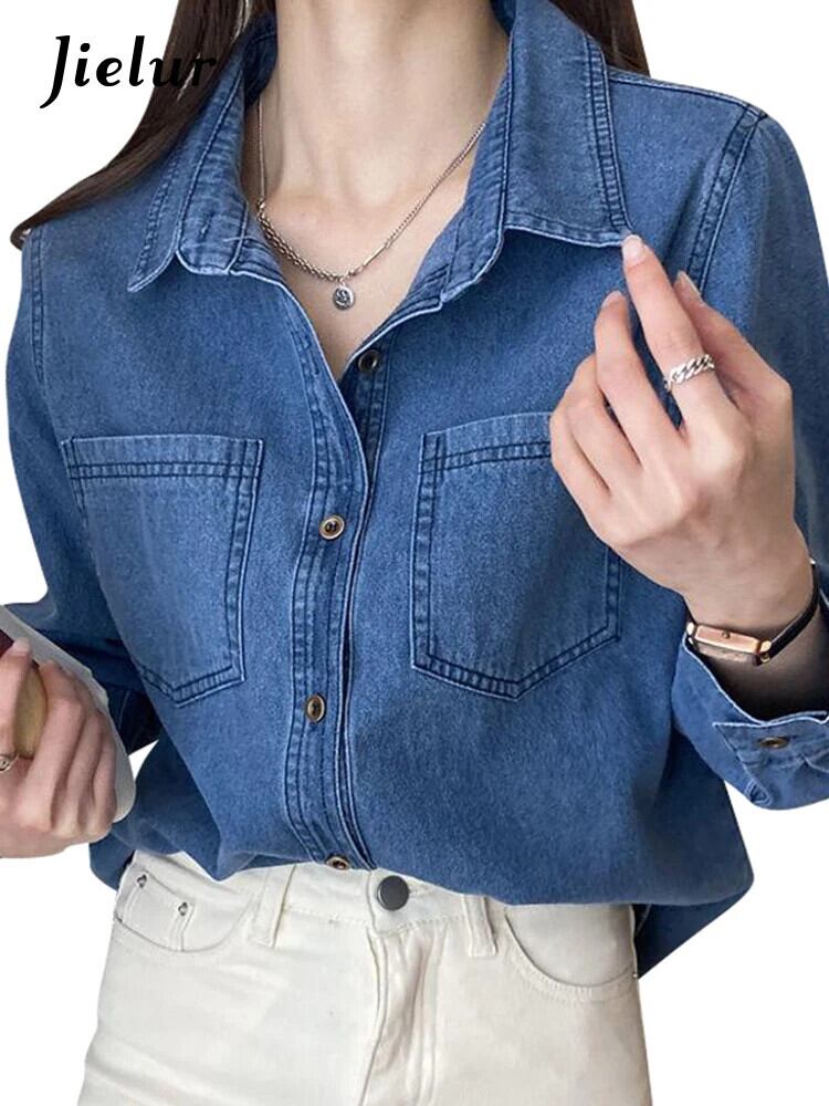 送料無料 Jielur 春レトロスリム長袖シックな女性シャツフレンチデニムシャツ女性シンプルなベーシックブルートップ ロング スプリング 春物 AE1218878789534728033