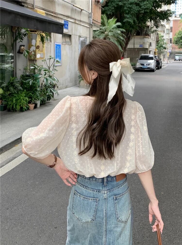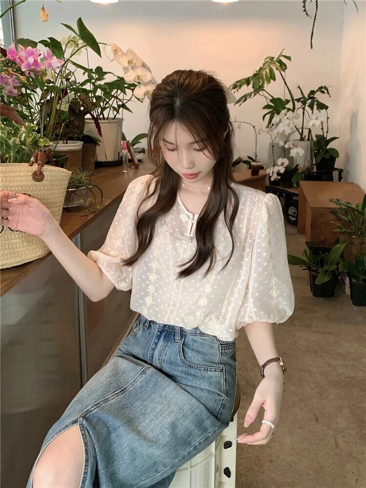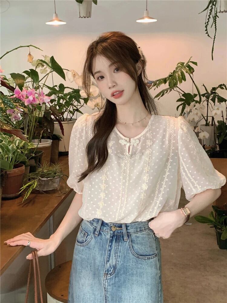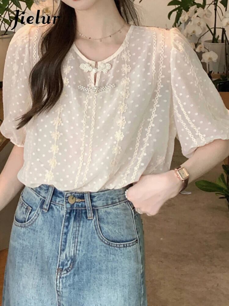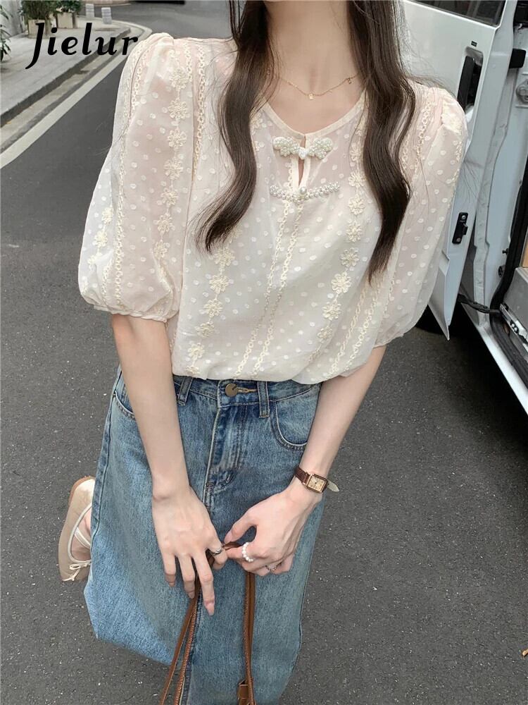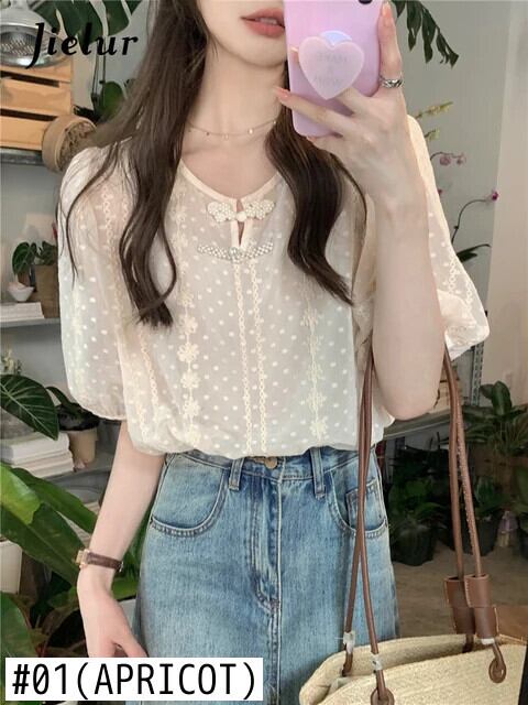 送料無料 Jielur 夏緩い女性ブラウススリム甘いチクリーブラウス女性アプリコットフレンチパフスリーブトップ 大人ガーリー スウィート キュート カジュアル サマー 夏物 AE12188787828754558701