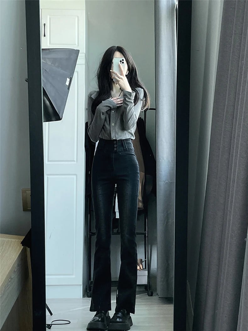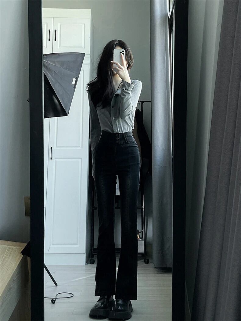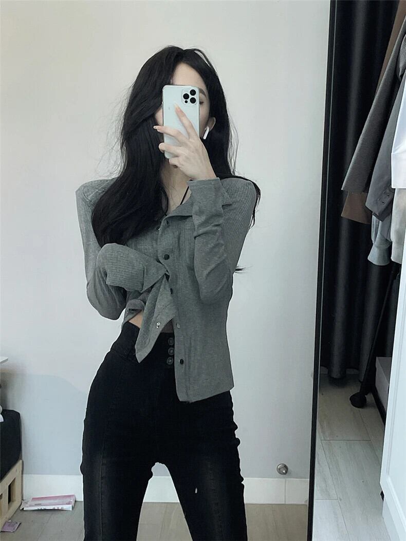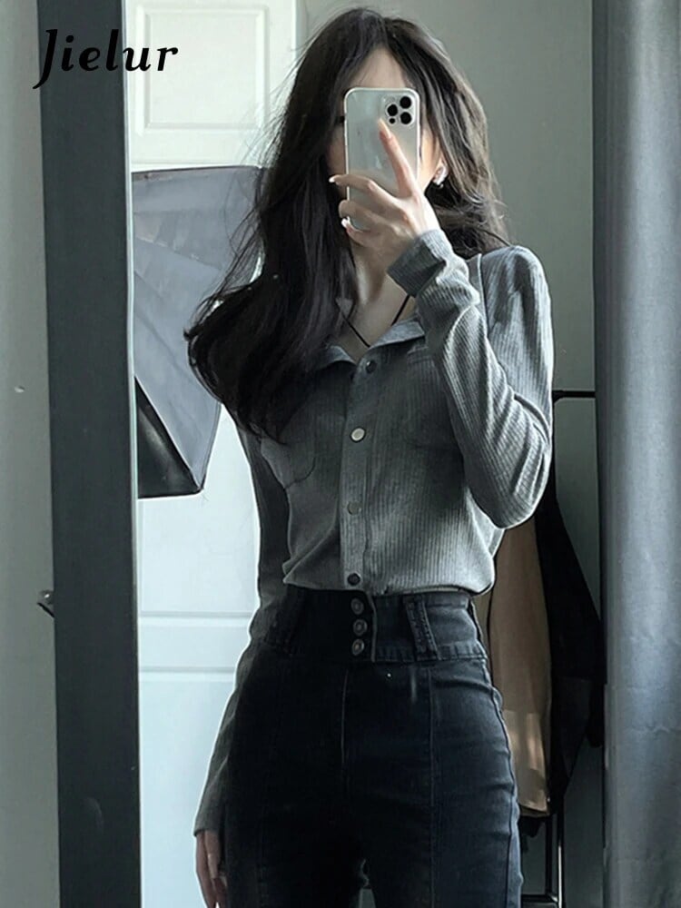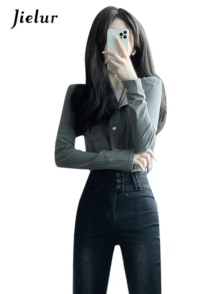 送料無料 Jielur 春ルーズ Chicly 女性シャツストリートストライプ女性シャツグレーシンプルなベーシック長袖トップ ロング スプリング 春物 AE12188787821204815464