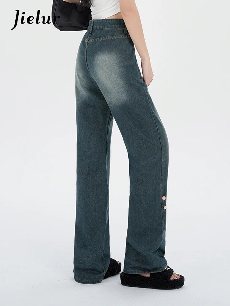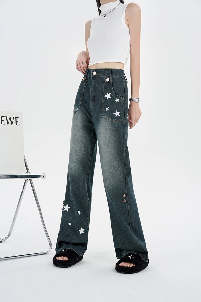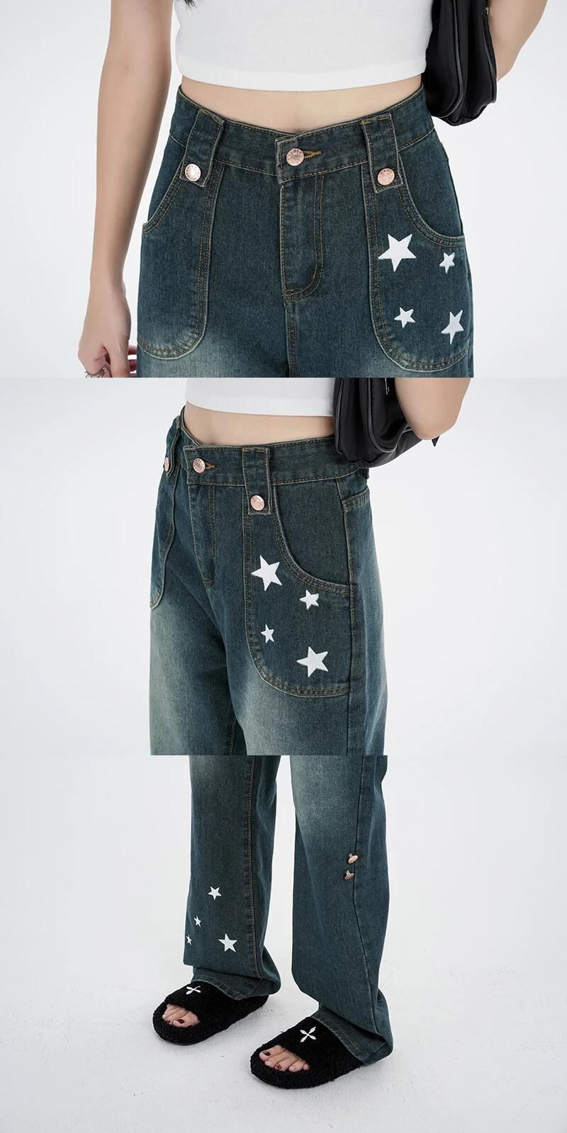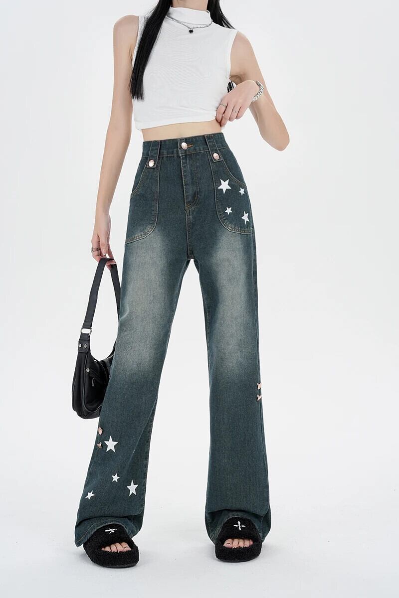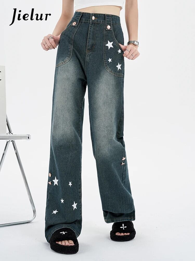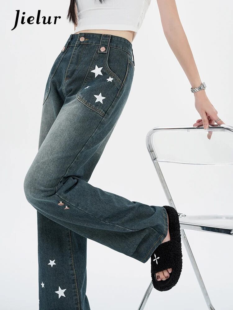 送料無料 Jielur アメリカン プリント ルーズ ジーンズ ストリート ベーシック シンプル ウエスト スリム シック ポケット ストレート レディース ジーンズ AE12188787896093957055