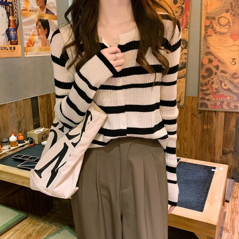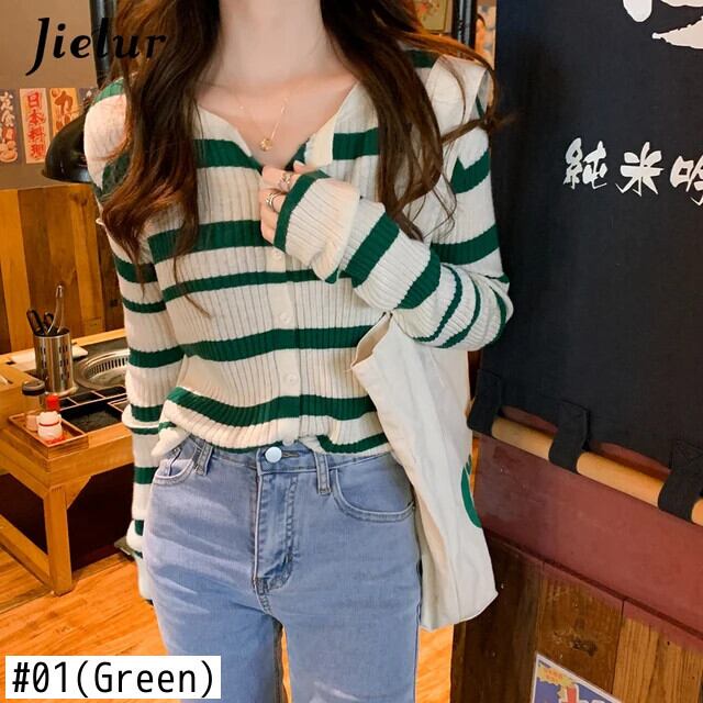 送料無料 Jielur 秋ショートレディースセータースペルカラーブラックアプリコットストライプカーディガンシックなスリム長袖ニットウェア ロング オータム 秋物 AE12188787876699684447