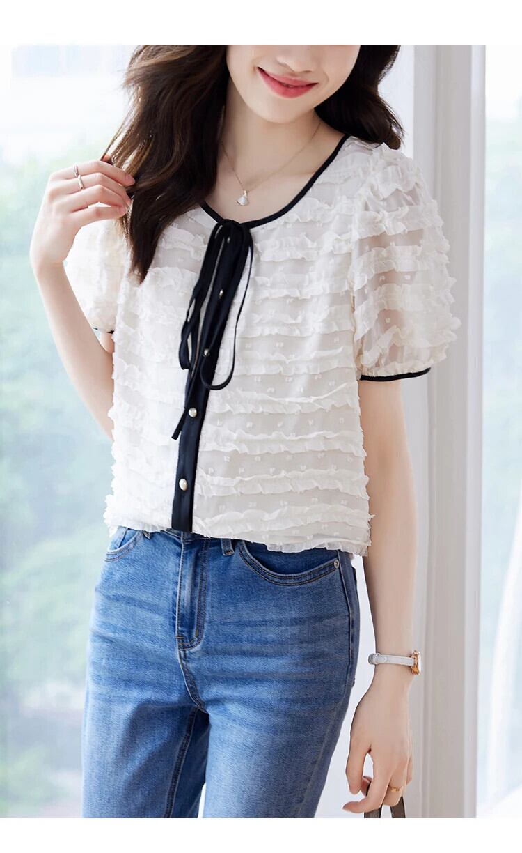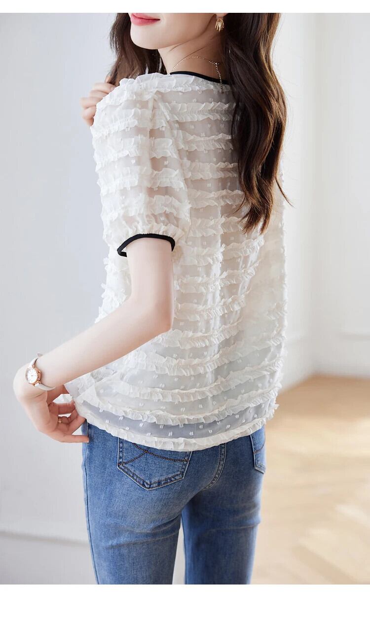 送料無料 Jielur 夏フレンチ甘いコントラストカラーの女性シャツレースシャツ女性白ルースシフォントップ ホワイト 大人ガーリー スウィート キュート カジュアル サマー 夏物 AE12188787881986910457