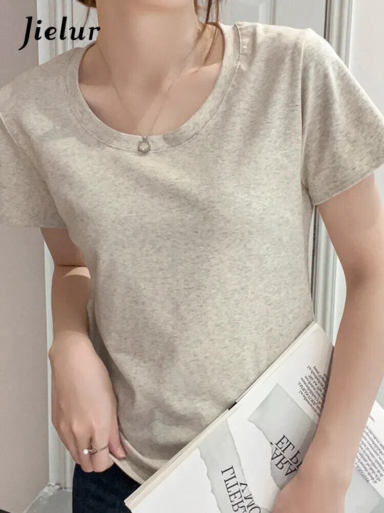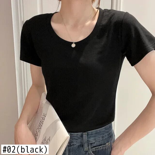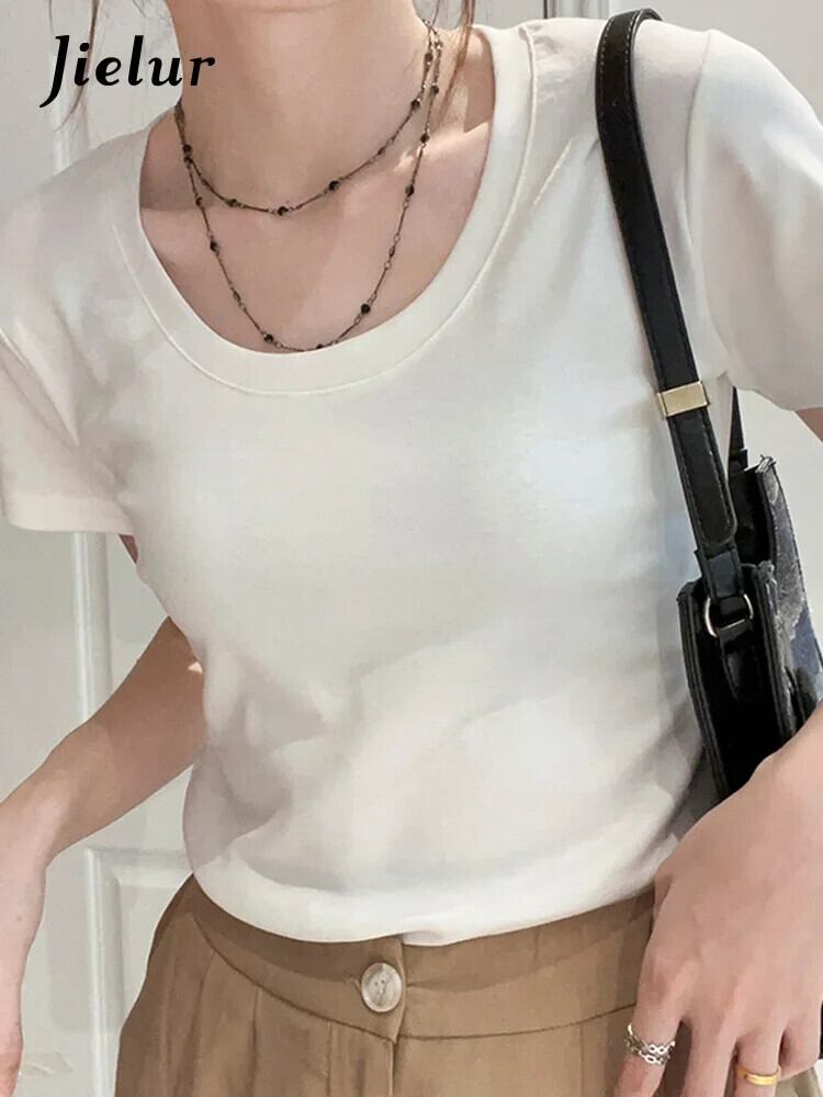送料無料 Jielur 夏アメリカの女性の Tシャツ綿スリムソリッドカラー Tシャツベーシックシンプルな白黒トップ女性 ホワイト ブラック コットン サマー 夏物 AE1218878785470470380