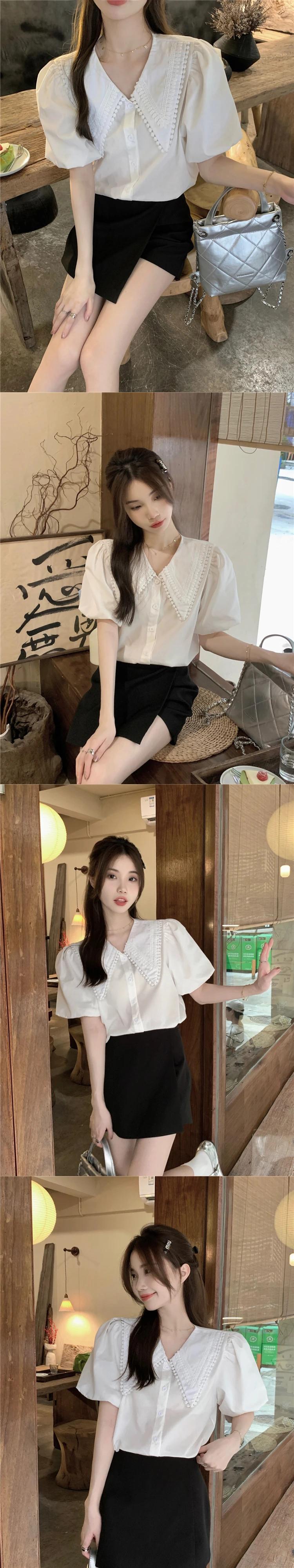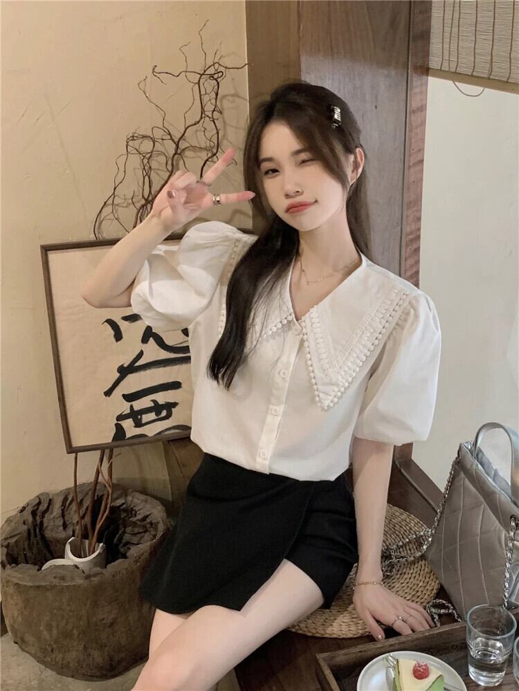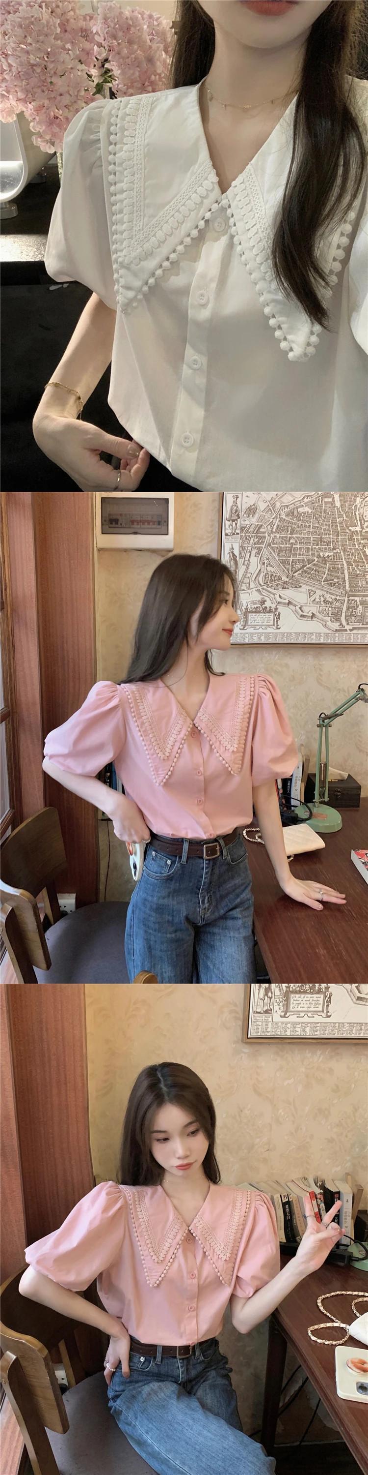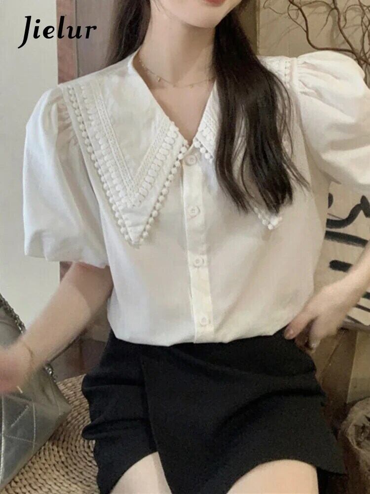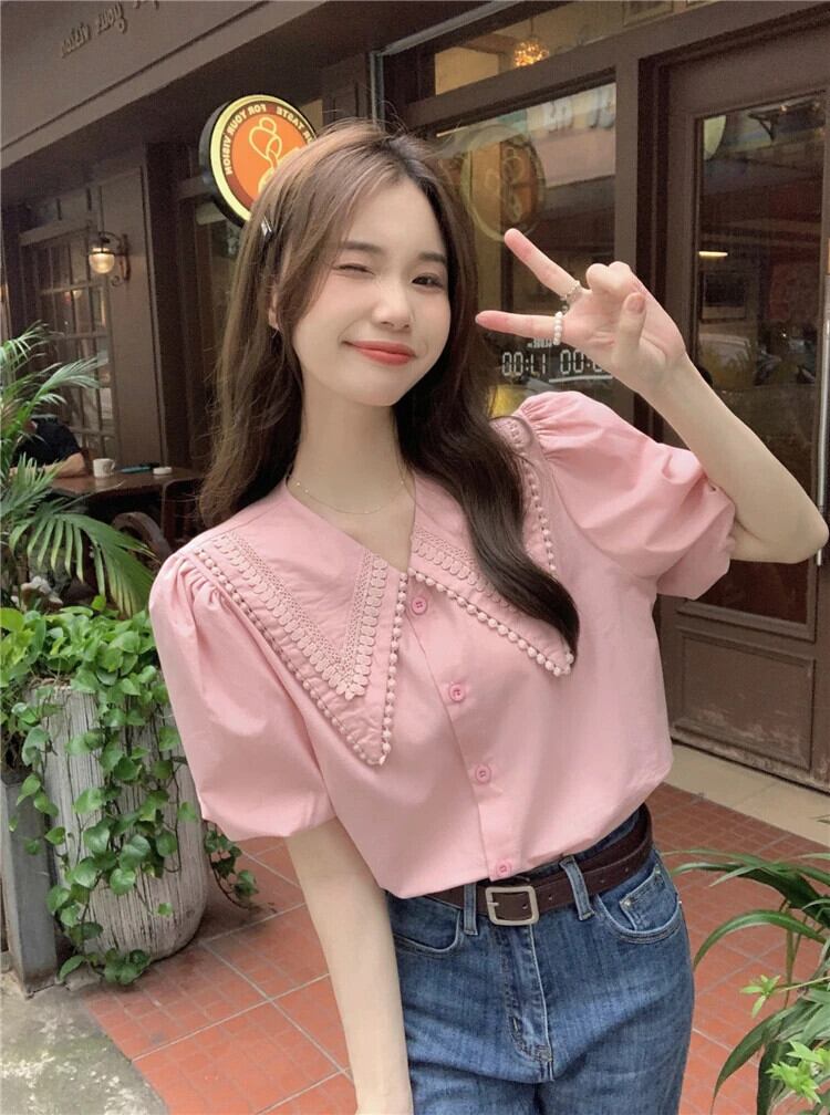 送料無料 Jielur 夏の女性のシャツ無地スリム甘いシャツ女性ピンク白レースルーズ Chicly トップ ホワイト 大人ガーリー スウィート キュート カジュアル サマー 夏物 ソリッドカラー AE12188787833488254229