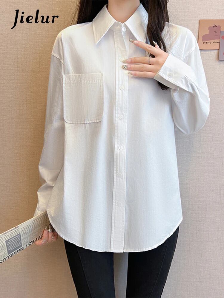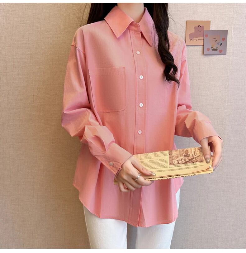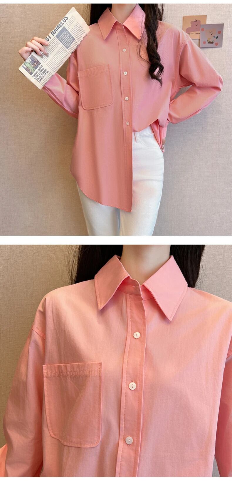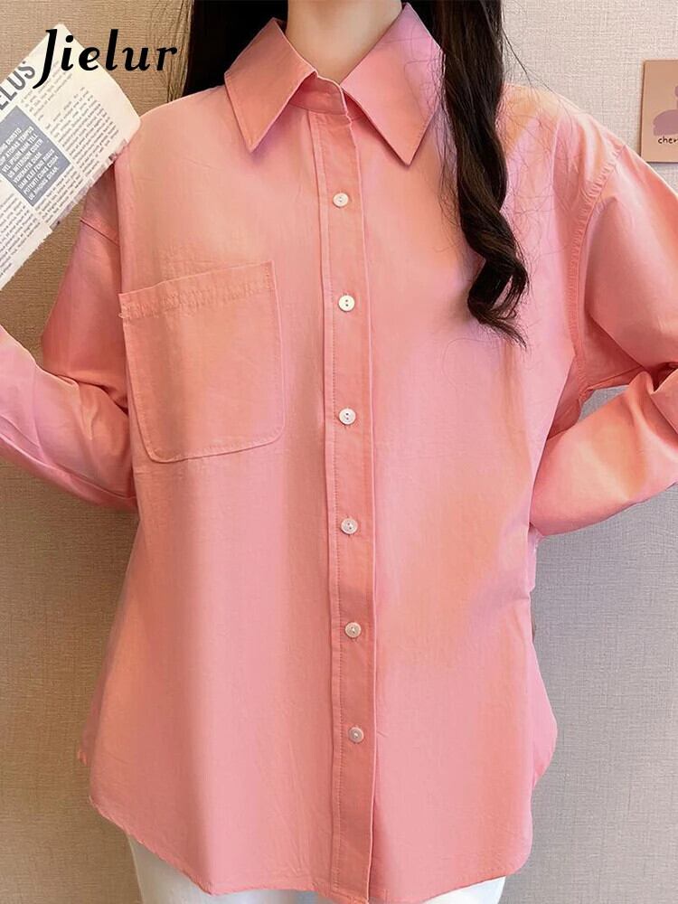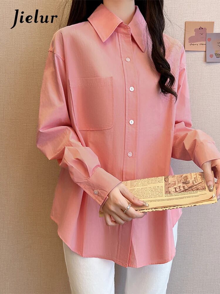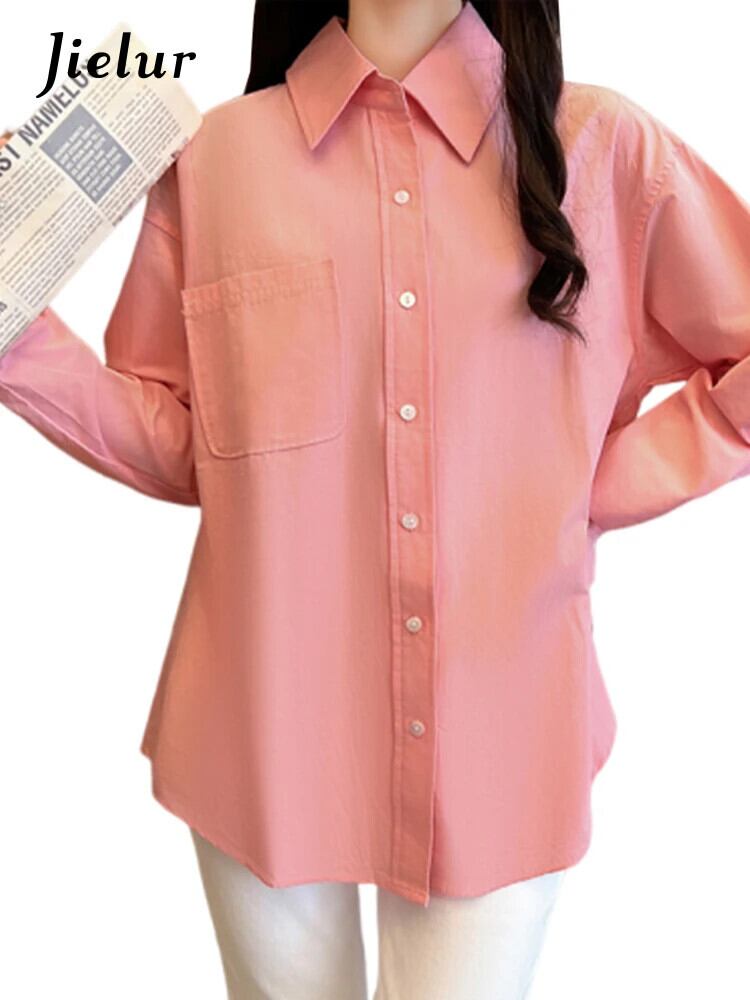 送料無料 Jielur 秋フレンチソリッドカラーの女性シャツスリムシンプルなベーシック女性シャツピンクホワイトルーズストリートトップ オータム 秋物 AE1218878782814636037