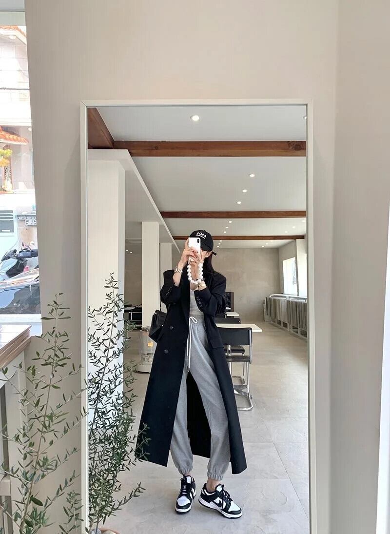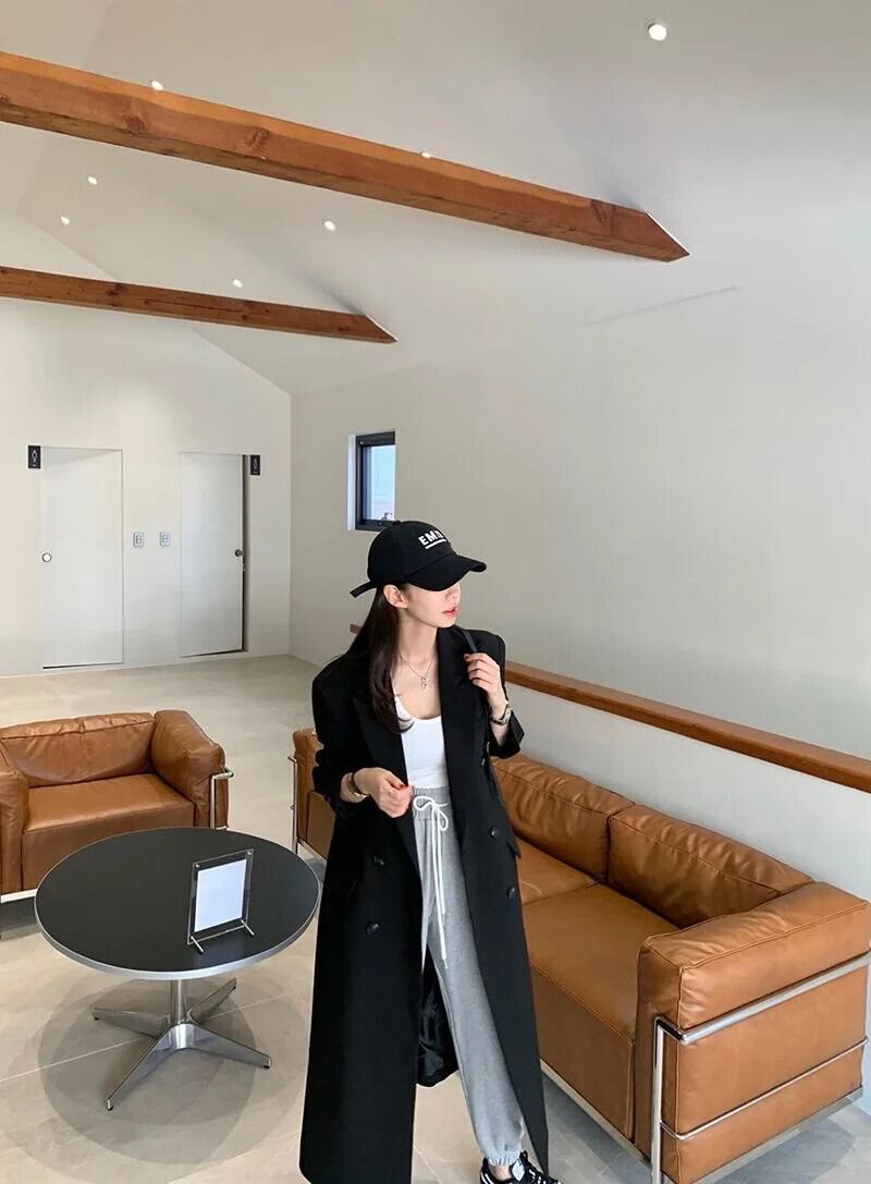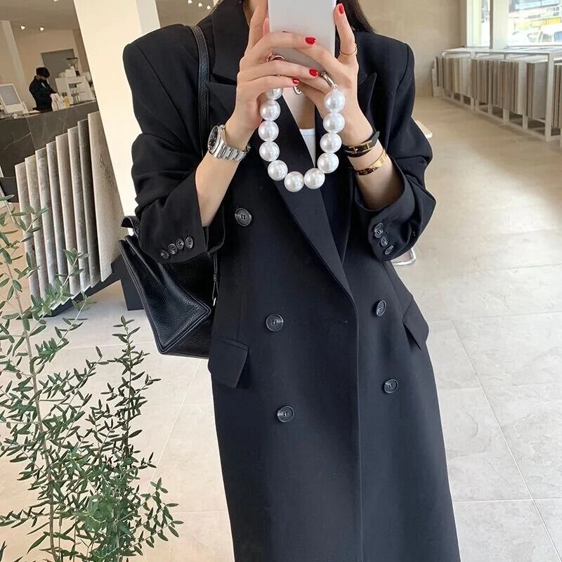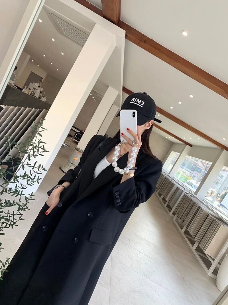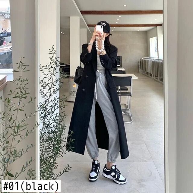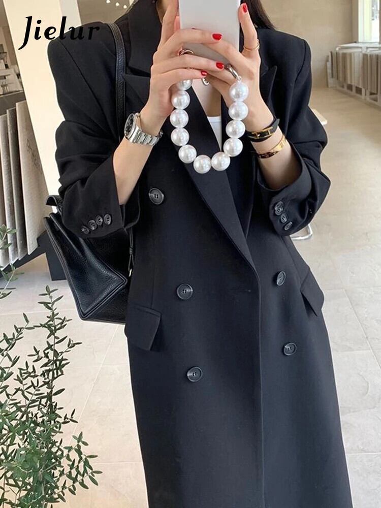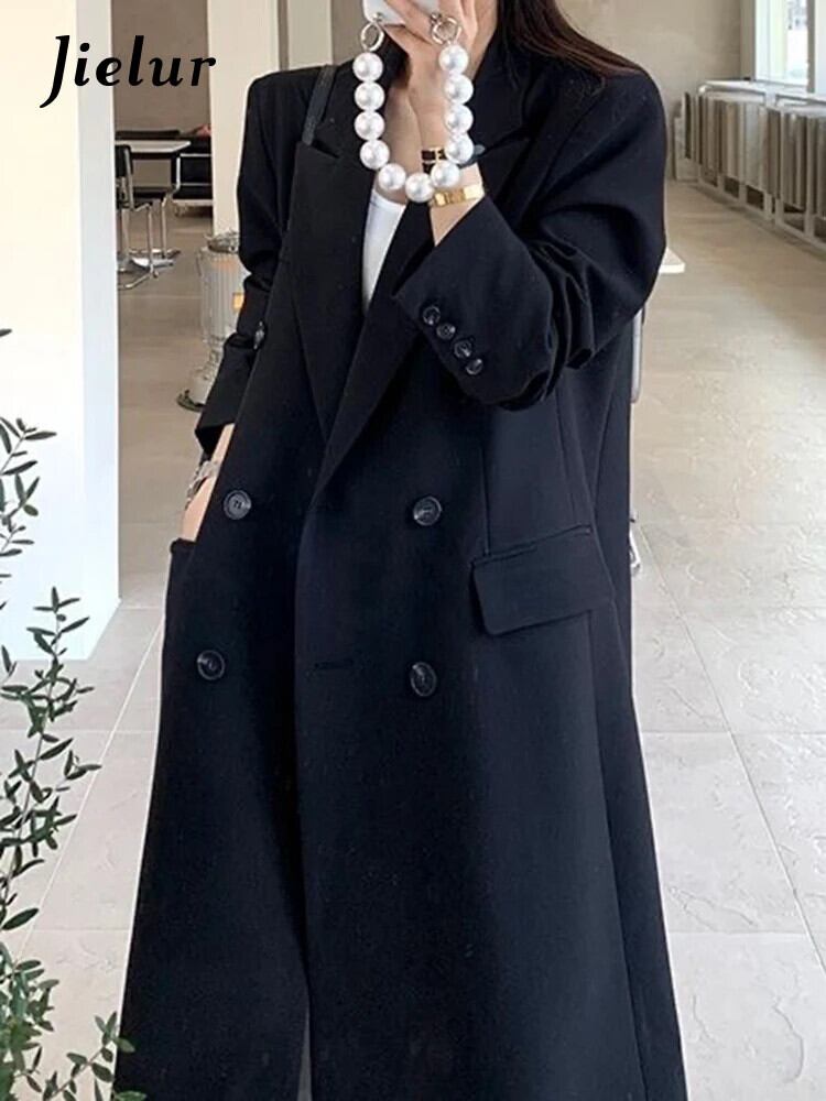 送料無料 Jielur 黒ルーズスリムトレンチ秋のベーシックシンプルなオフィスレディダブルブレストソリッドカラーの女性のトレンチ ブラック オータム 秋物 会社 学校 通勤や通学にも AE12188787897900149587