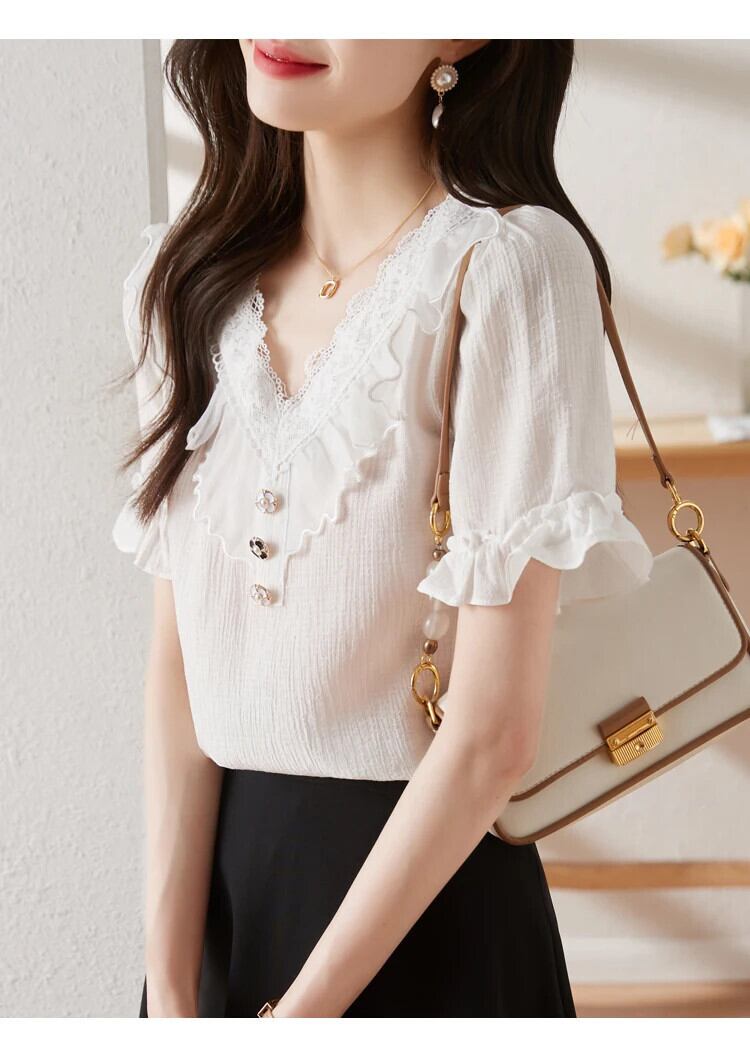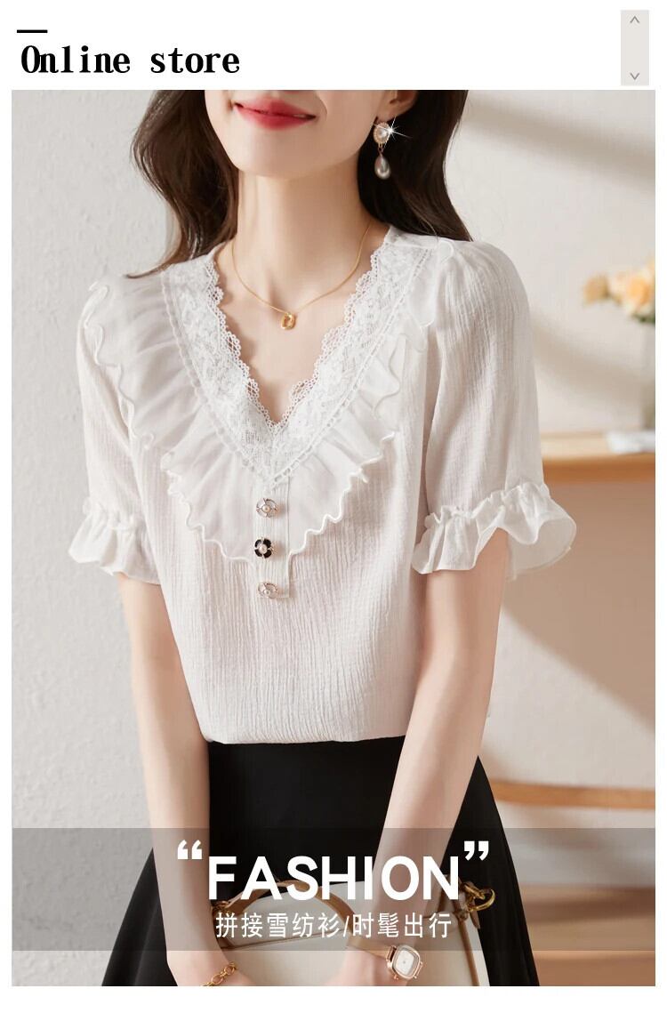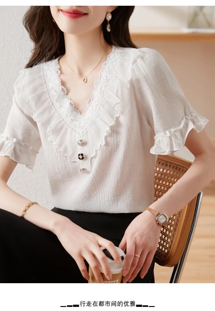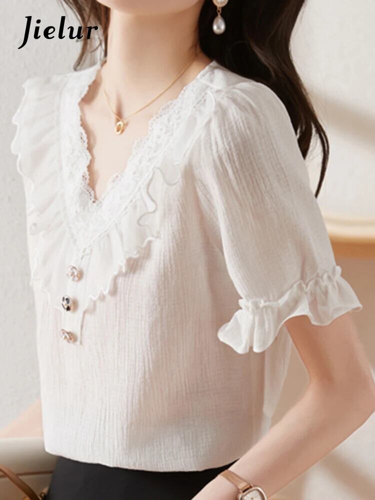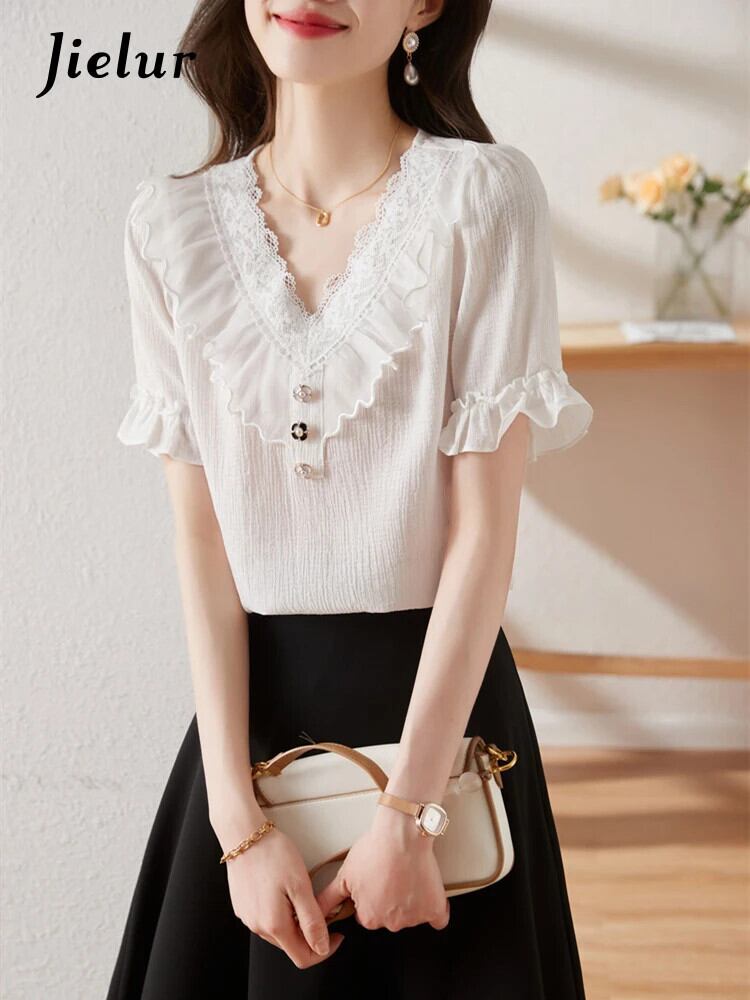 送料無料 Jielur 夏の女性ブラウス無地レース甘いブラウス女性シックな白 V ネックシフォントップ ホワイト 大人ガーリー スウィート キュート カジュアル サマー 夏物 Vネック ソリッドカラー AE12188787848019760283