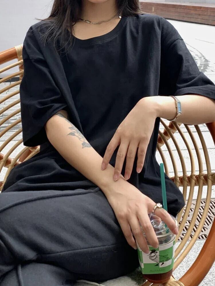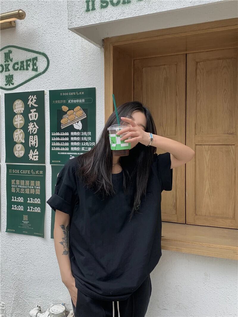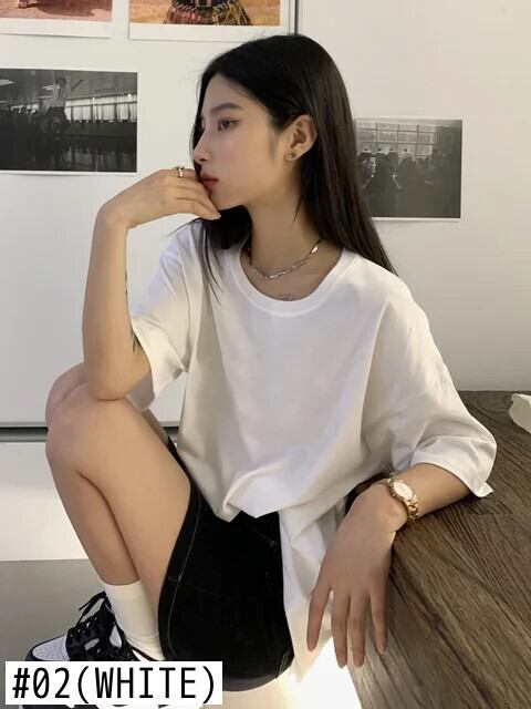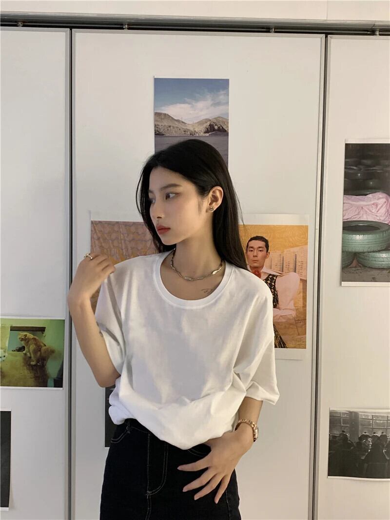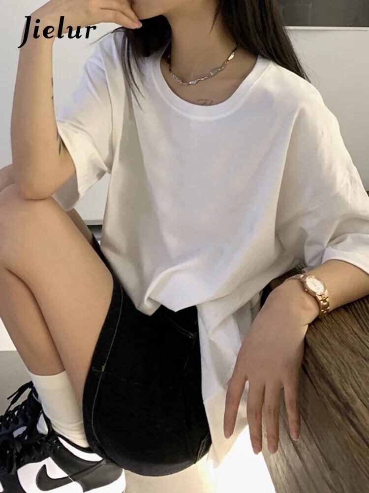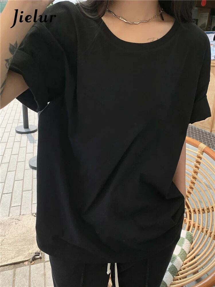 送料無料 Jielur 夏のベーシックレディース Tシャツルーズシンプルなソリッドカラー Tシャツ白黒 O ネック女性トップ ホワイト ブラック サマー 夏物 Oネック AE12188787816255986005