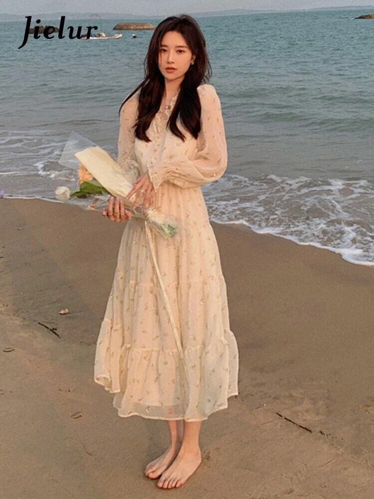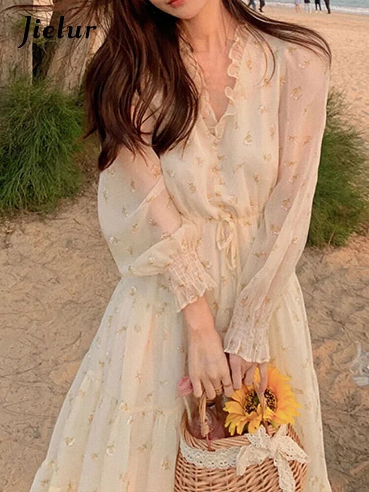 送料無料 Jielur V ネックスウィートドレス女性長袖シフォン花柄ドレスレディパーティービーチドレス s スタイル夏シック ロング 大人ガーリー キュート カジュアル サマー 夏物 Vネック AE1218878787855289215